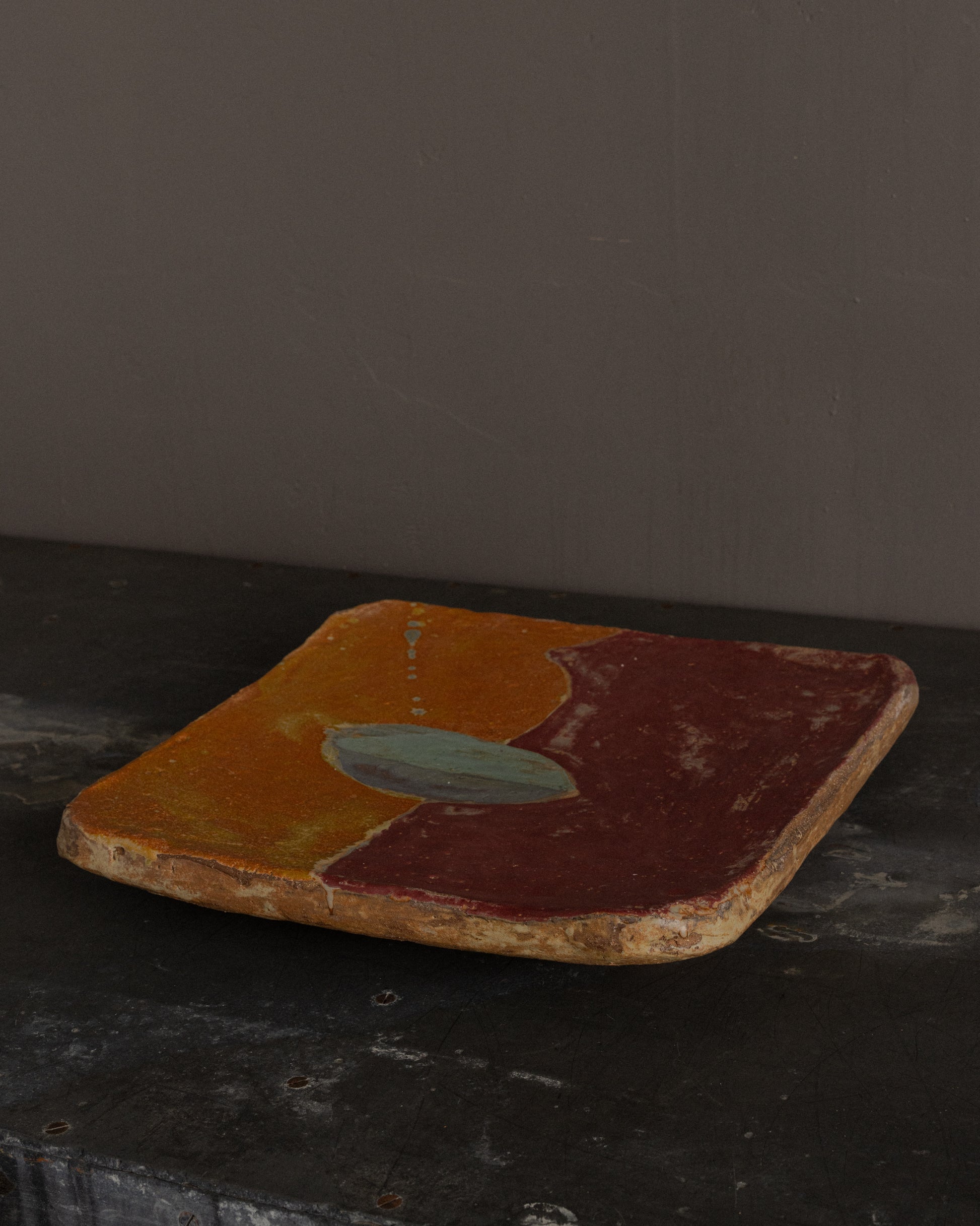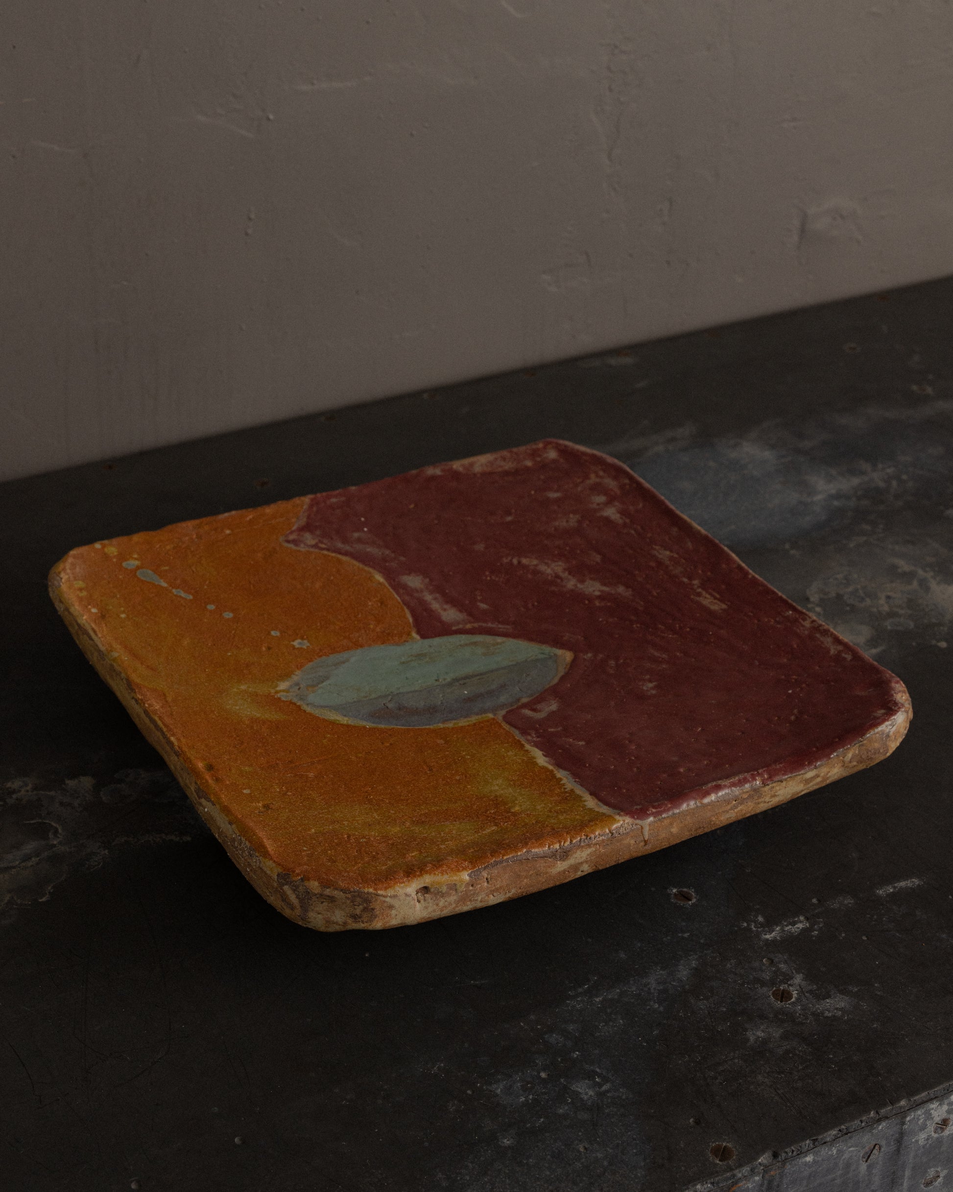 This contemporary square ceramic tile by Jody Baral features a bold, painterly composition of layered glazes in deep plum, warm terracotta, ochre, and soft blue-gray. At the center, an oval-shaped blue-gray form anchors the composition, creating a quiet focal point amid the saturated fields of color.