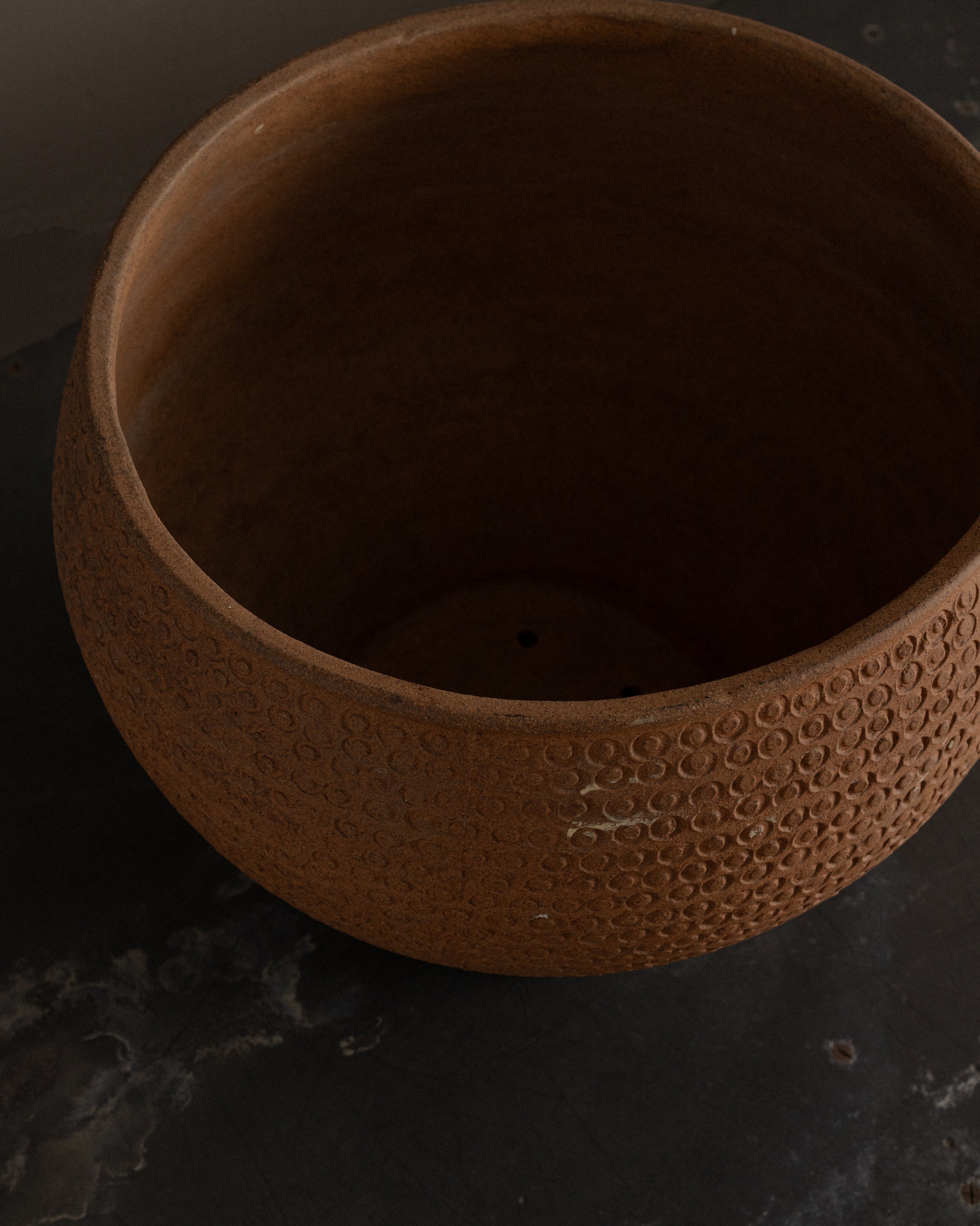 1960's sculptural ceramic planter produced by Architectural Pottery, USA, featuring an allover circle motif impressed in low relief across the surface. The tightly repeated circular pattern creates a rich tactile texture and a subtle play of light and shadow that enhances the rounded, bowl-like form.