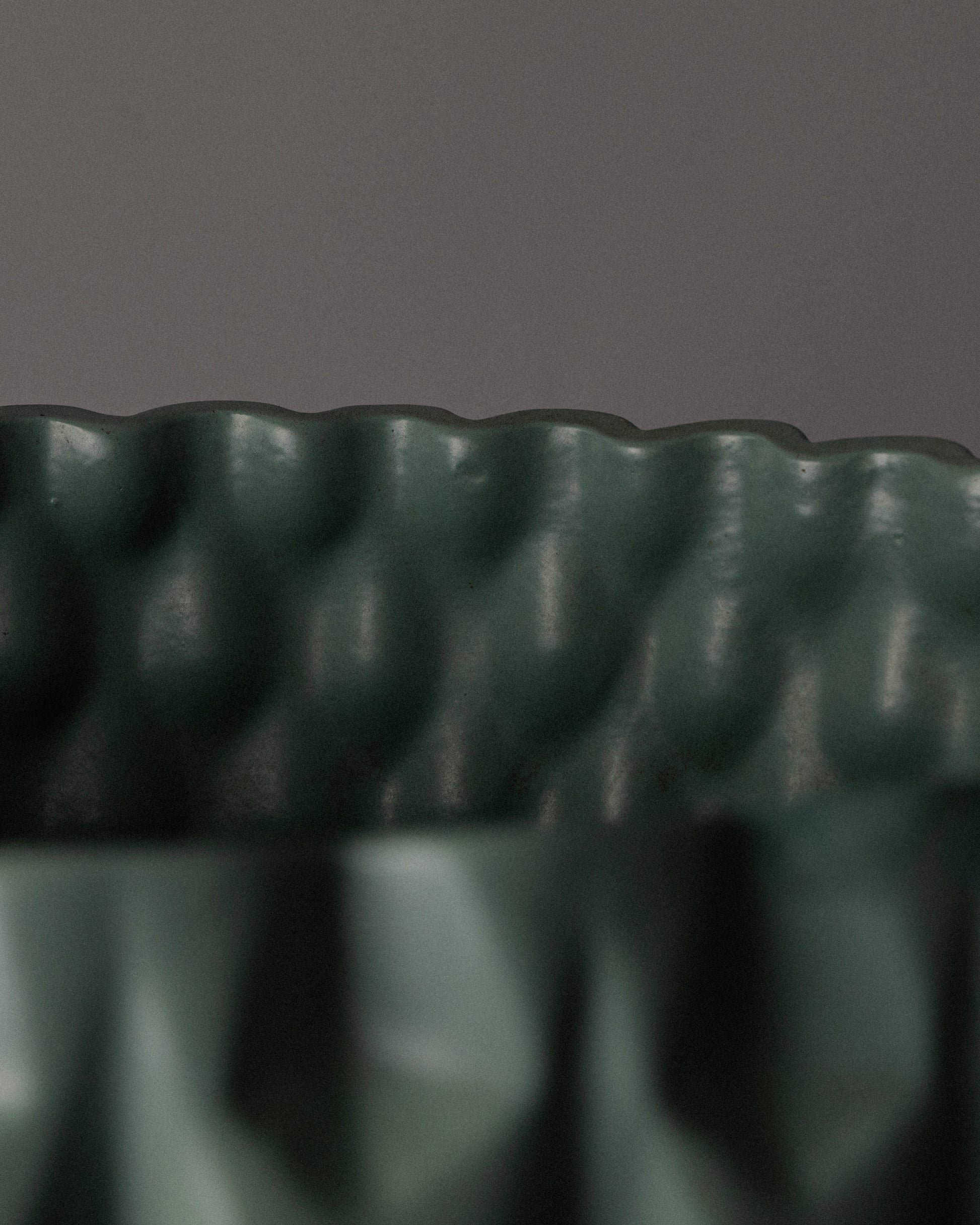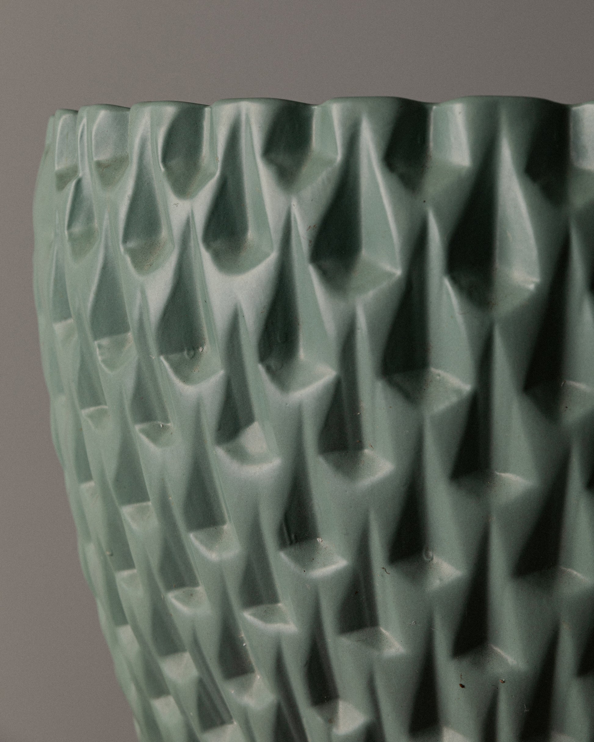 This Model P-1 "Phoenix" Planter by David Cressey, designed for the Architectural Pottery Pro/Artisan Collection in the 1960s, represents a rare and striking example of mid-century modern ceramic design. The glazed turquoise finish is a unique and highly sought-after variation, adding a soft yet vibrant hue that complements the sculptural form. The textured surface and the rare turquoise glaze create a stunning visual interplay of light and shadow, giving this piece a dynamic presence in any space.