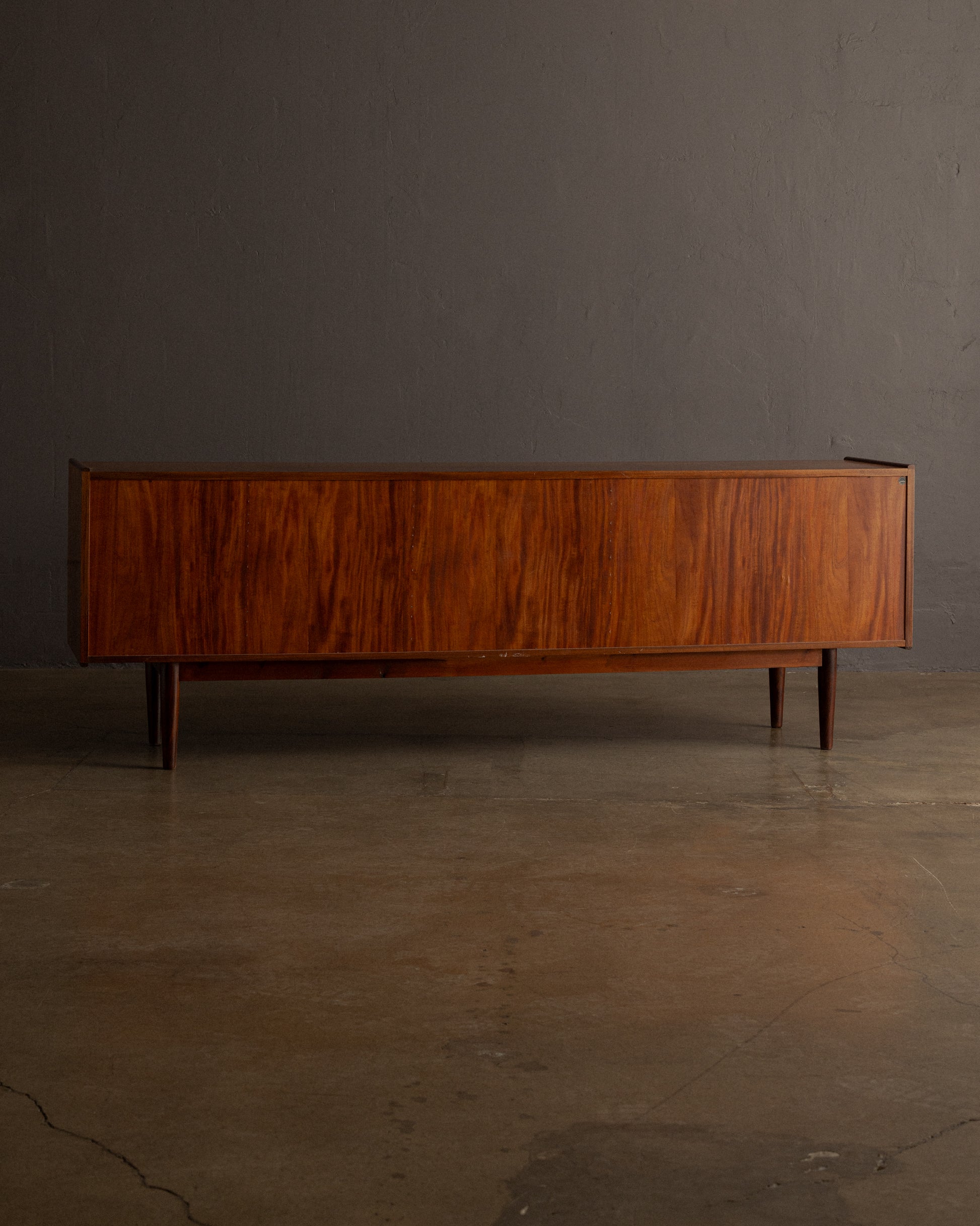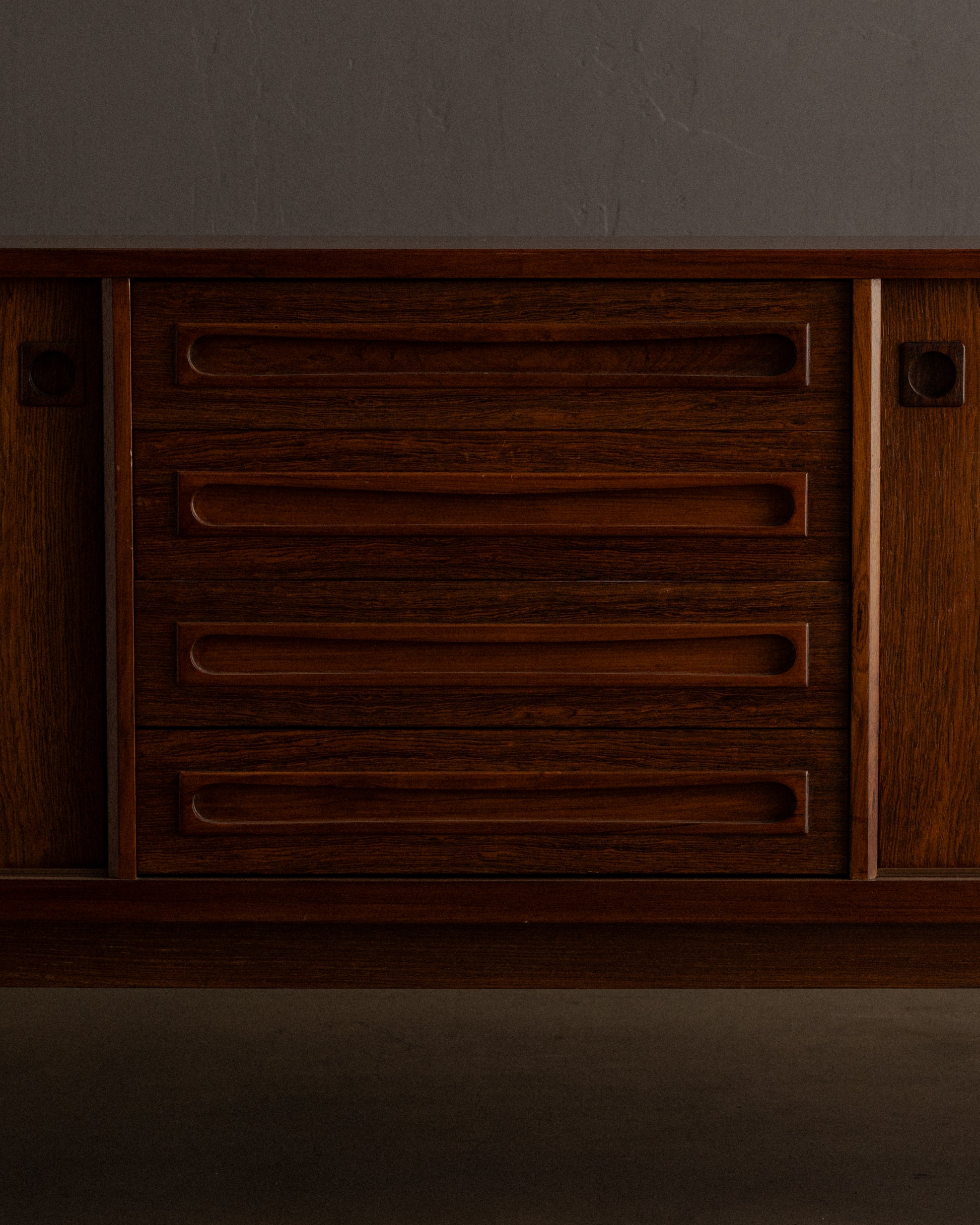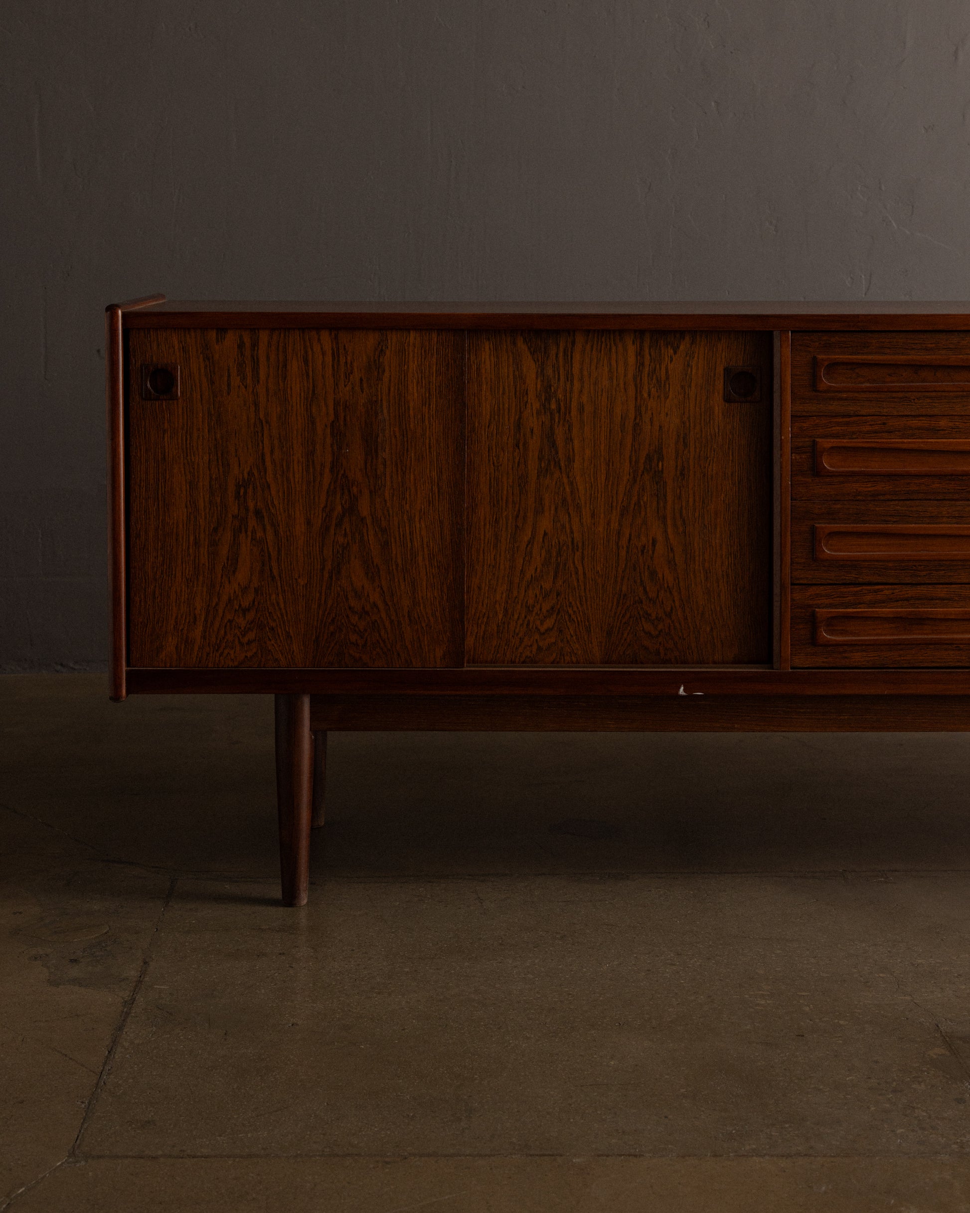 Elegant and finely crafted Danish rosewood credenza from the 1960s, showcasing exceptional wood grain and minimalist Scandinavian design. The piece features a long rectangular form with smooth sliding doors that reveal adjustable shelving and ample storage within.