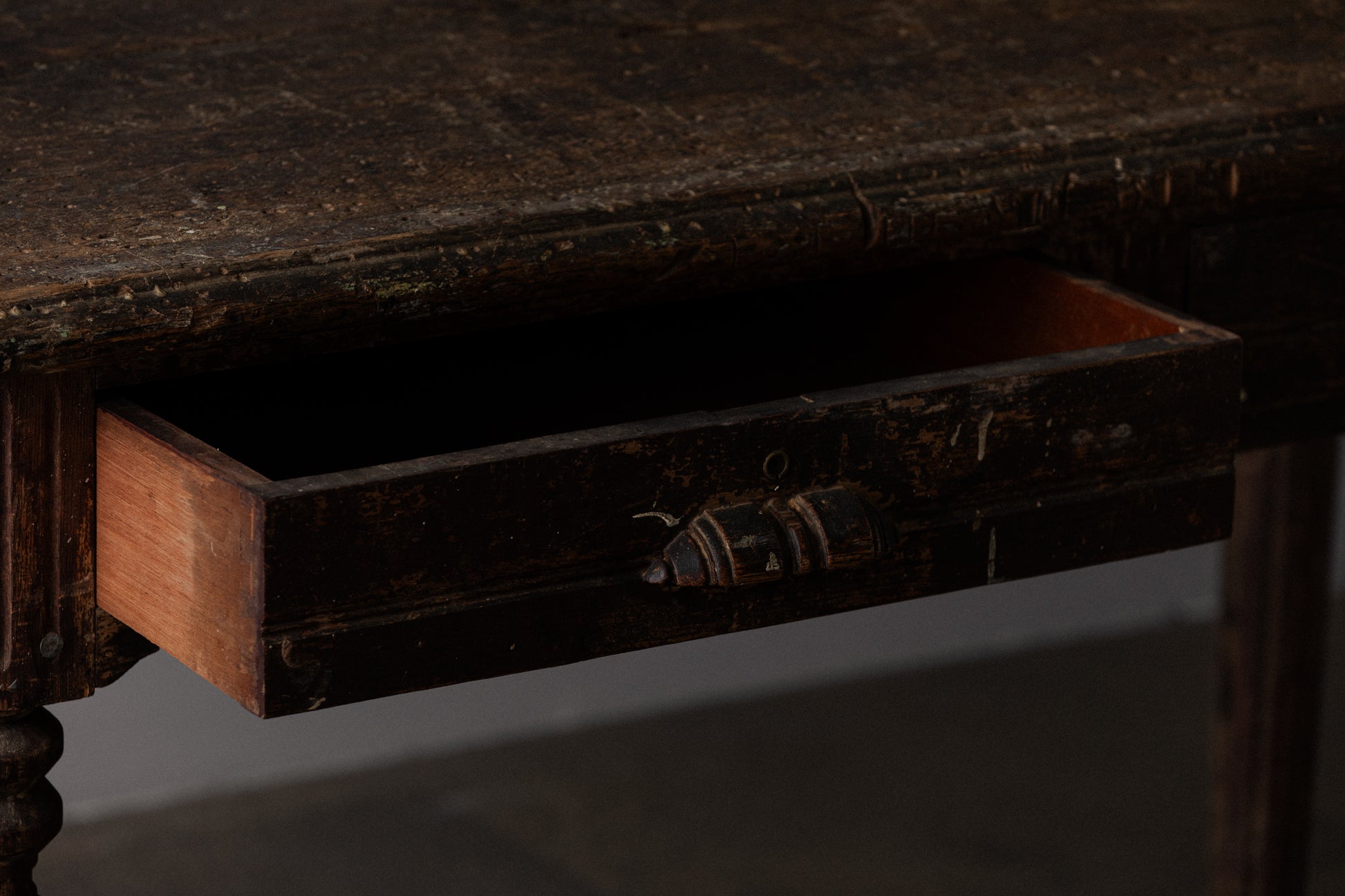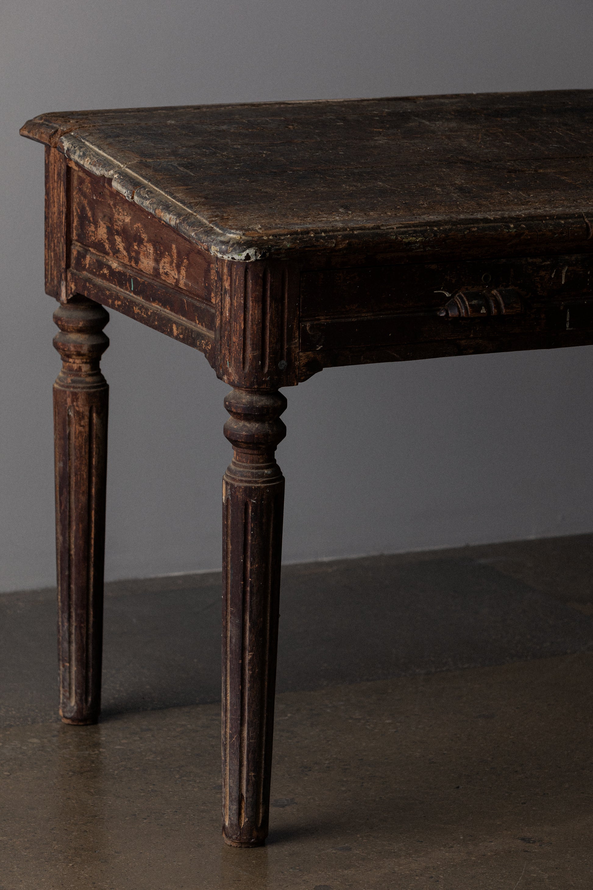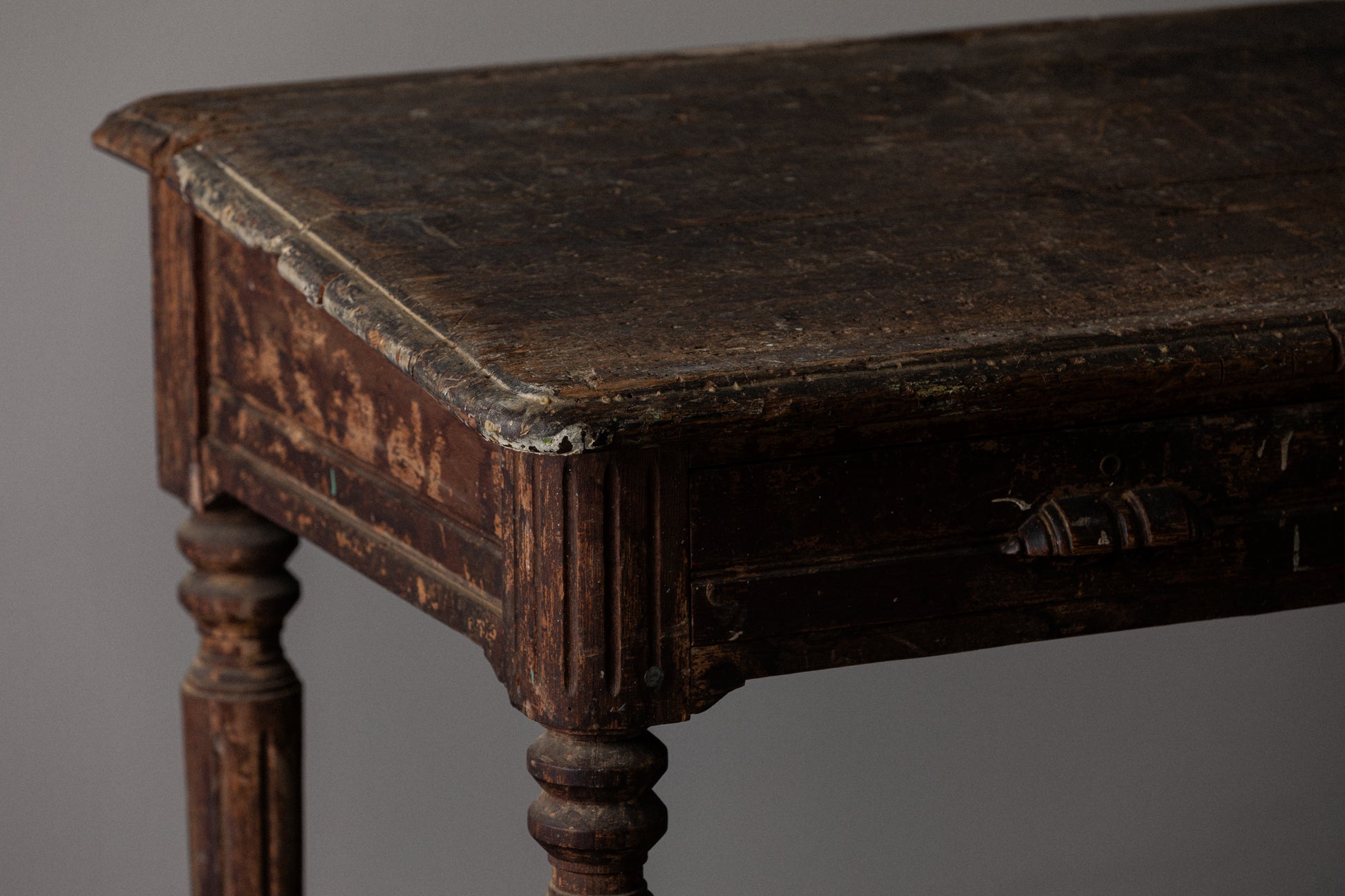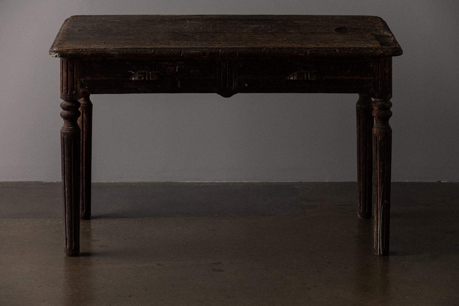 This Early American Two Drawer Desk showcases the simple yet elegant craftsmanship typical of American furniture from the 18th or early 19th century. The desk features a rectangular top with softly rounded edges, supported by four robust, turned legs with vertical grooves, giving the piece a subtle decorative element while maintaining functionality.