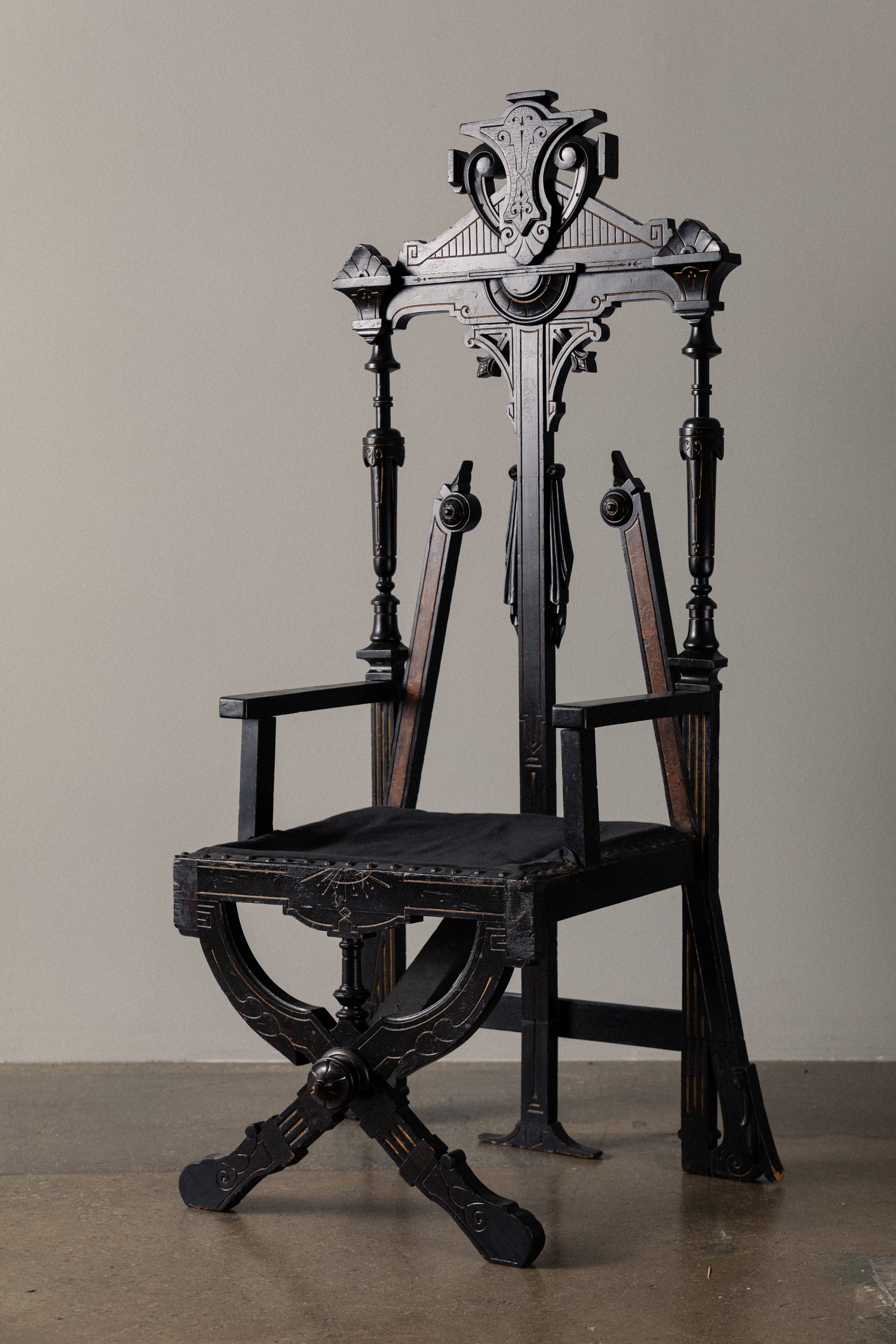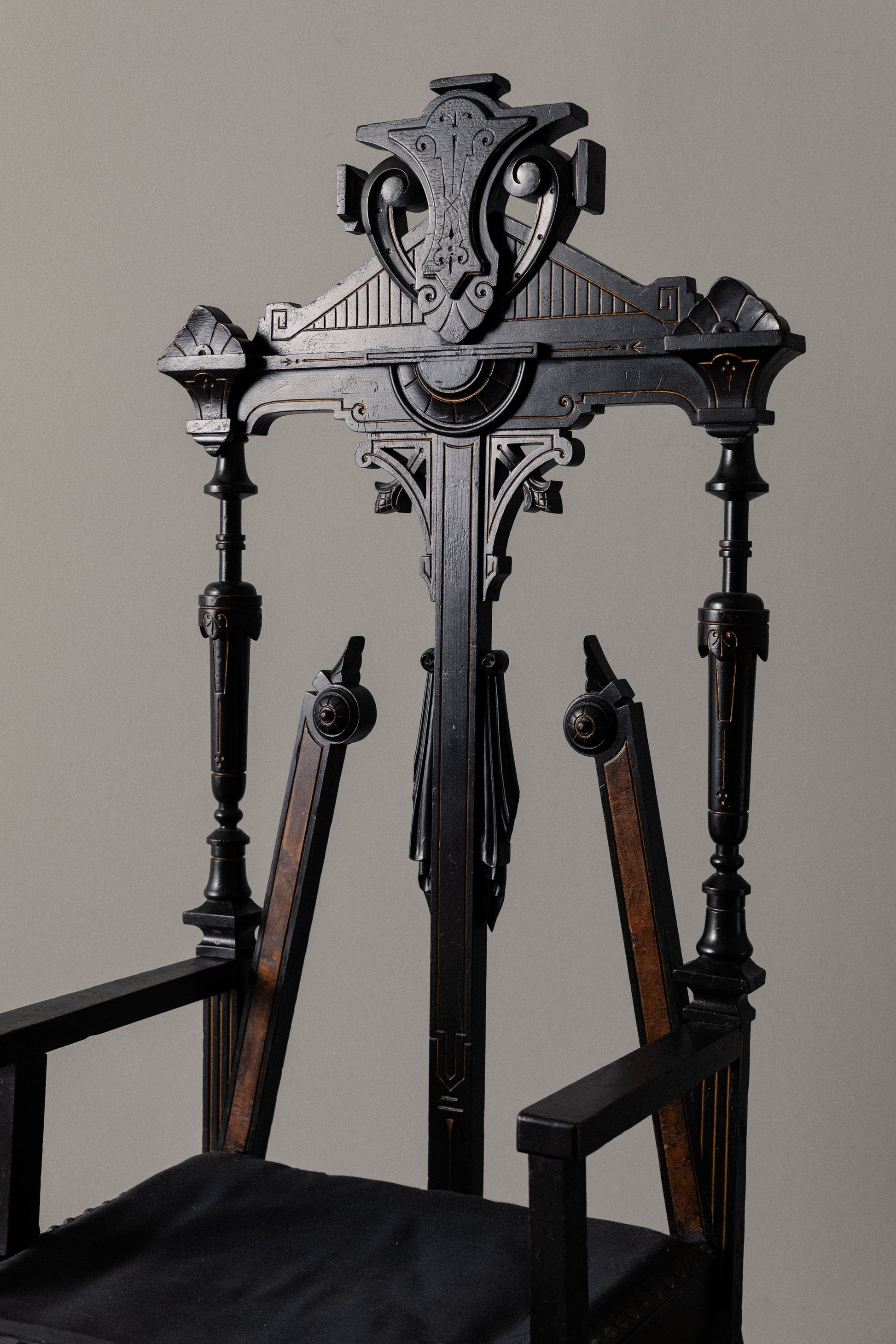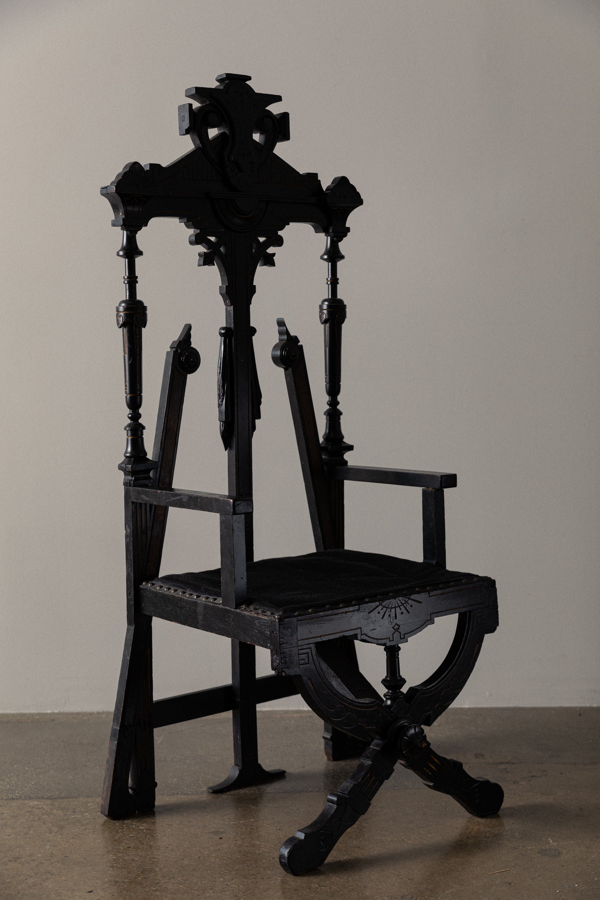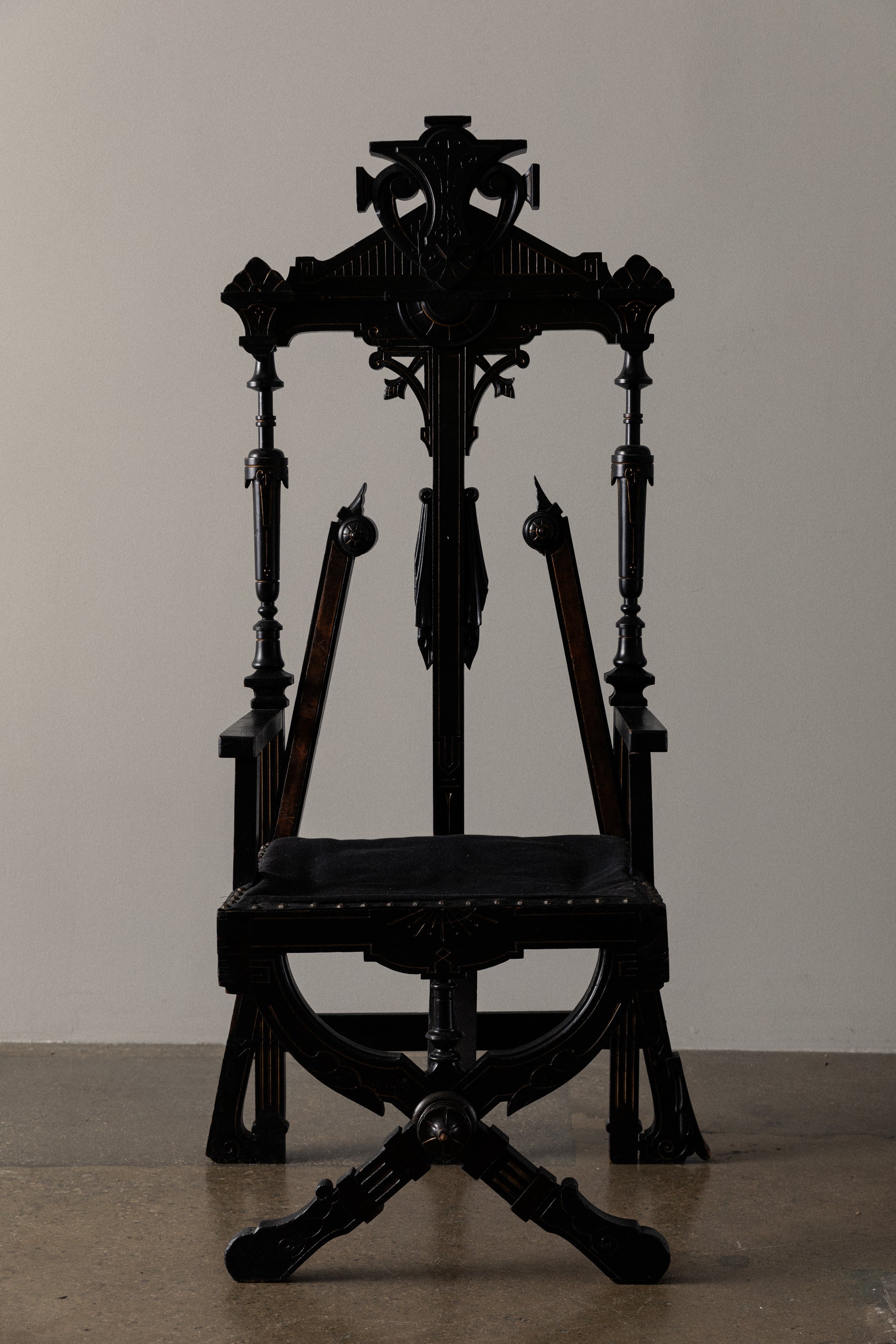 This Victorian Highback Chair showcases the grandeur of 19th-century design with its ebonized carved wood construction and intricate detailing. The tall, architectural backrest is adorned with ornate carvings, drawing influence from Gothic and Renaissance styles, while the sleek black finish enhances its dramatic and stately presence.