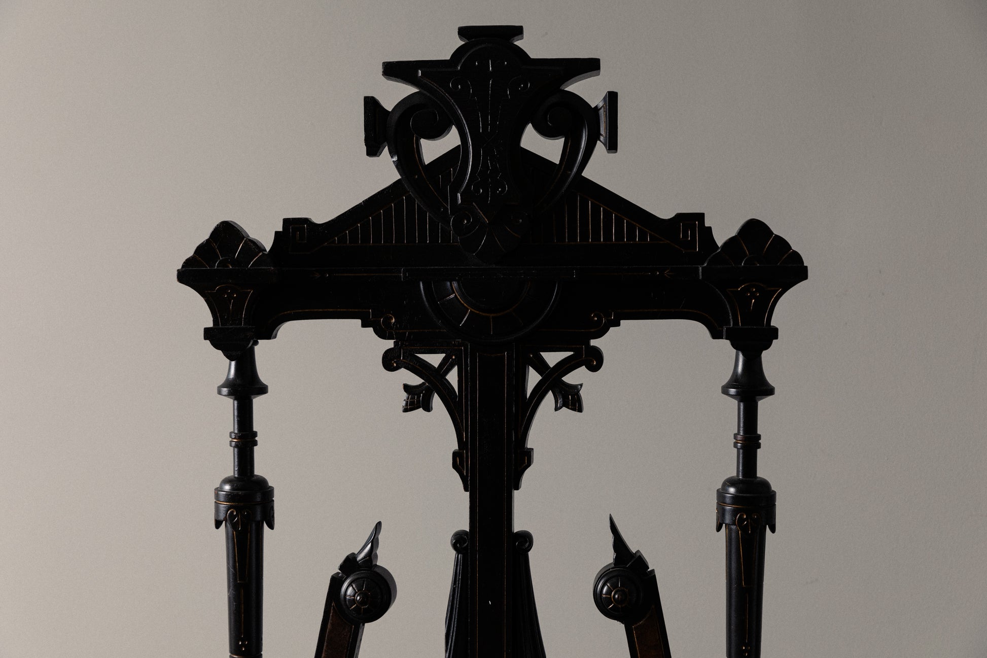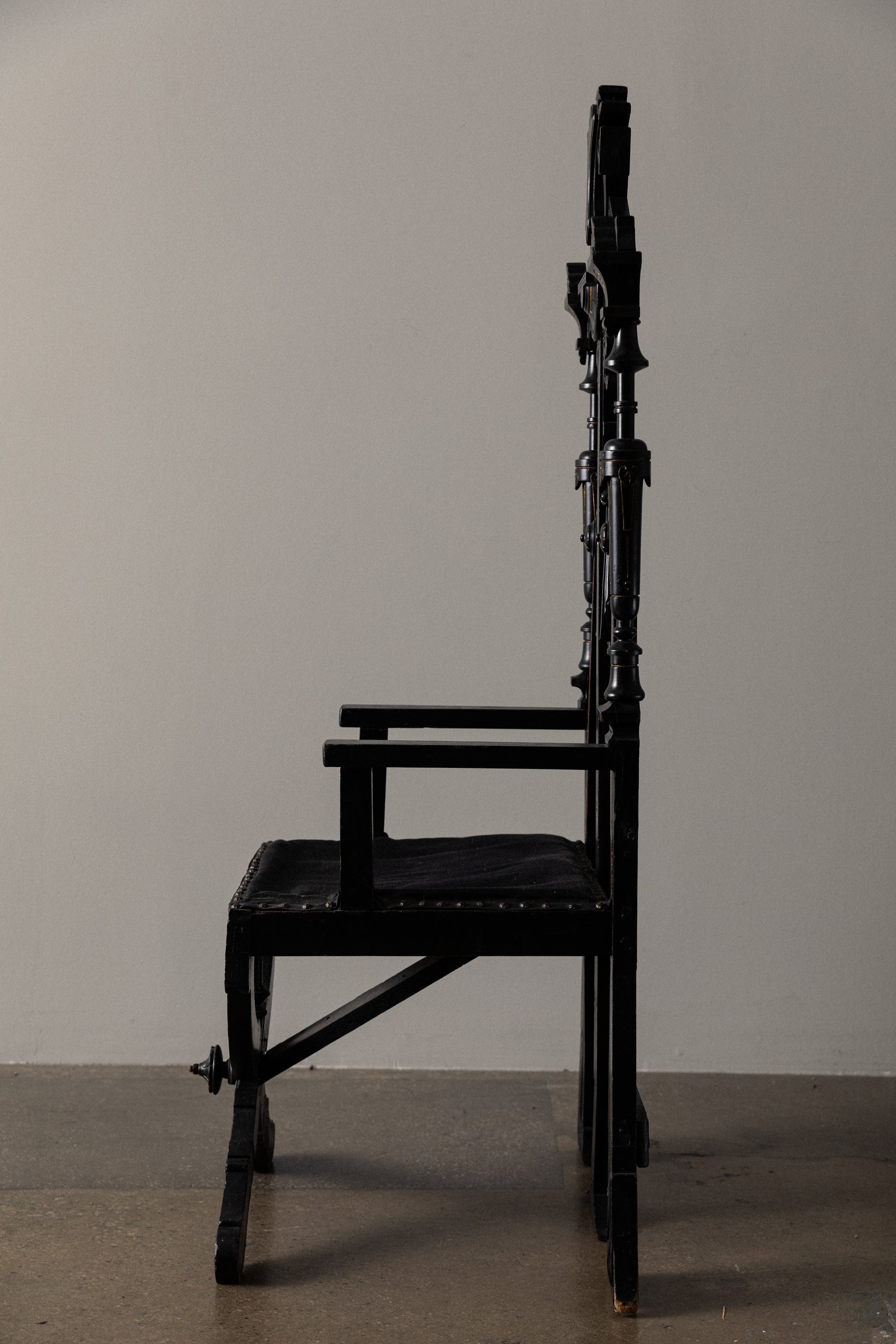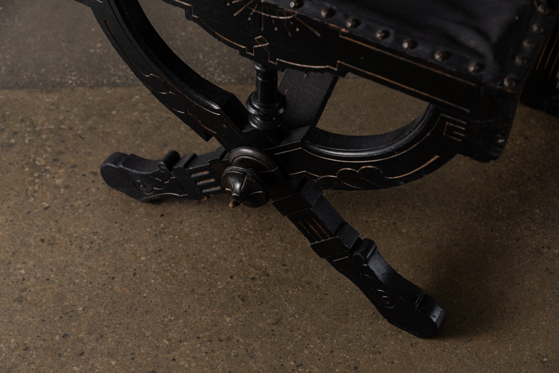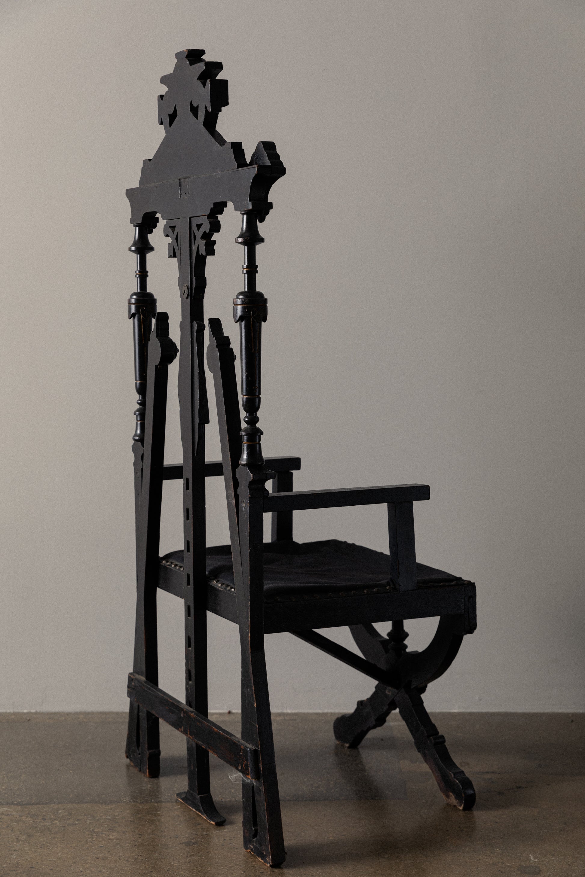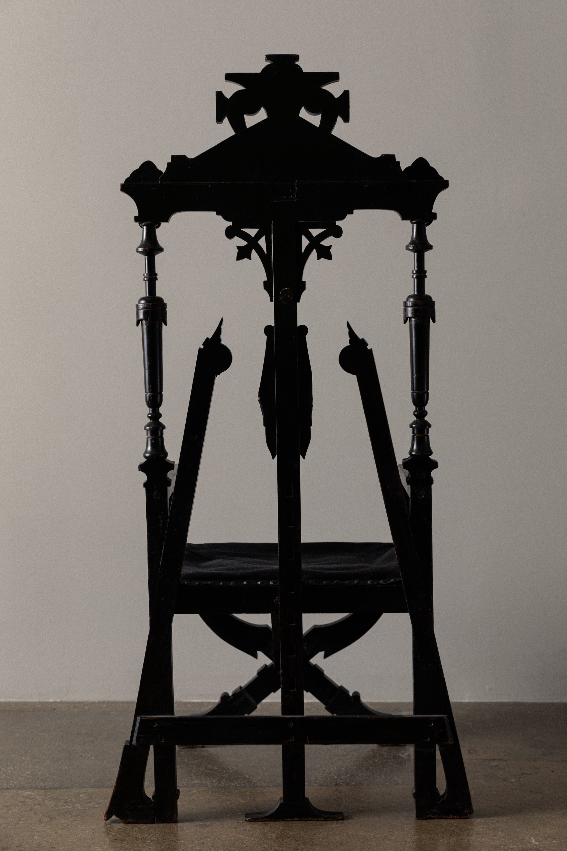 This Victorian Highback Chair showcases the grandeur of 19th-century design with its ebonized carved wood construction and intricate detailing. The tall, architectural backrest is adorned with ornate carvings, drawing influence from Gothic and Renaissance styles, while the sleek black finish enhances its dramatic and stately presence.