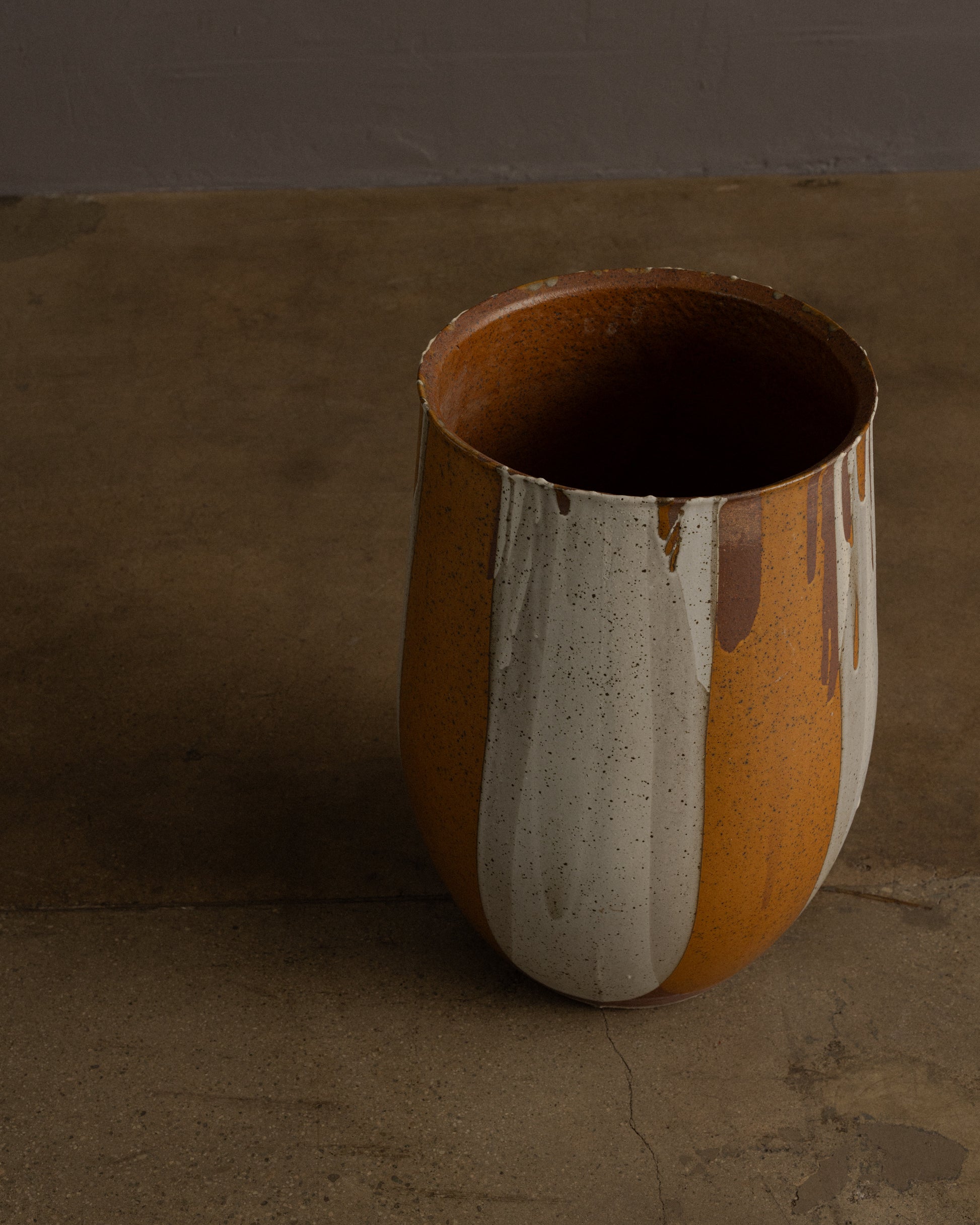 1960's sculptural ceramic planter produced by Architectural Pottery, USA, finished with a hand-applied flame glaze. The vertical glaze drips are formed manually by pouring the glaze over the vessel, creating deliberate rivulets that flow down the surface and give the piece its expressive, flame-like character. Set against a speckled ground glaze, the poured glaze contrasts in tone and texture, emphasizing movement and depth while preserving the planter’s clean, modern form. Each example is inherently unique due to the hand-applied process.