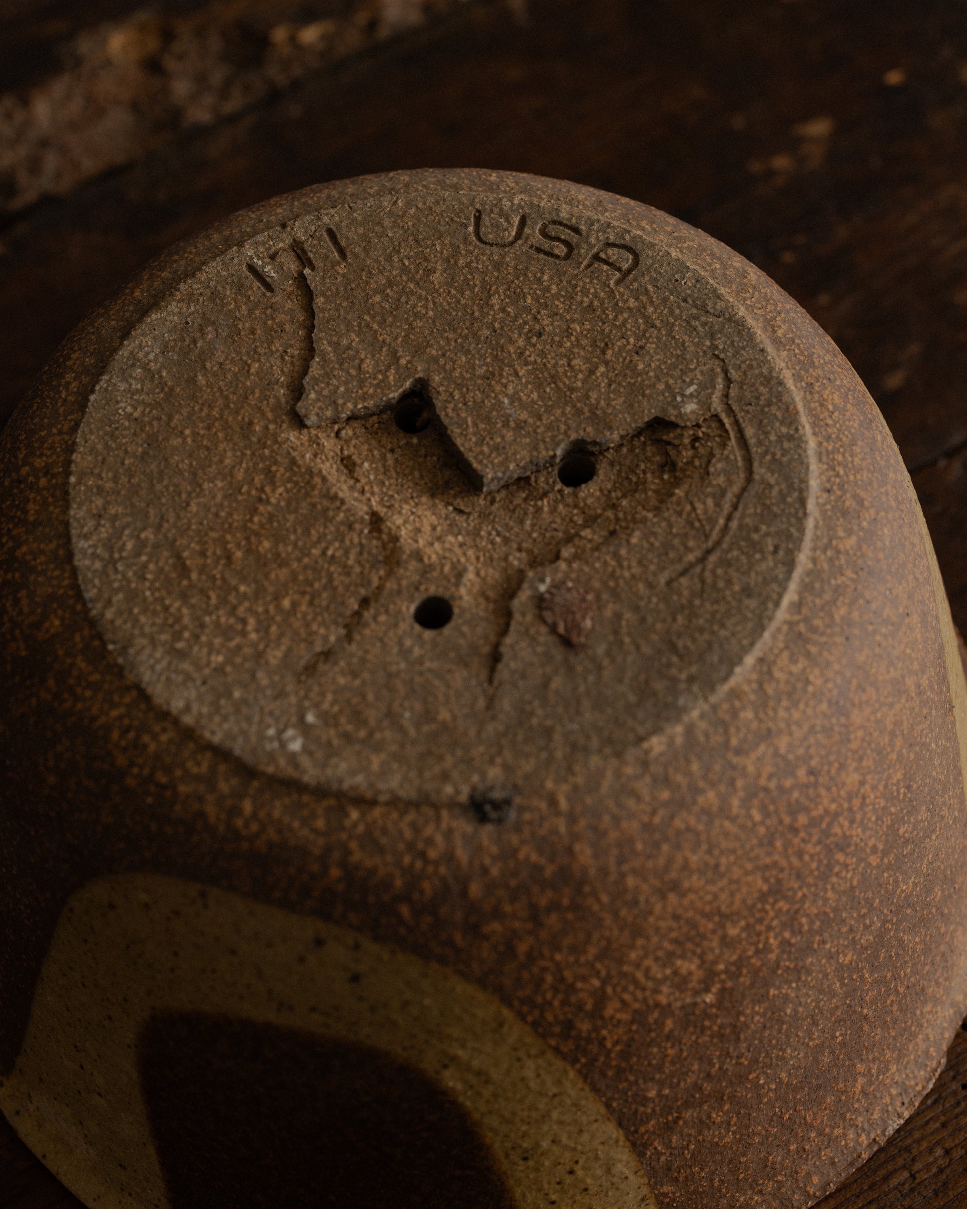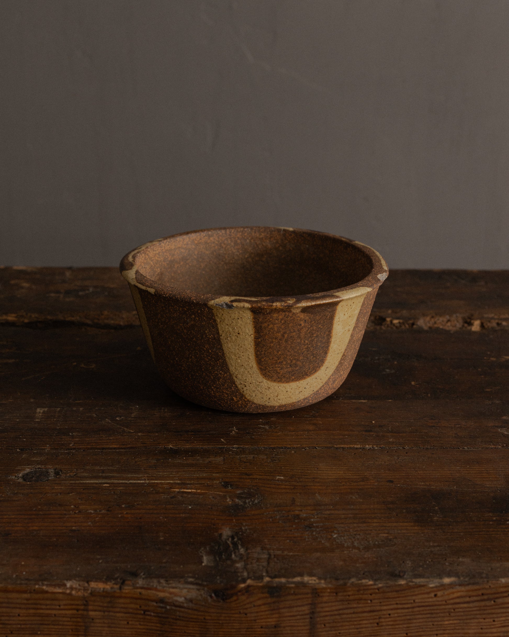 A stoneware bowl from Architectural Pottery, Los Angeles, c. 1960s. This piece features the distinctive flame glaze finish, with sweeping natural ash tones in ochre and deep iron brown over a warm clay body.