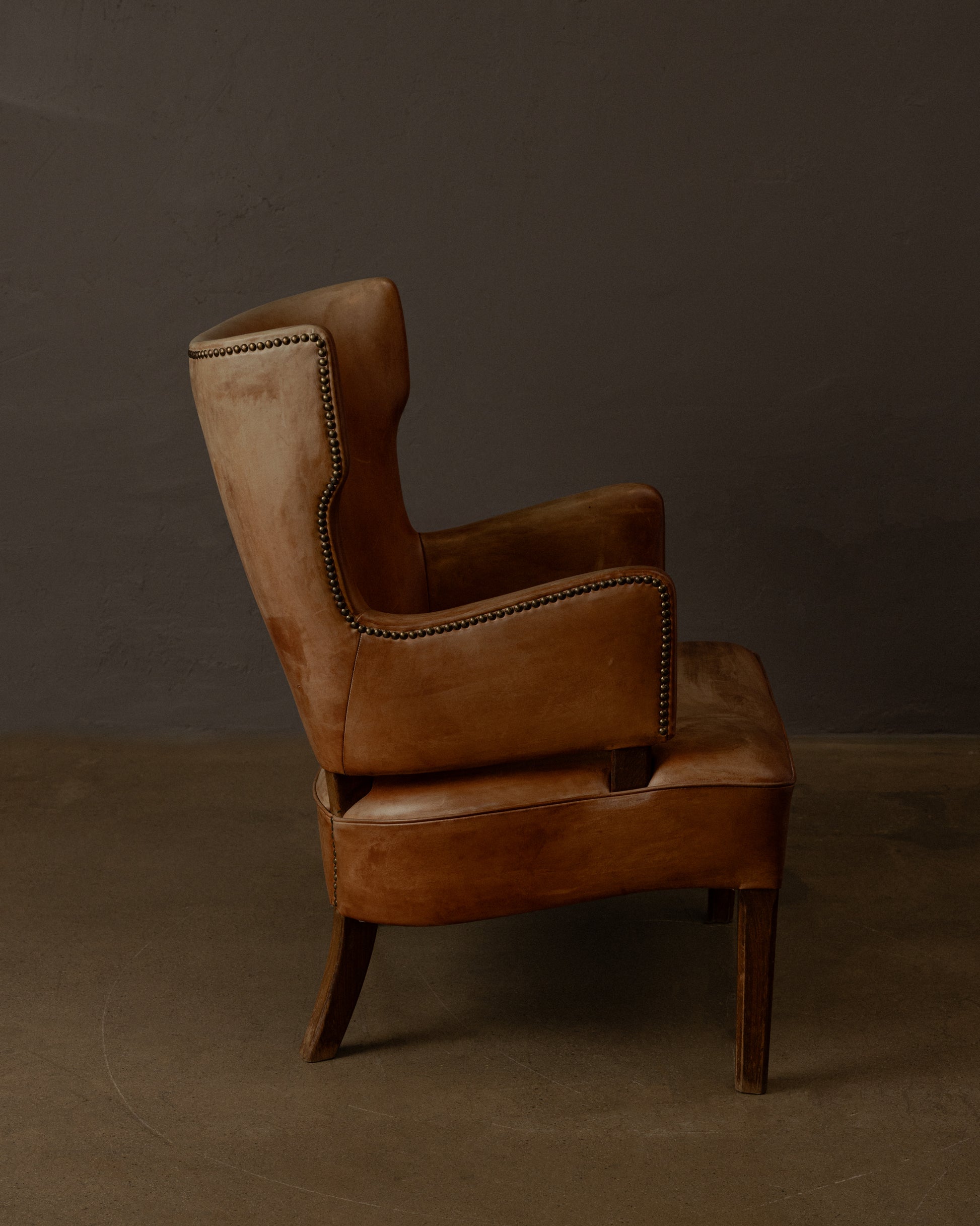 A sculptural wingback armchair by Danish designer Jacob Kjær, featuring original warm brown leather upholstery with rich patina and refined joinery.