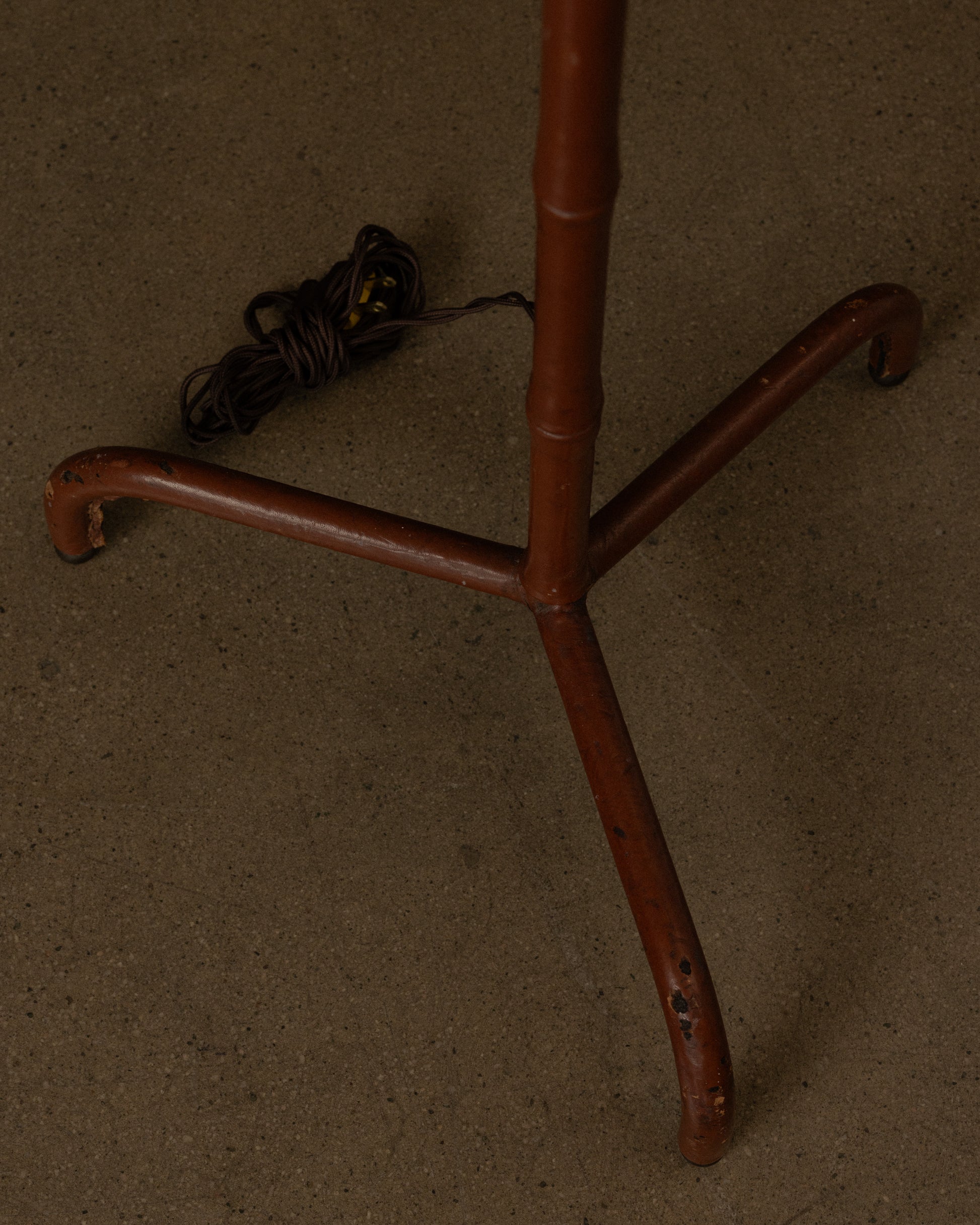 France, 1950's: A sophisticated floor lamp by Jacques Adnet, featuring a faux bamboo metal frame meticulously wrapped in saddle-stitched leather. Finished with a simple linen shade.