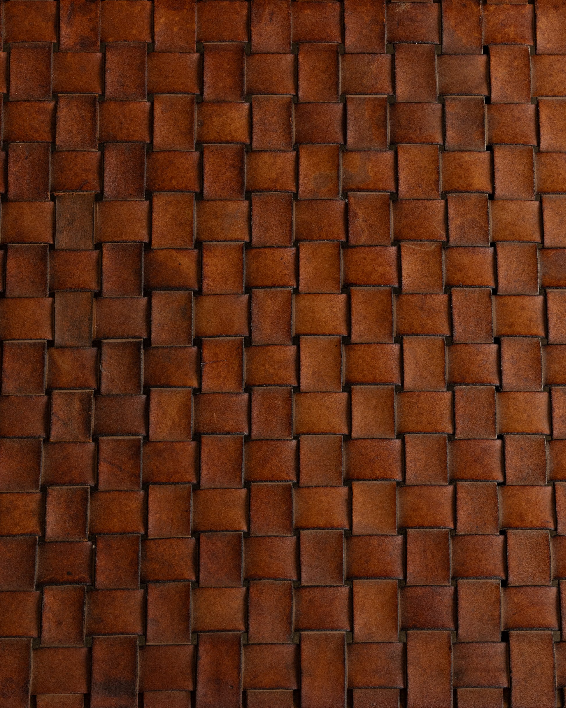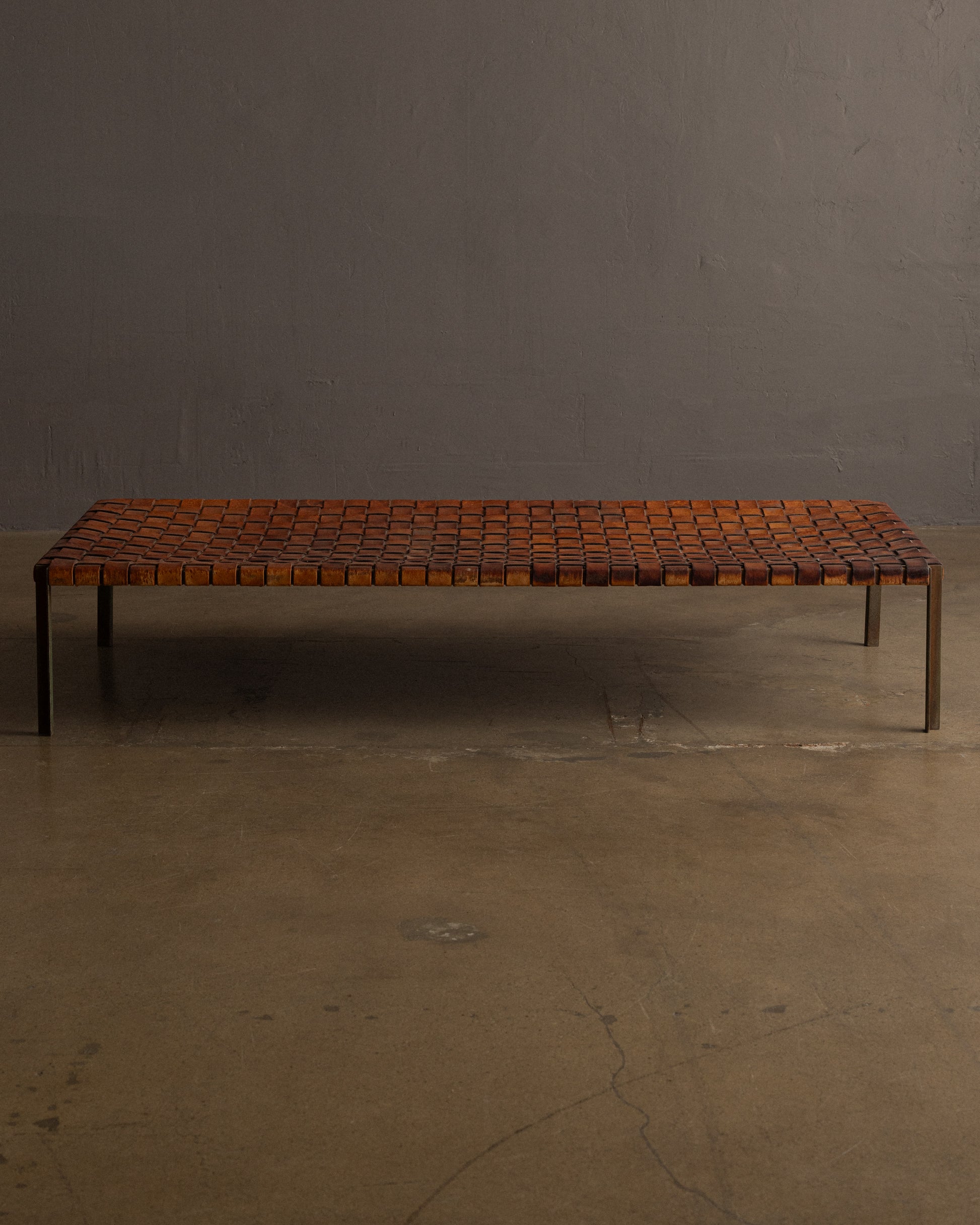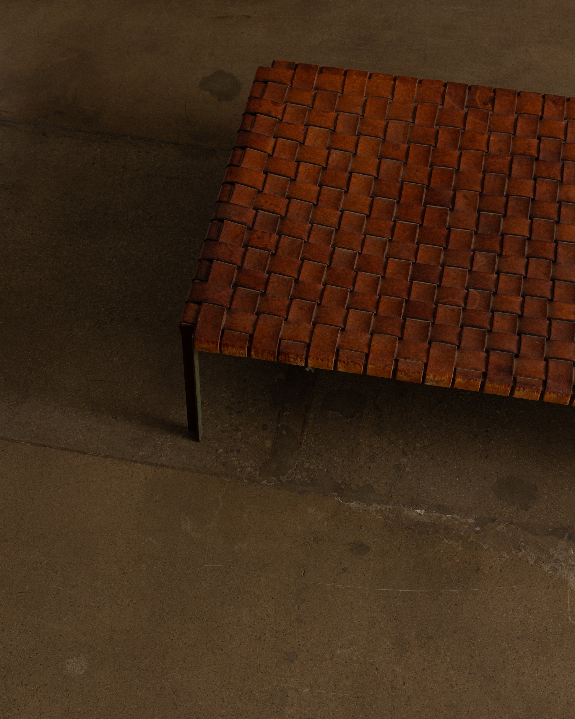 Striking mid-century bench designed by Laverne, featuring a hand-woven leather surface stretched over a minimalist steel frame. The richly patinated leather tiles create a graphic, tactile field, while the slim, squared legs give the piece a light, architectural presence.