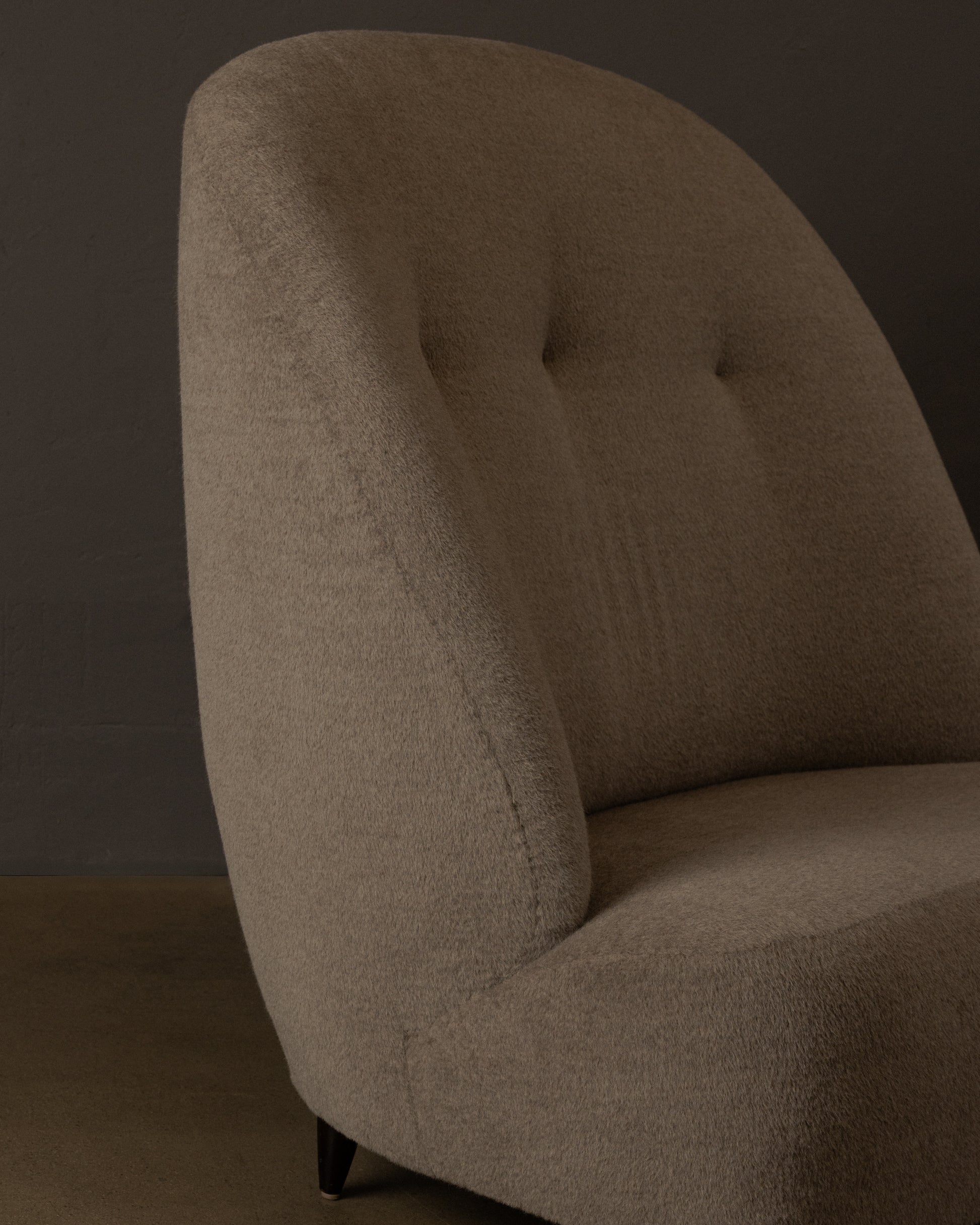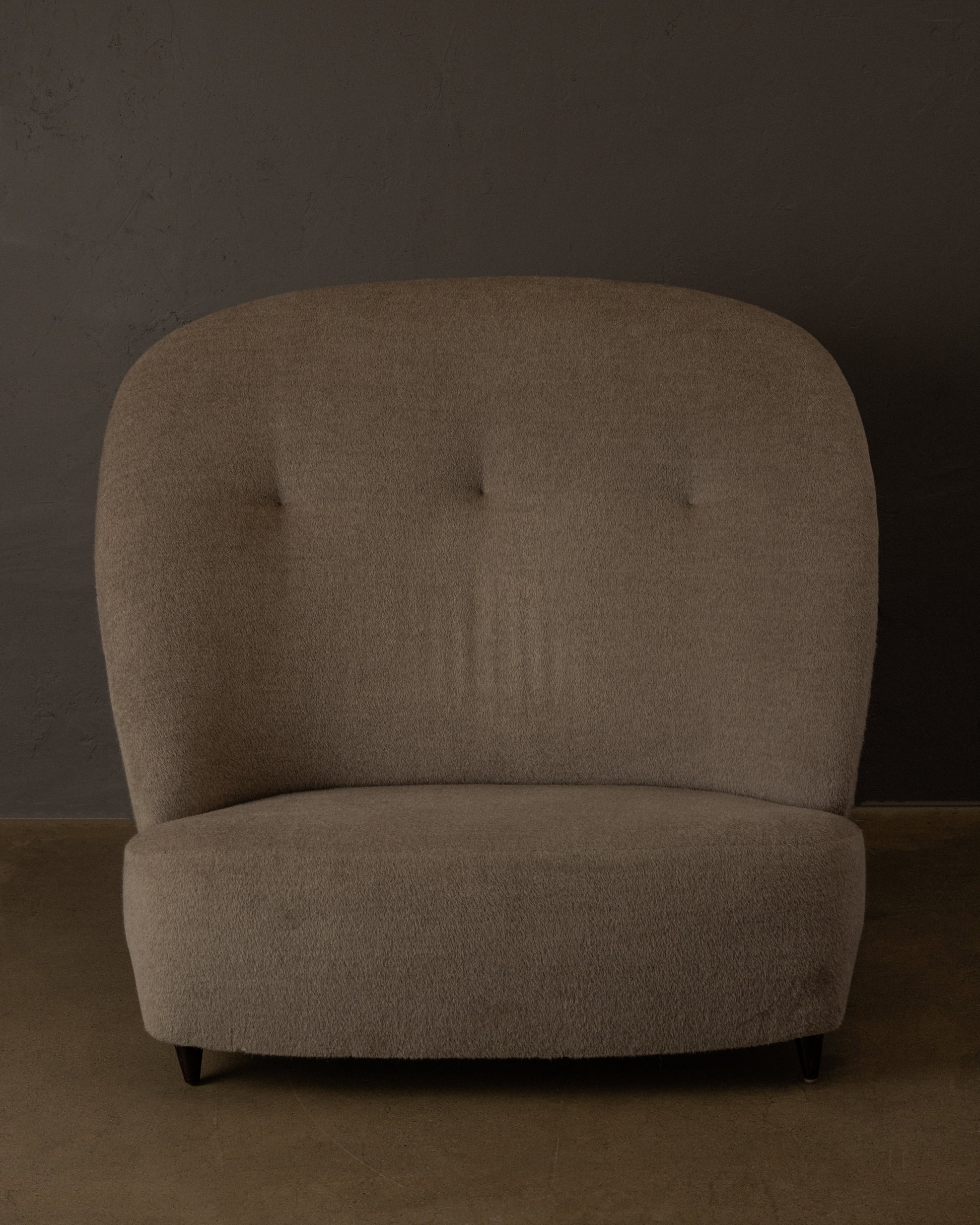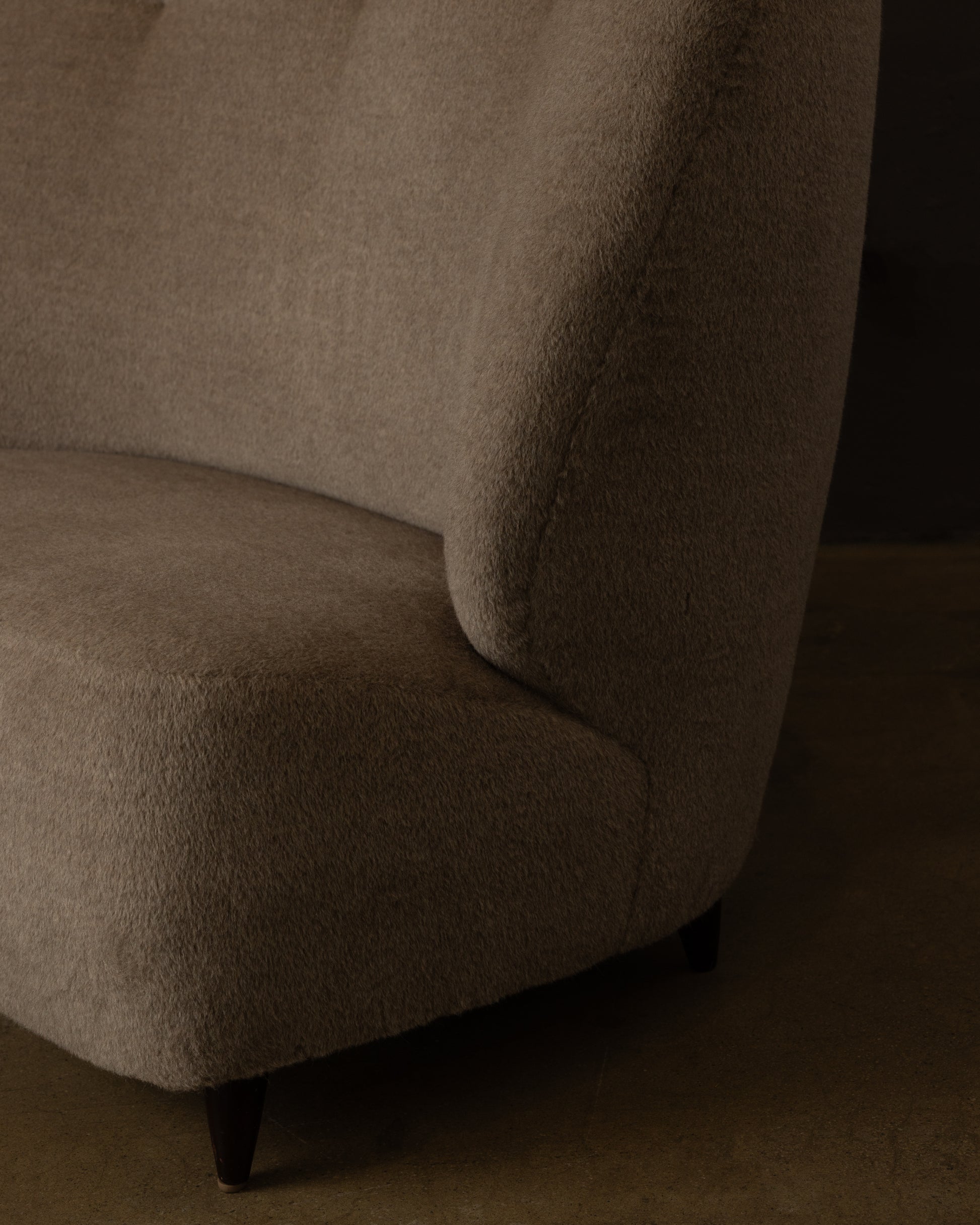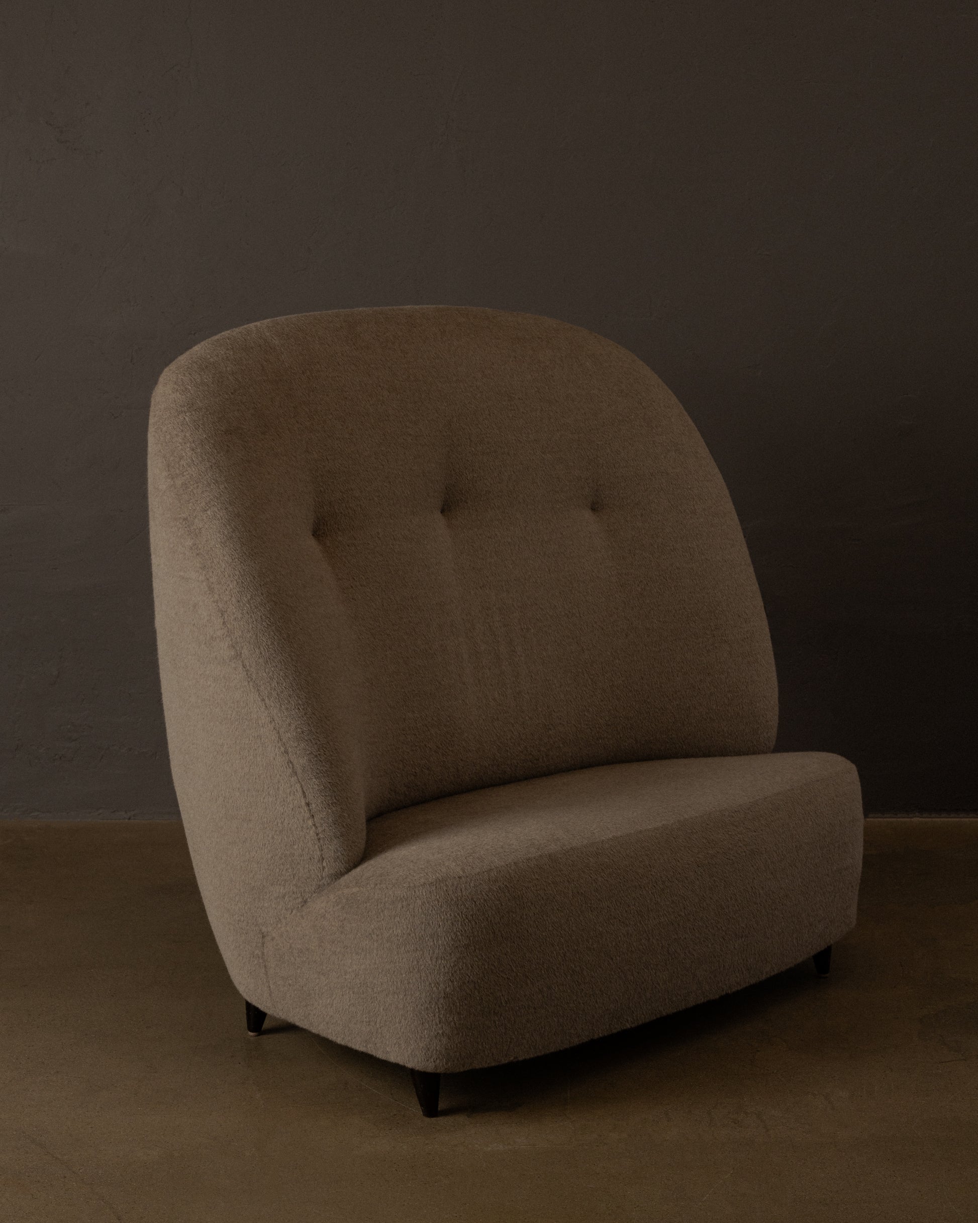 Sculptural high-back loveseat upholstered in a rich, taupe-toned fabric with subtle texture with soft curves and slightly recessed tufting, resting on tapered wood legs.