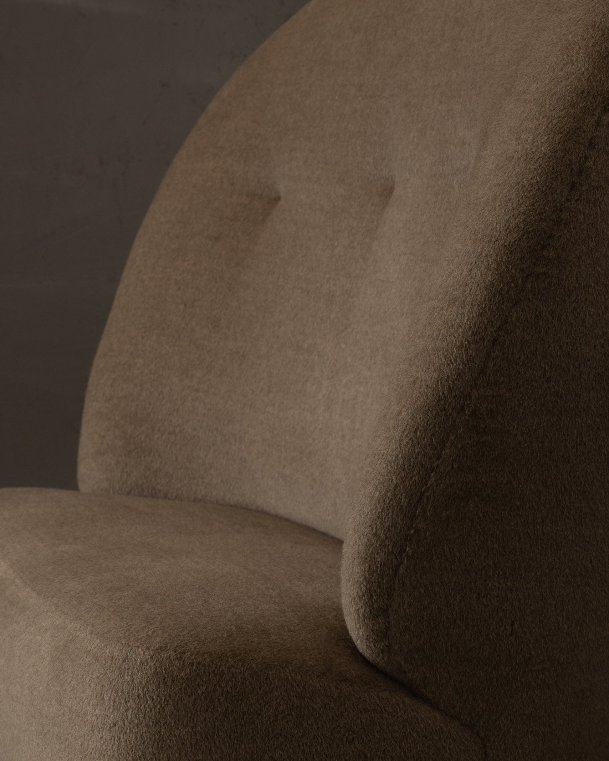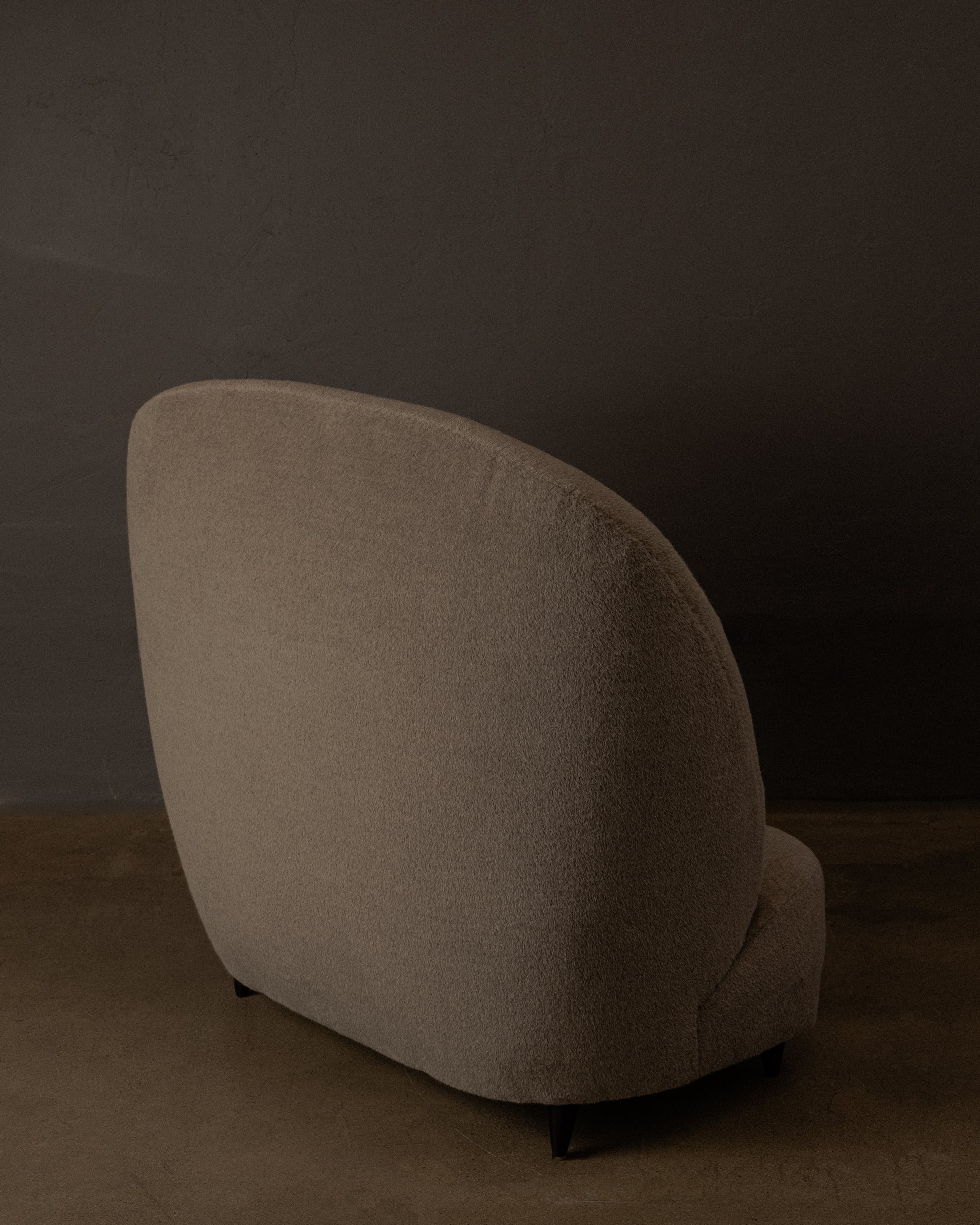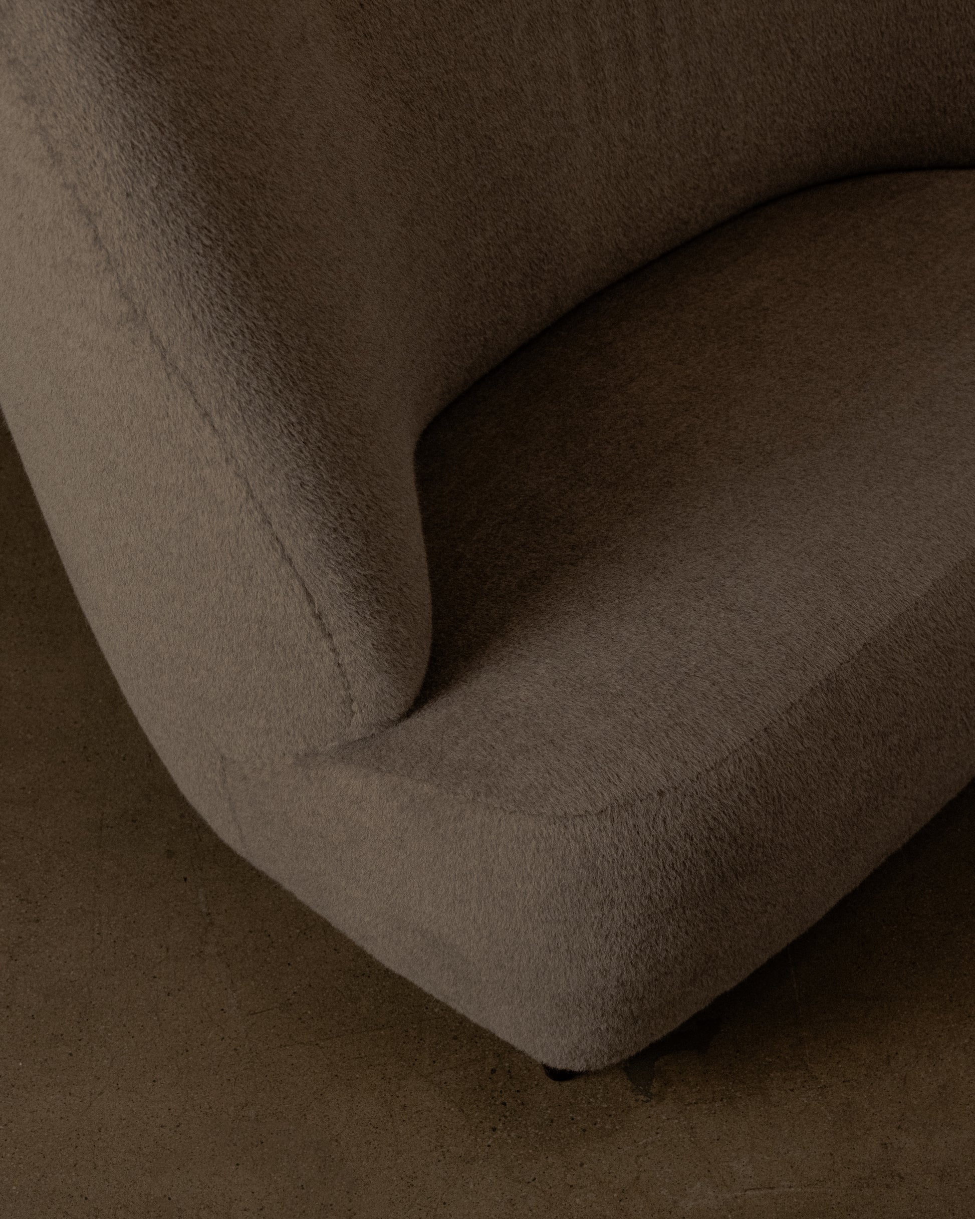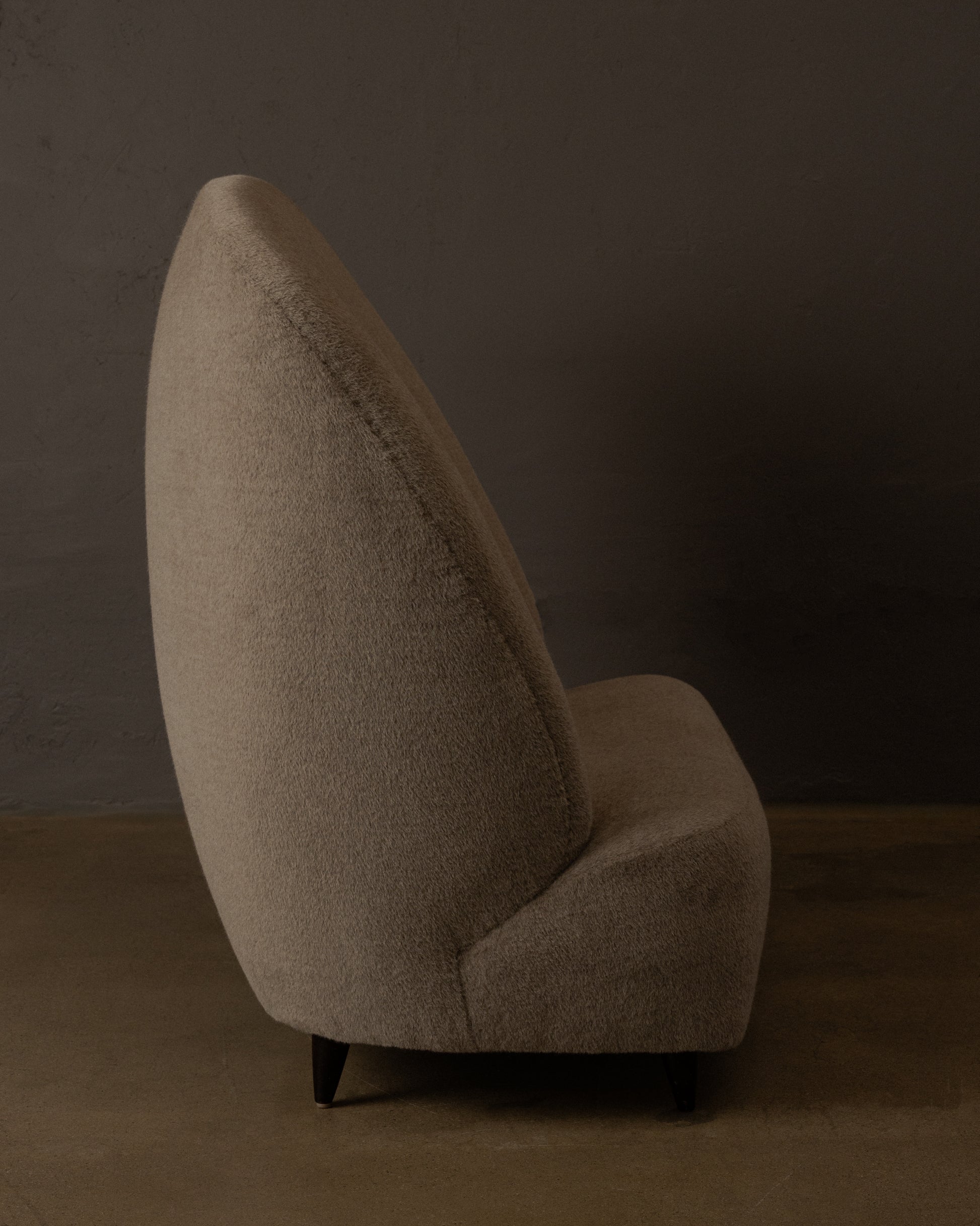 Sculptural high-back loveseat upholstered in a rich, taupe-toned fabric with subtle texture with soft curves and slightly recessed tufting, resting on tapered wood legs.