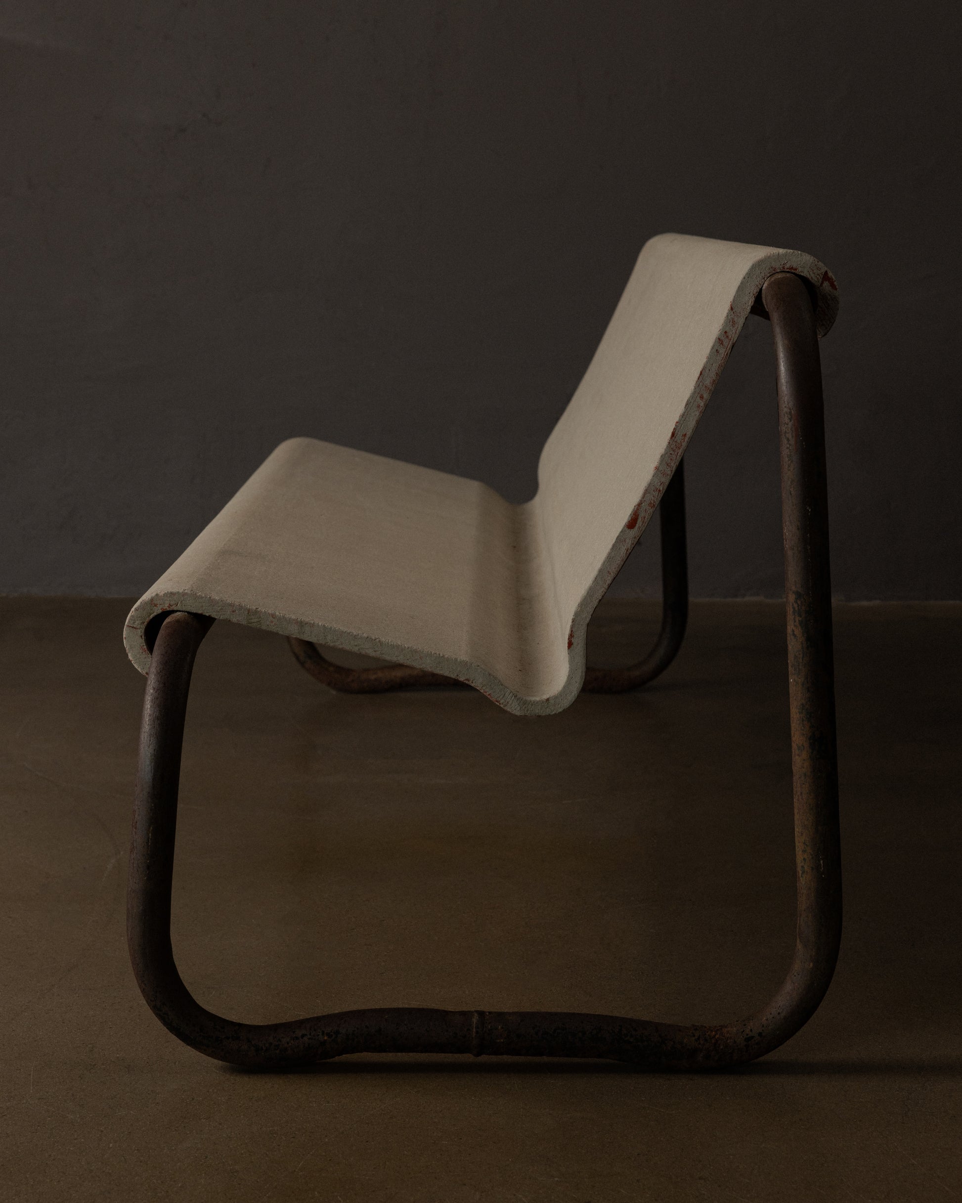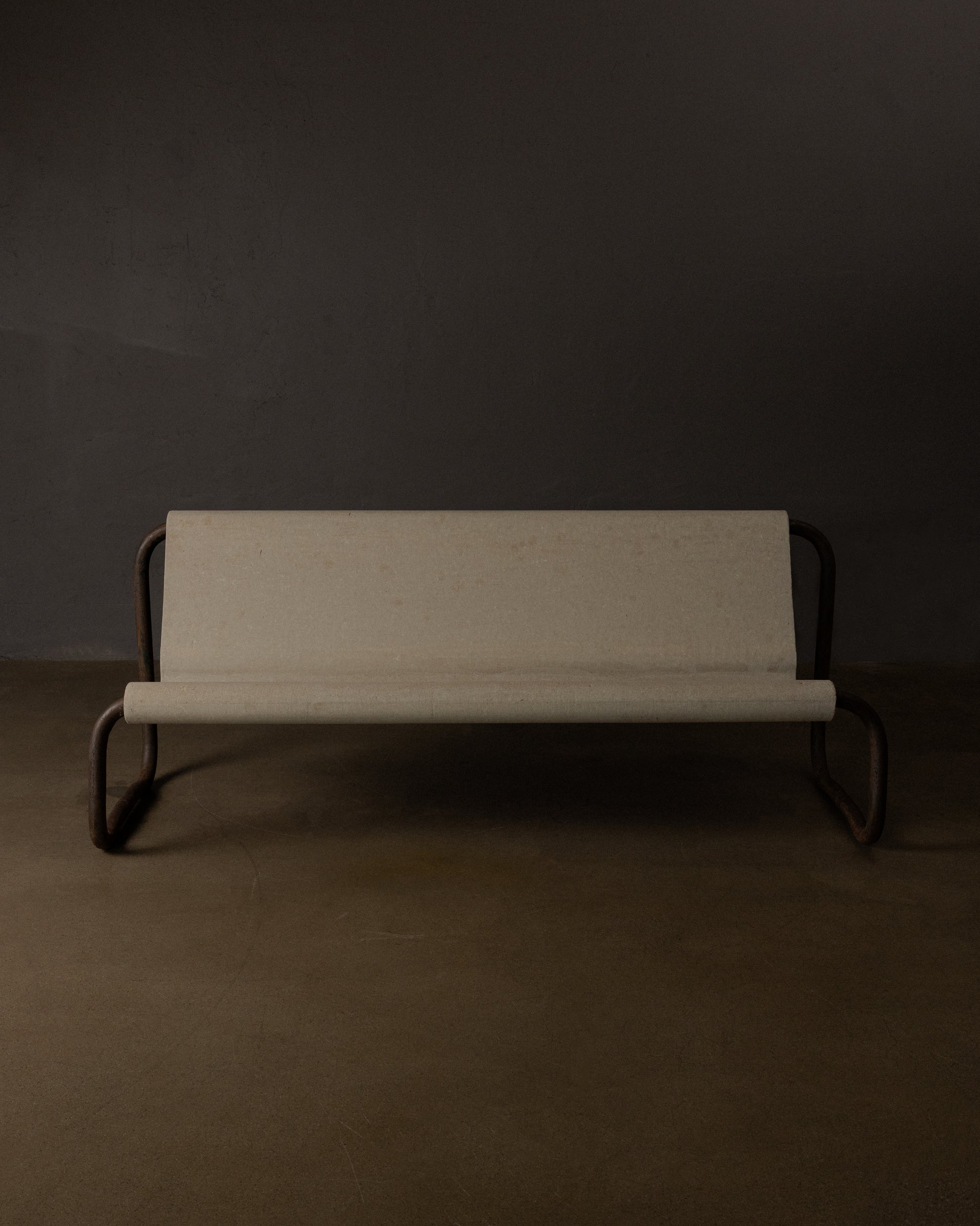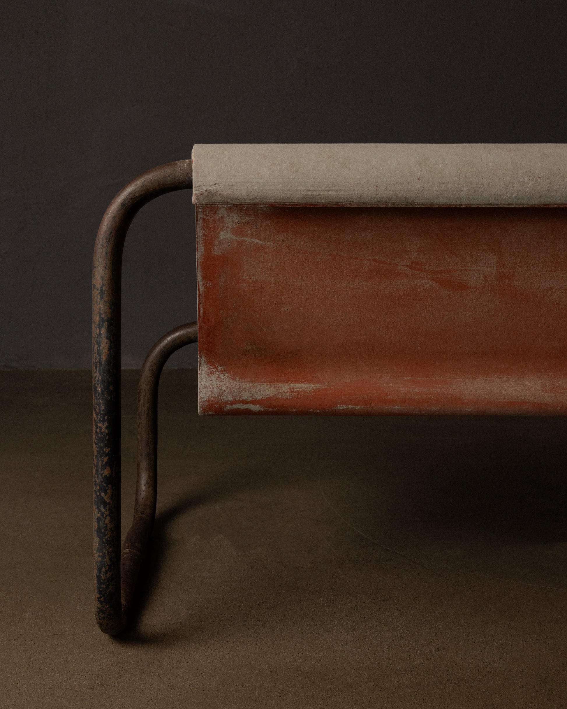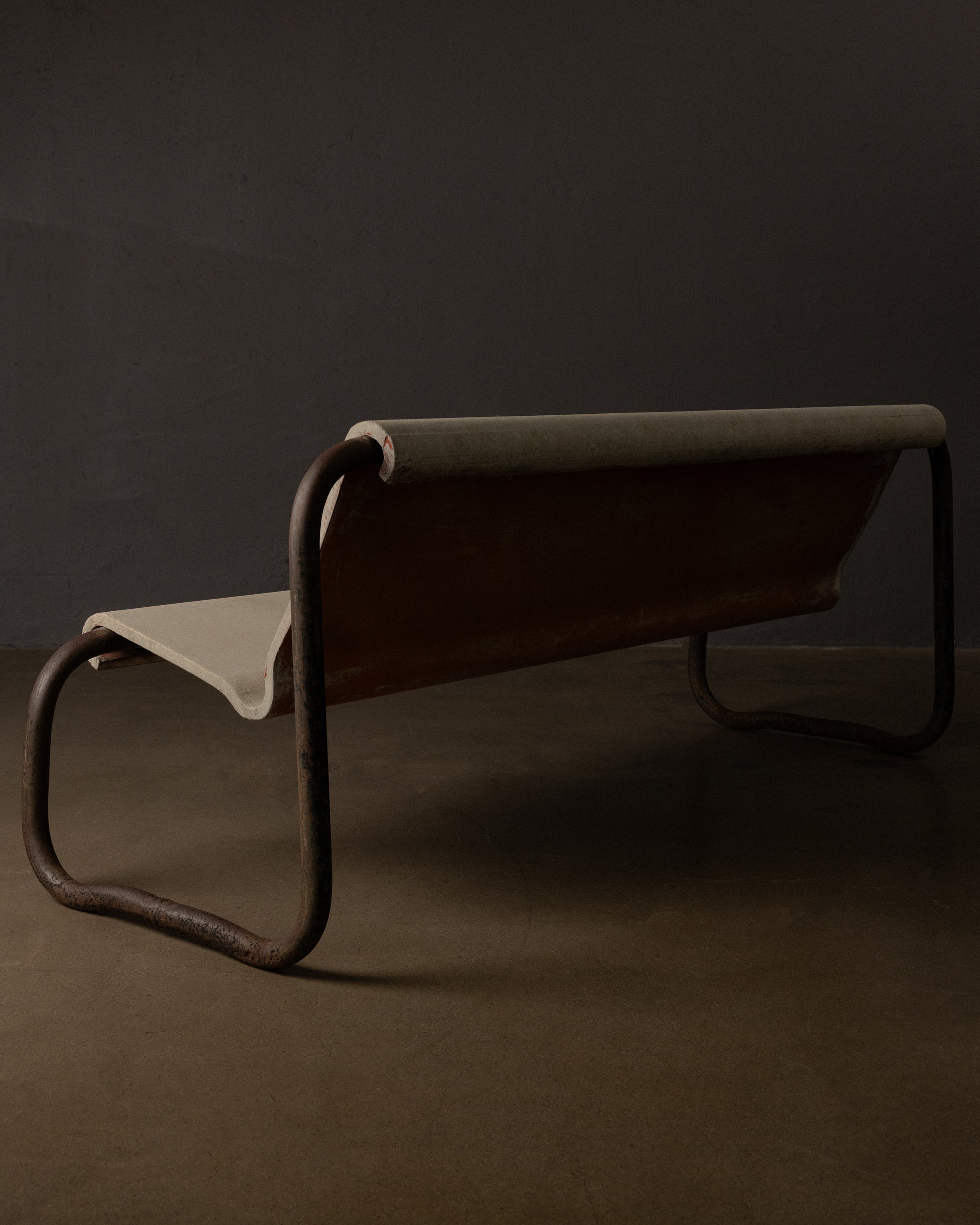 A sculptural outdoor bench by Swiss designer Willy Guhl, featuring a curved fiber cement seat and a tubular iron base with original patina, 1950's