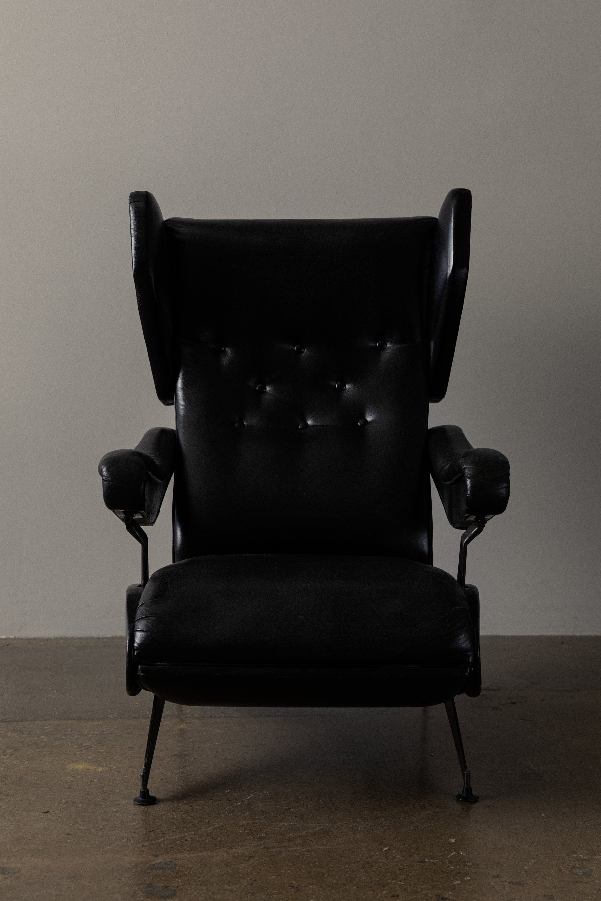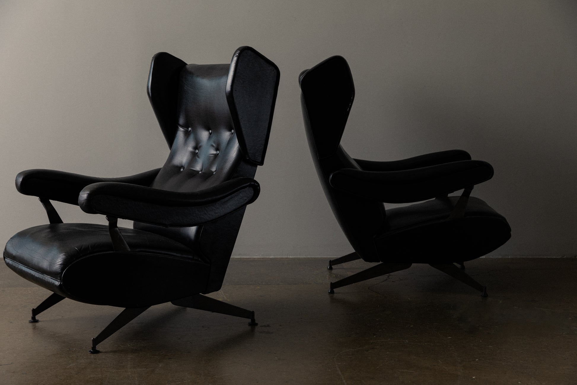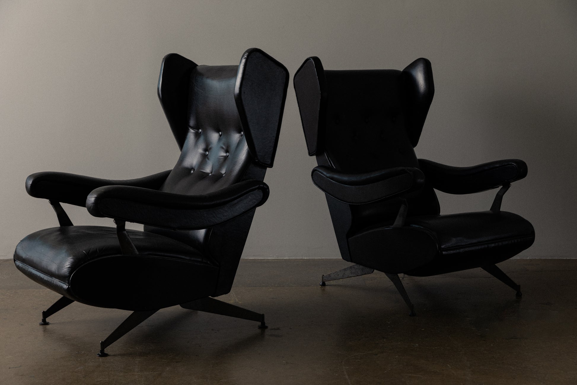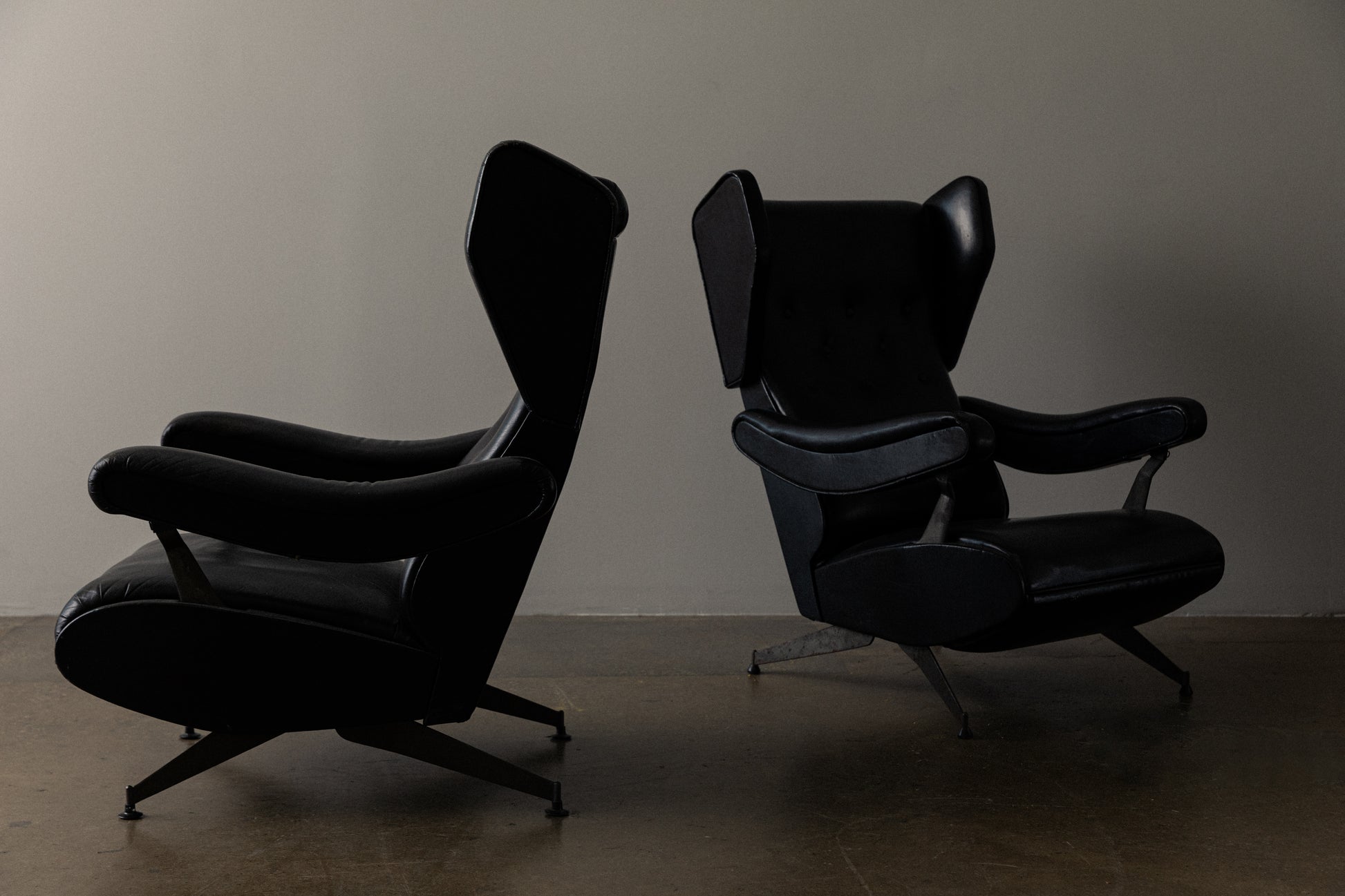 Italy, 1950's: Striking and sculptural, this pair of armchairs by Italian designer Nello Pini exemplifies bold mid-century design. Featuring dramatic winged headrests and wide, angular armrests, the chairs are upholstered in original black leather with button-tufted backs and plush cushions. Resting on splayed metal legs, the chairs offer a commanding silhouette while maintaining comfort and style.