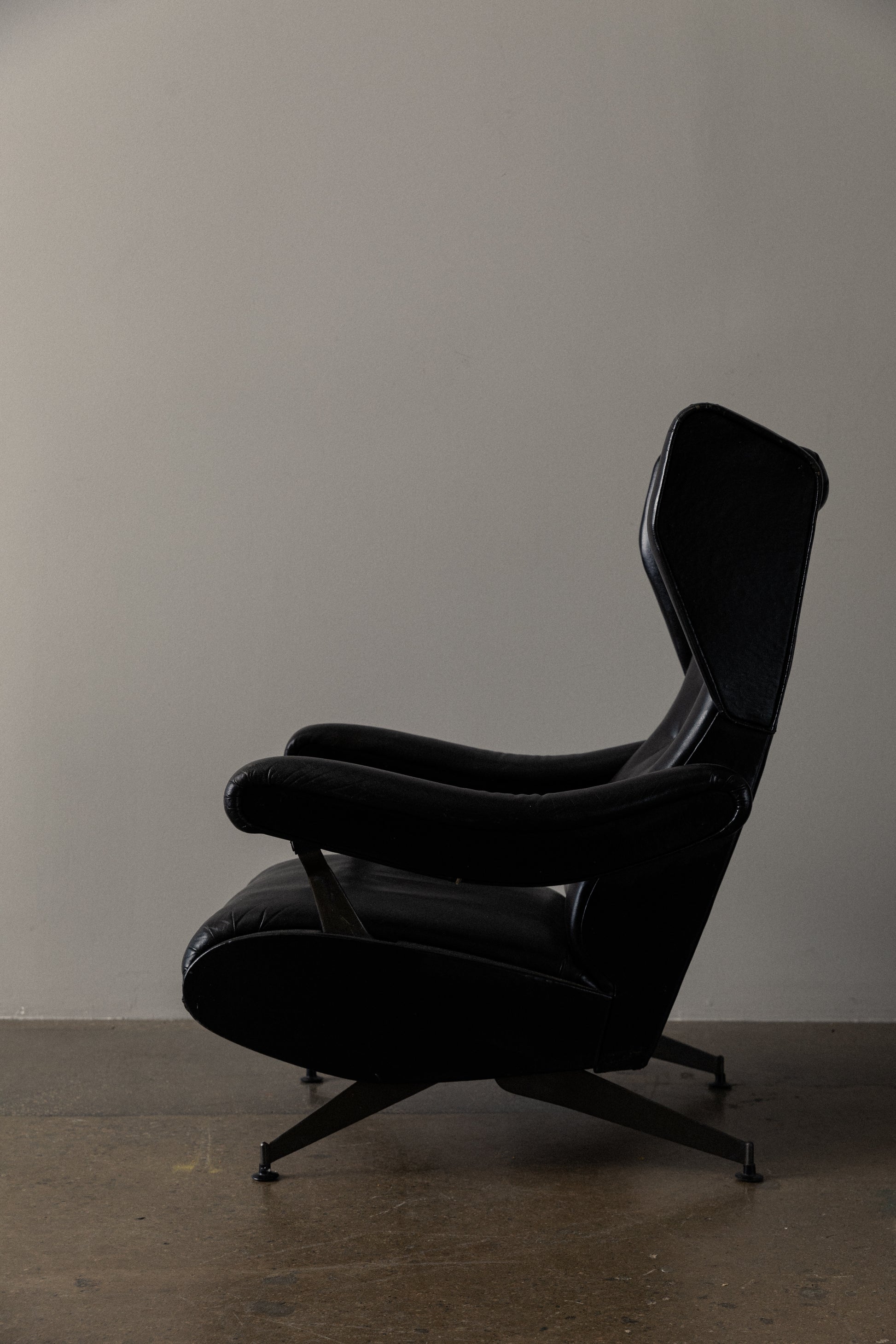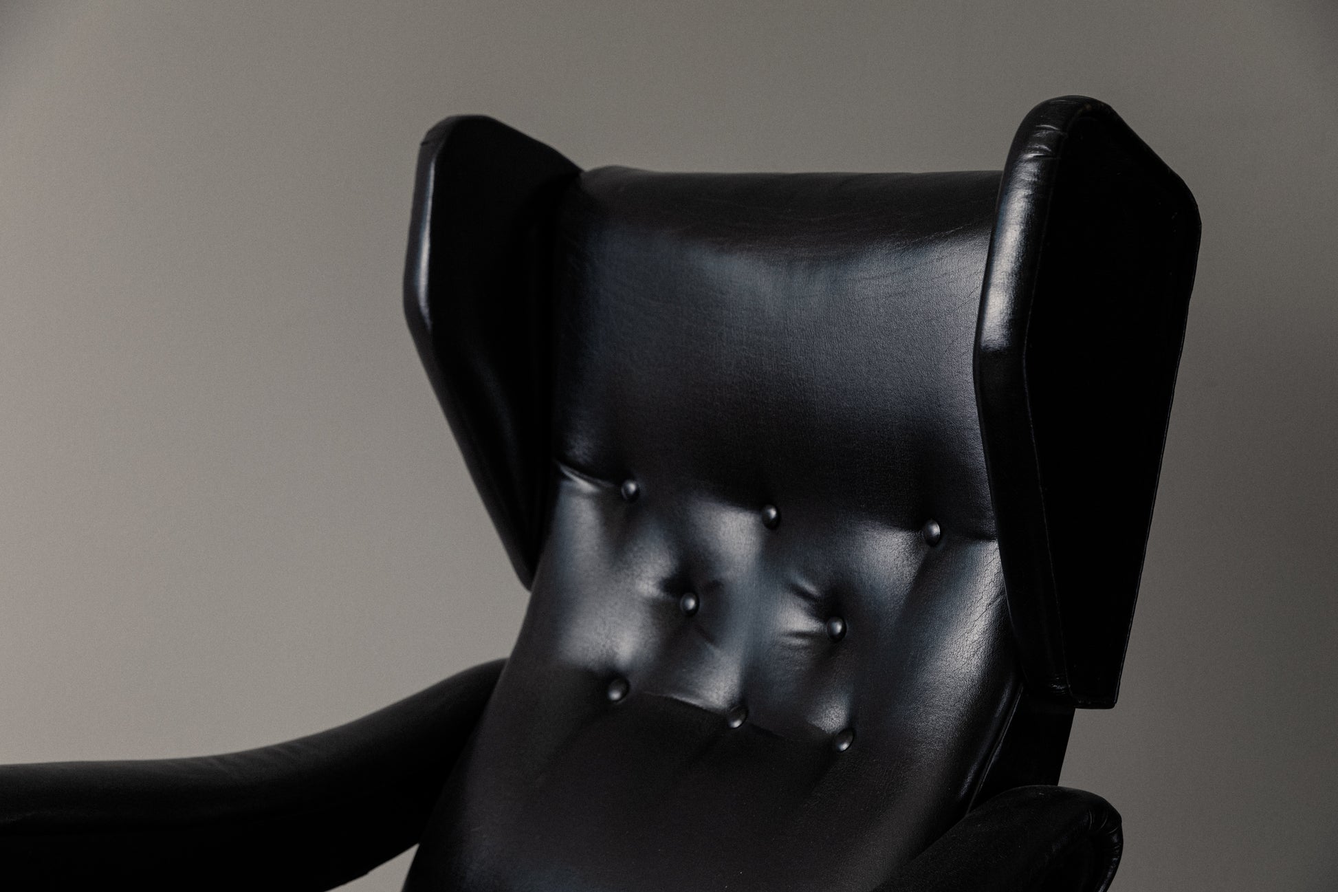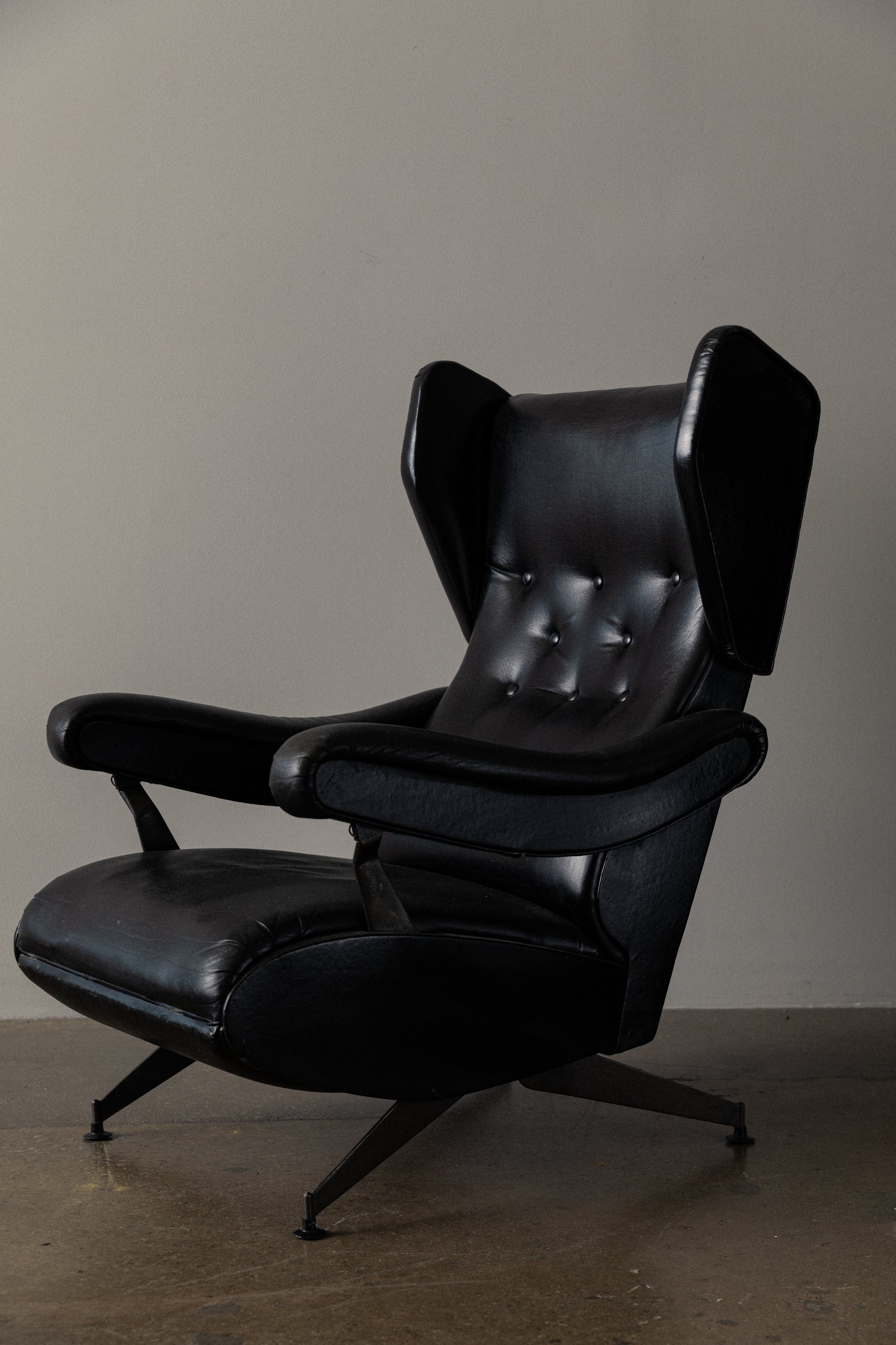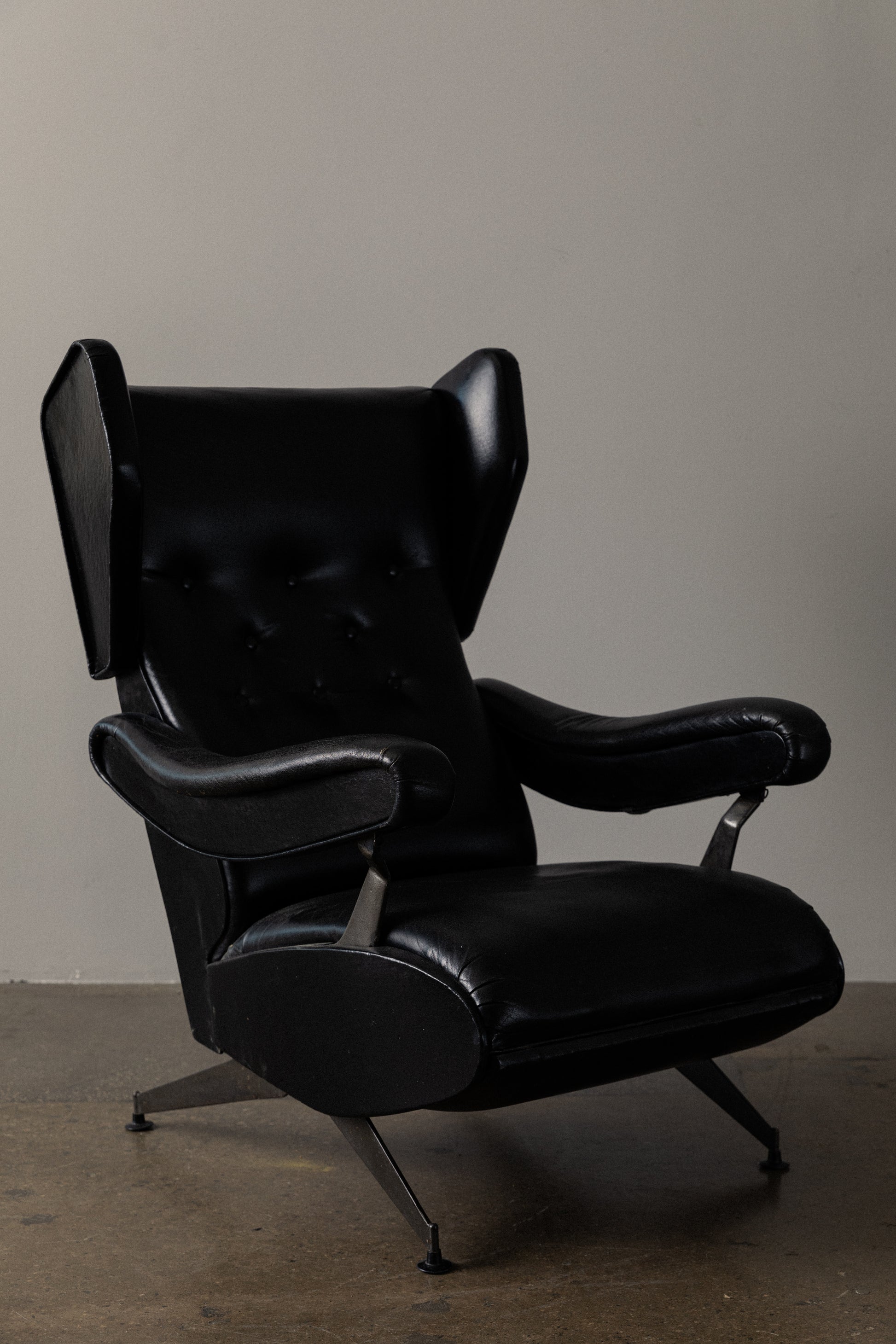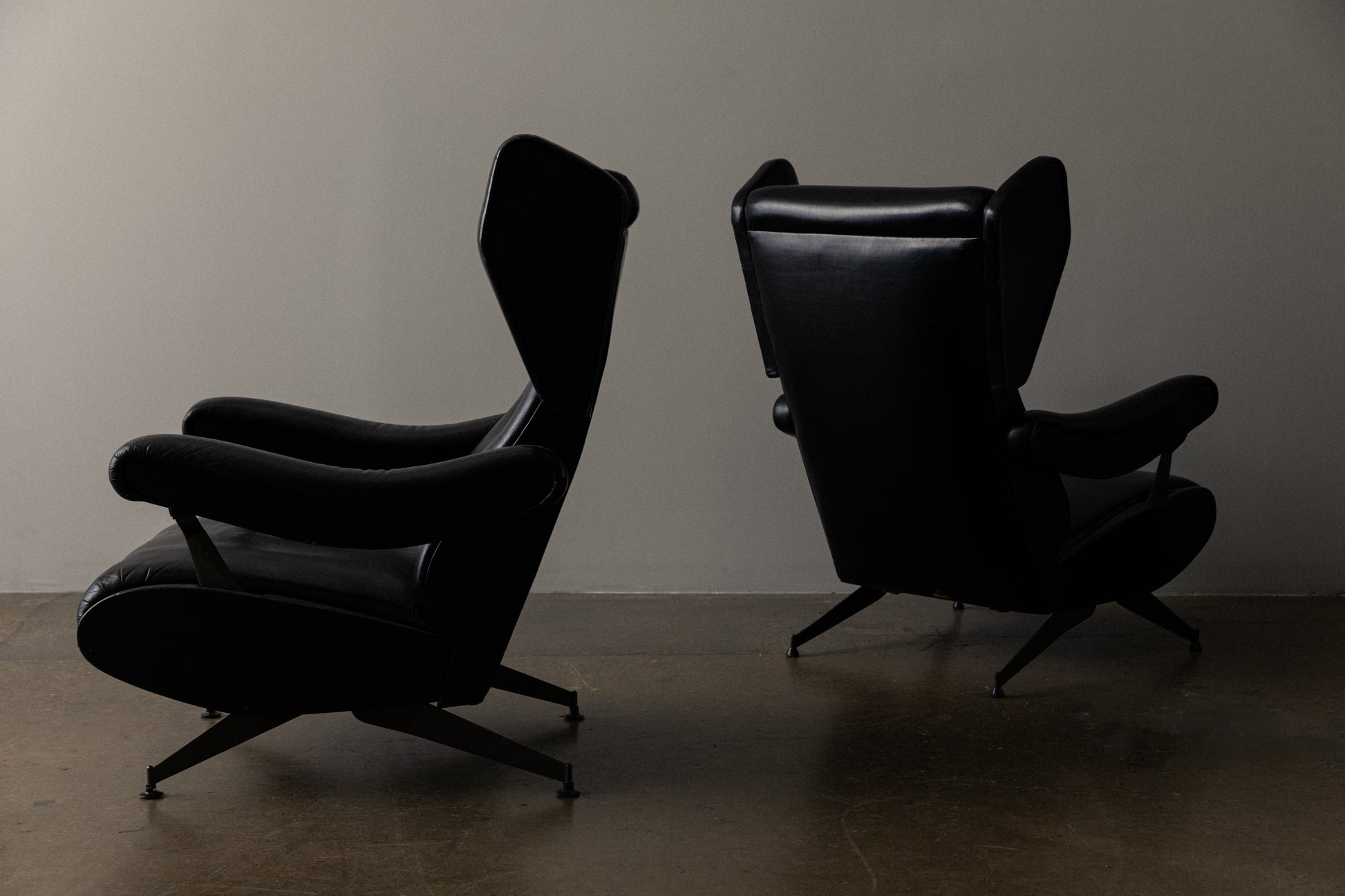 Italy, 1950's: Striking and sculptural, this pair of armchairs by Italian designer Nello Pini exemplifies bold mid-century design. Featuring dramatic winged headrests and wide, angular armrests, the chairs are upholstered in original black leather with button-tufted backs and plush cushions. Resting on splayed metal legs, the chairs offer a commanding silhouette while maintaining comfort and style.