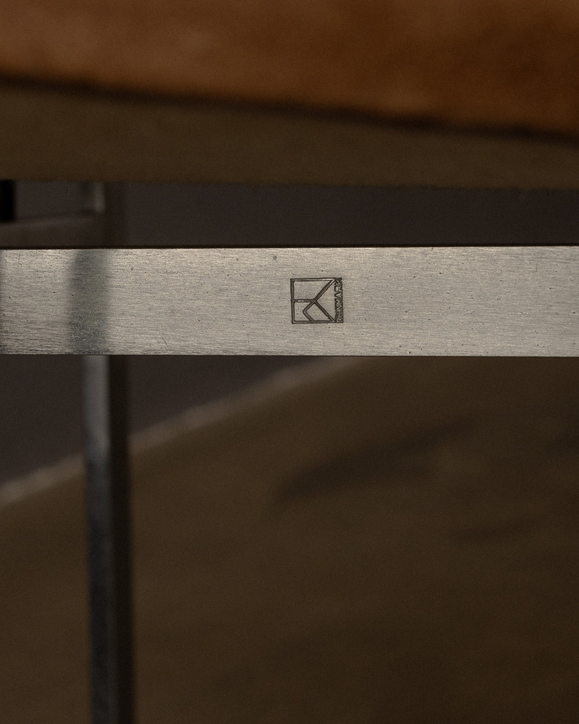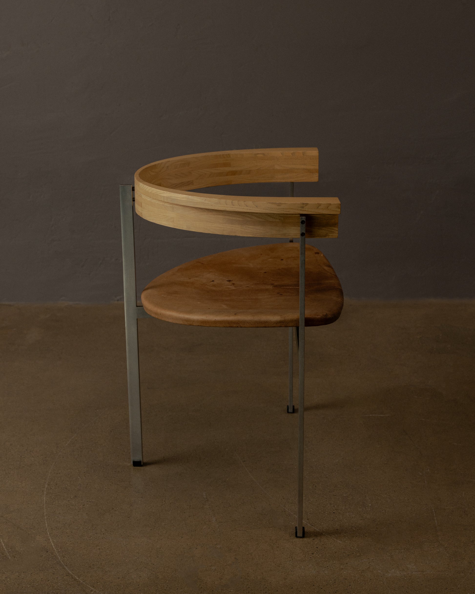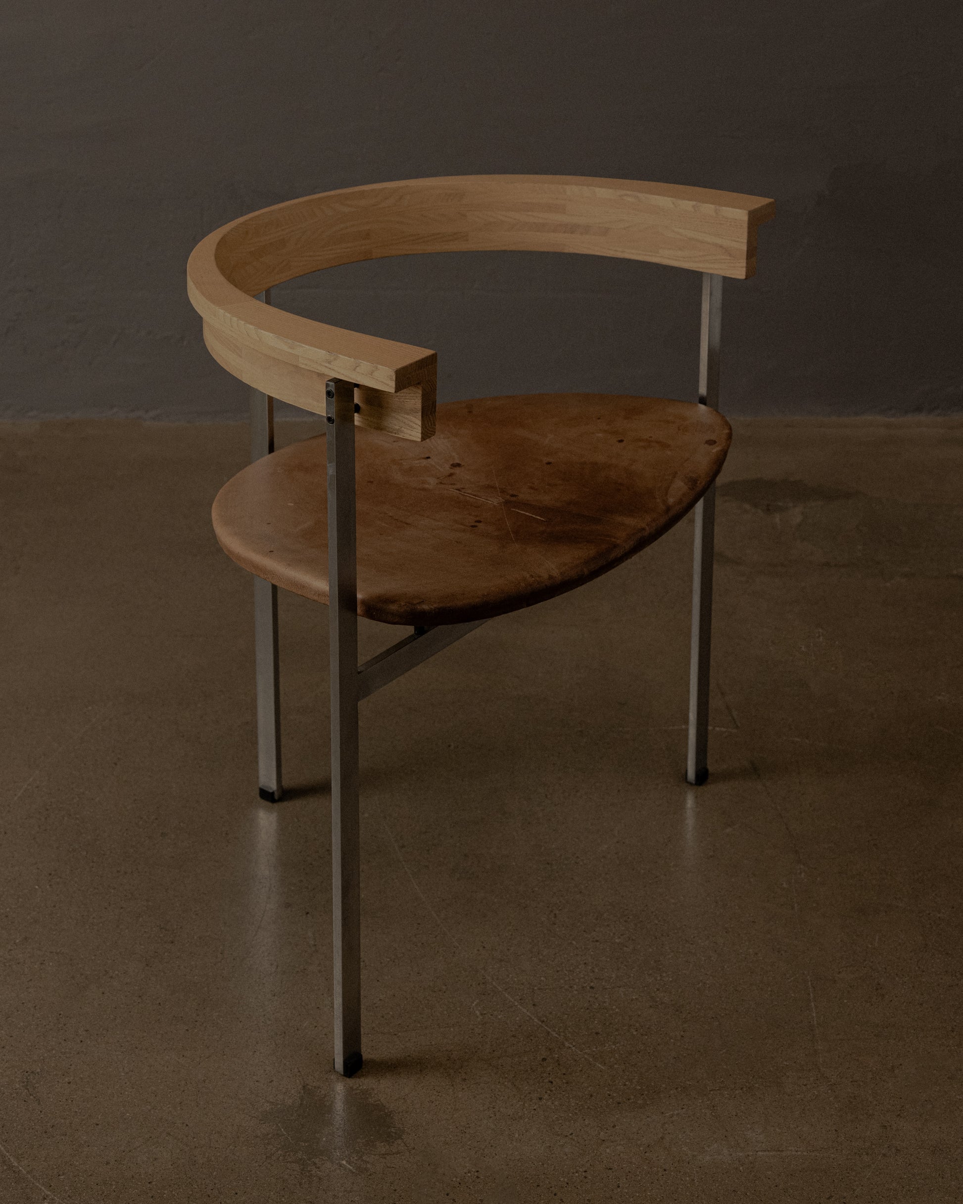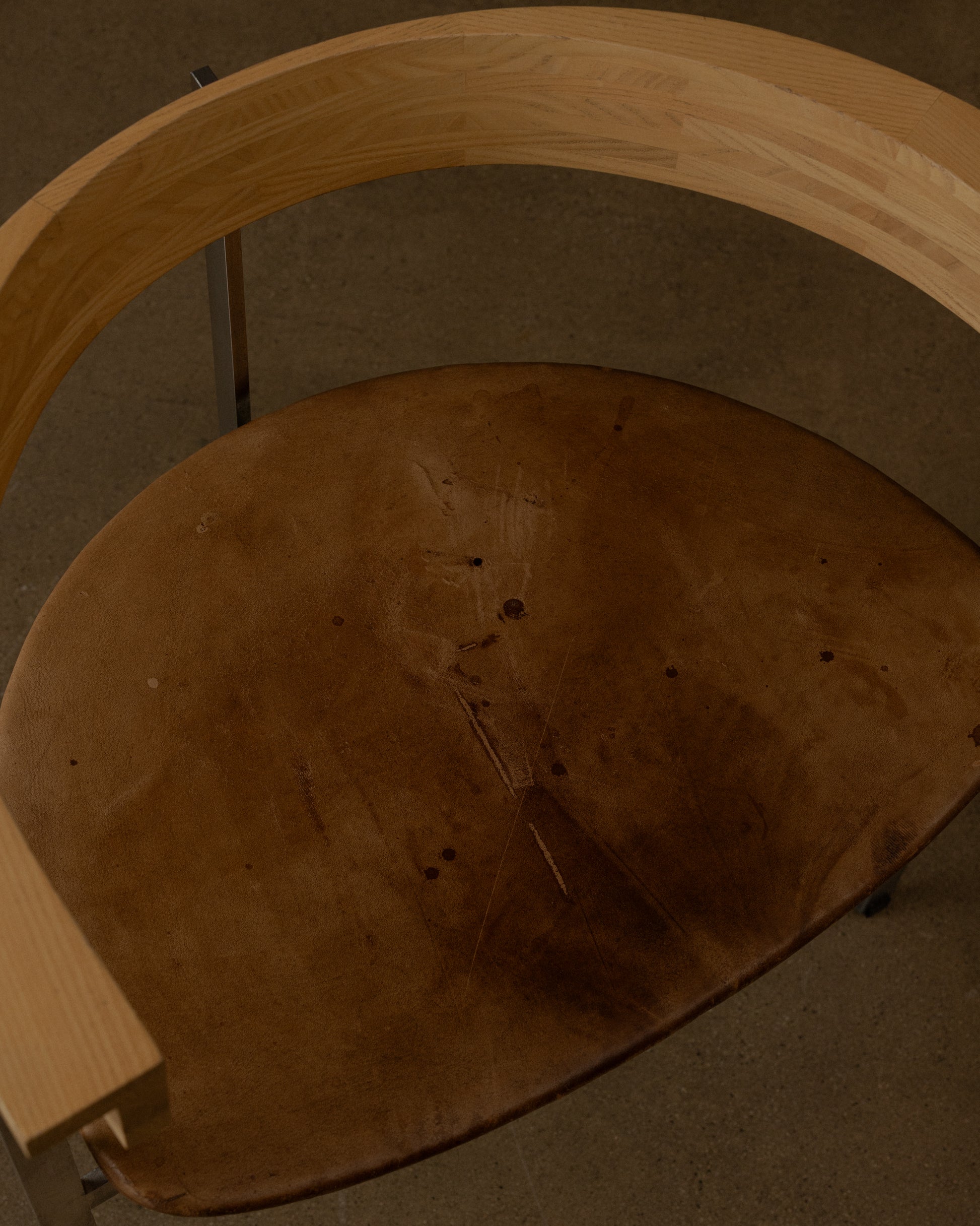 Designed by Poul Kjærholm and produced by E. Kold Christensen, this early edition features a brushed steel frame, a sculptural ash wood backrest, and a patinated leather seat.