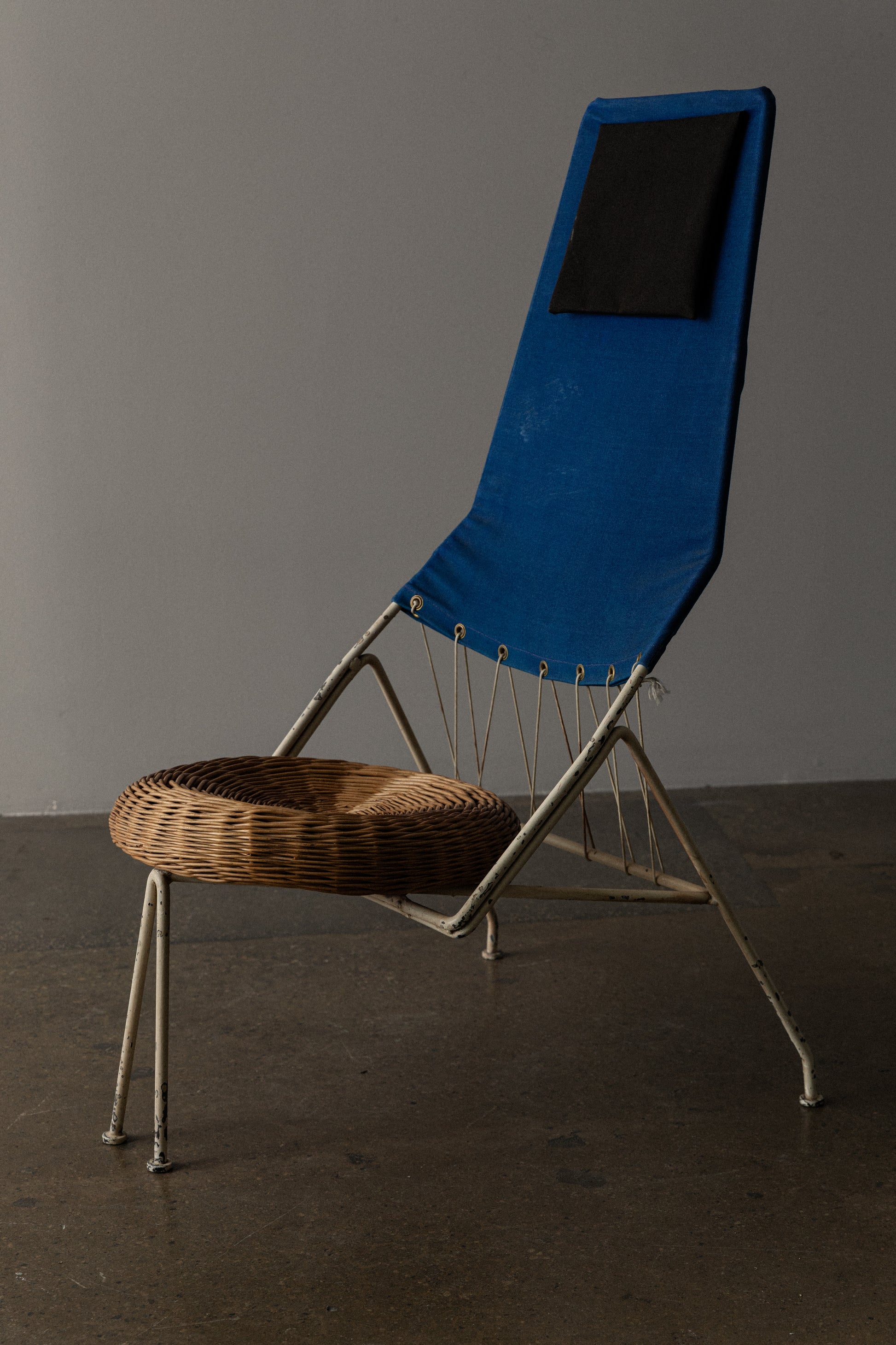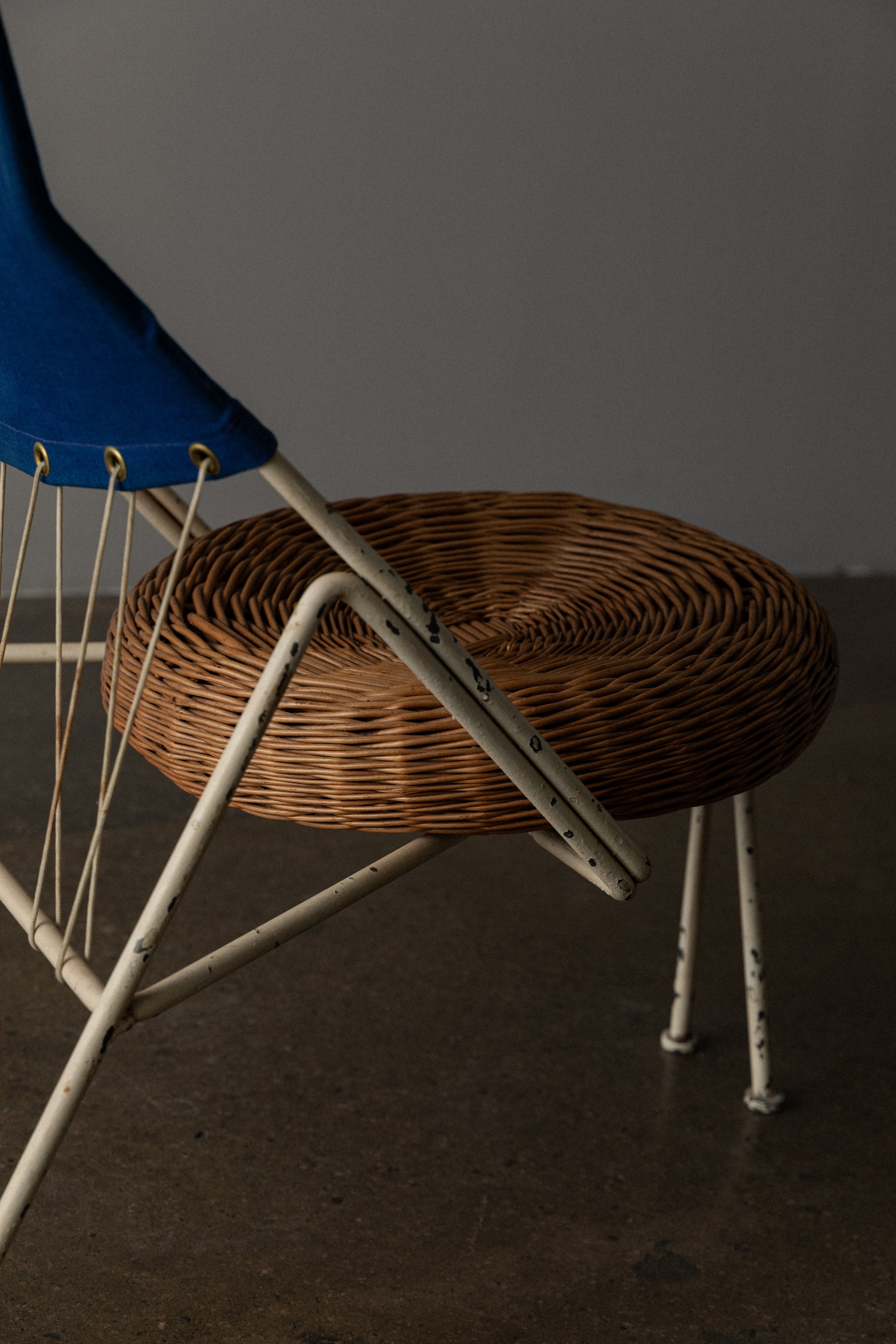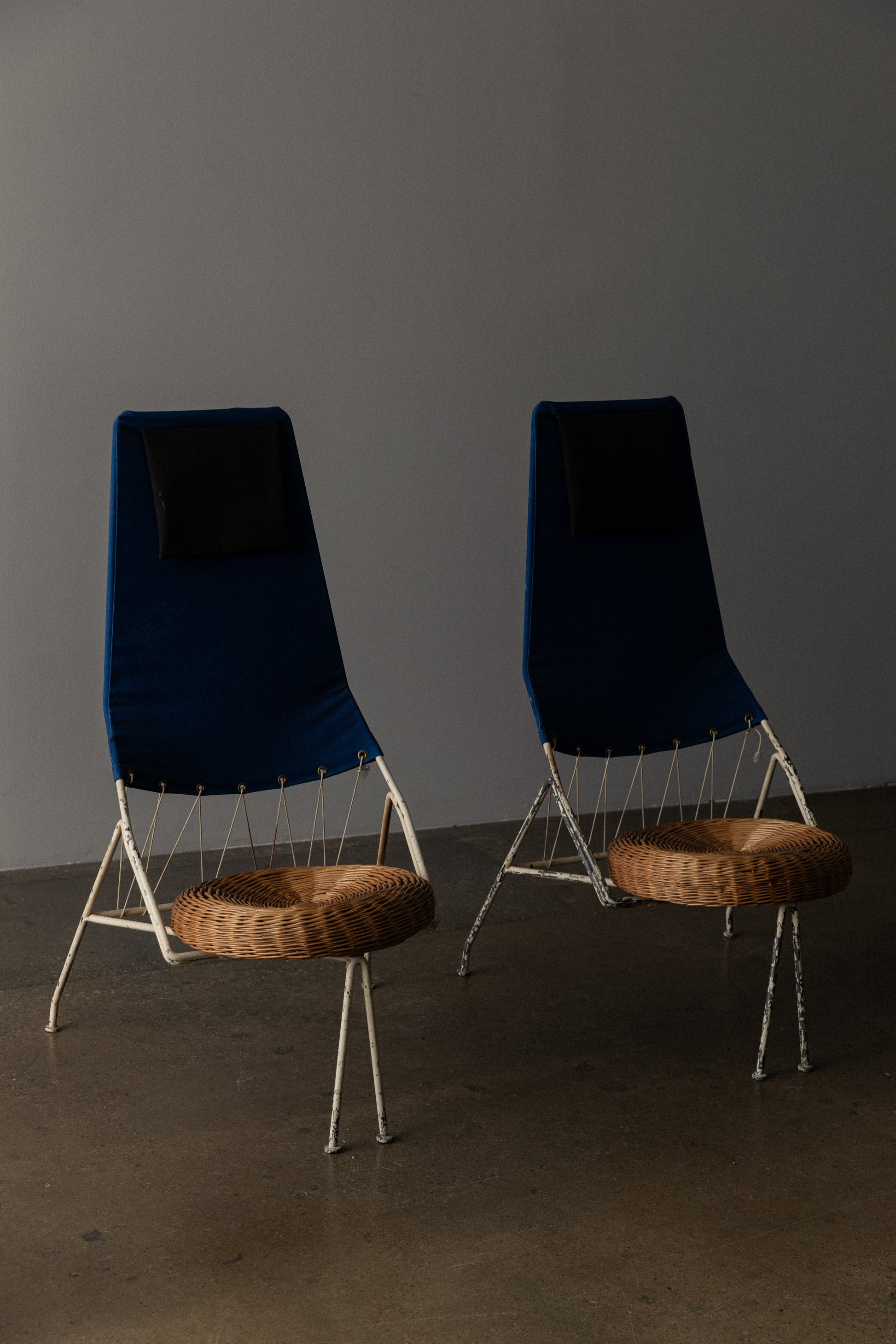 Designed by mid-century modern designer Tony Paul, this pair of Triangular Lounge Chairs exemplifies the bold experimentation with form and material that defined the era. The chairs feature a distinctive triangular frame made from durable metal, which elegantly supports the seat and backrest. The unique combination of natural wicker seats and fabric sling backrests adds a juxtaposition of rustic charm and minimalist industrial design.