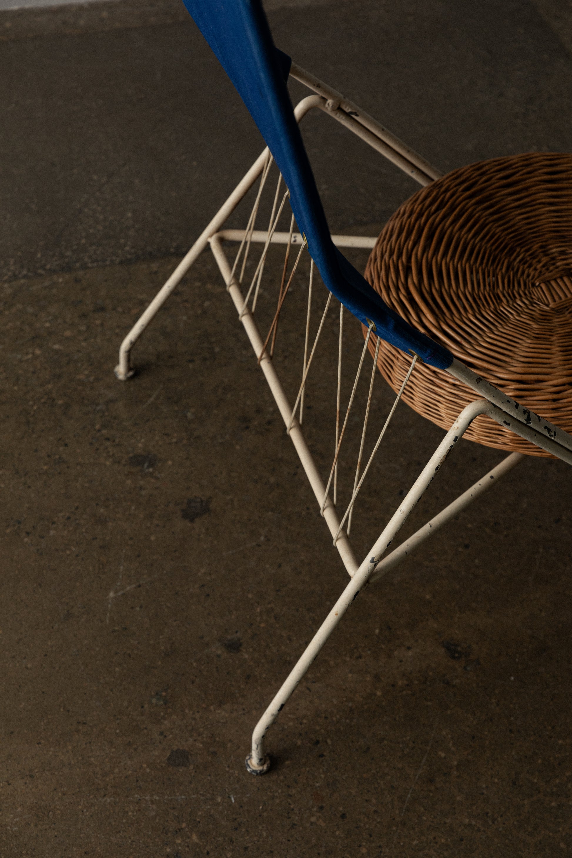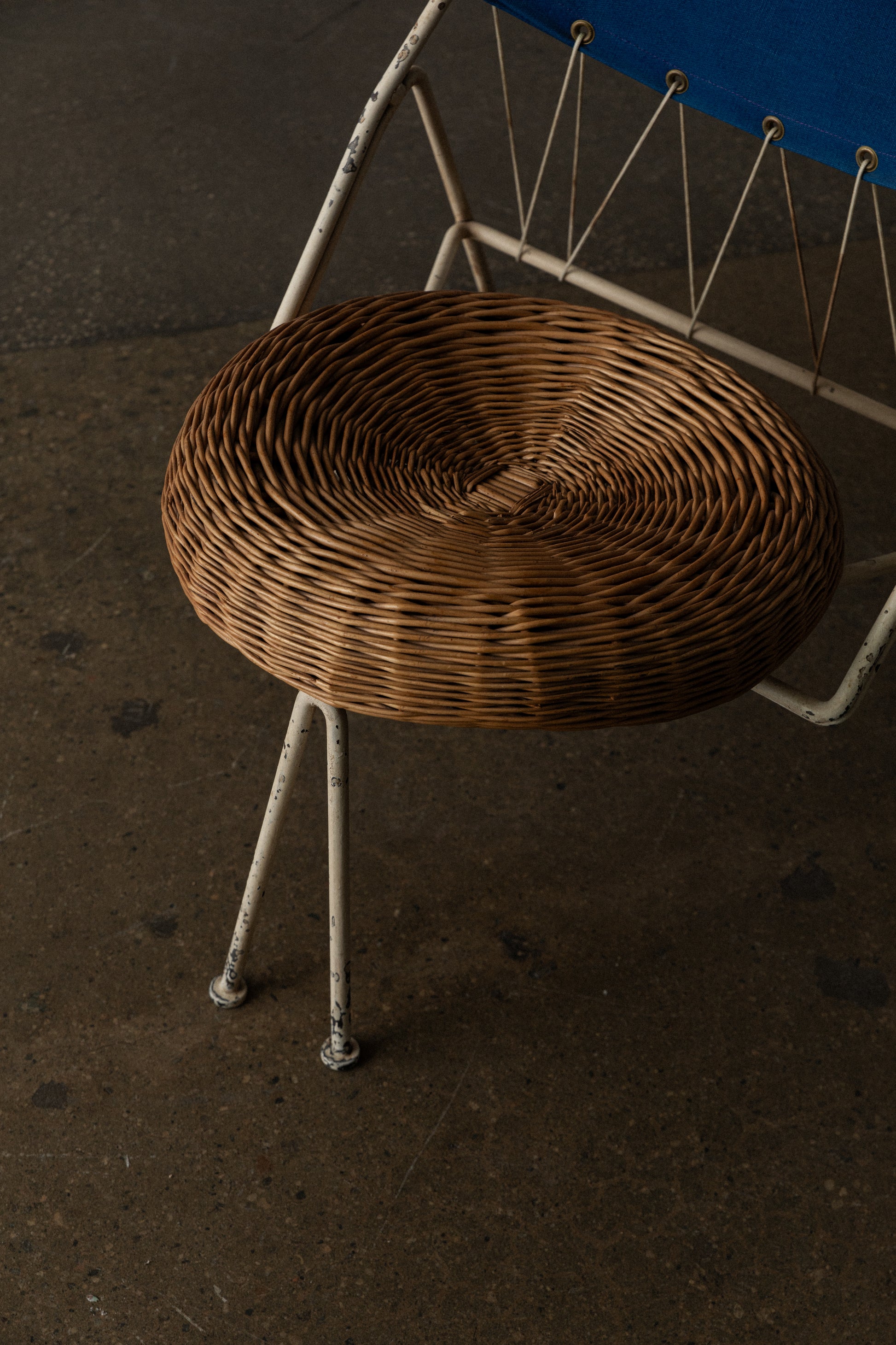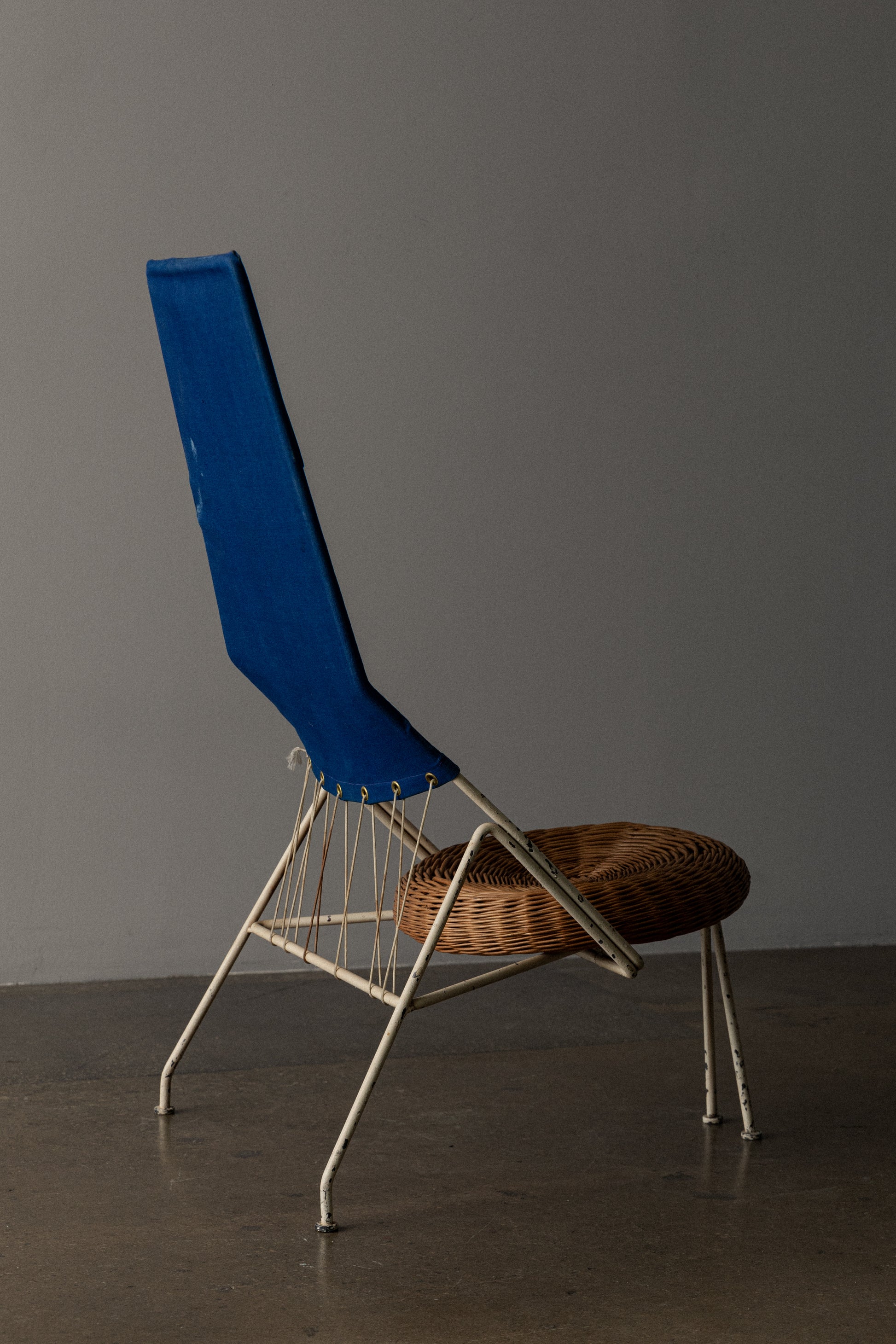 Designed by mid-century modern designer Tony Paul, this pair of Triangular Lounge Chairs exemplifies the bold experimentation with form and material that defined the era. The chairs feature a distinctive triangular frame made from durable metal, which elegantly supports the seat and backrest. The unique combination of natural wicker seats and fabric sling backrests adds a juxtaposition of rustic charm and minimalist industrial design.