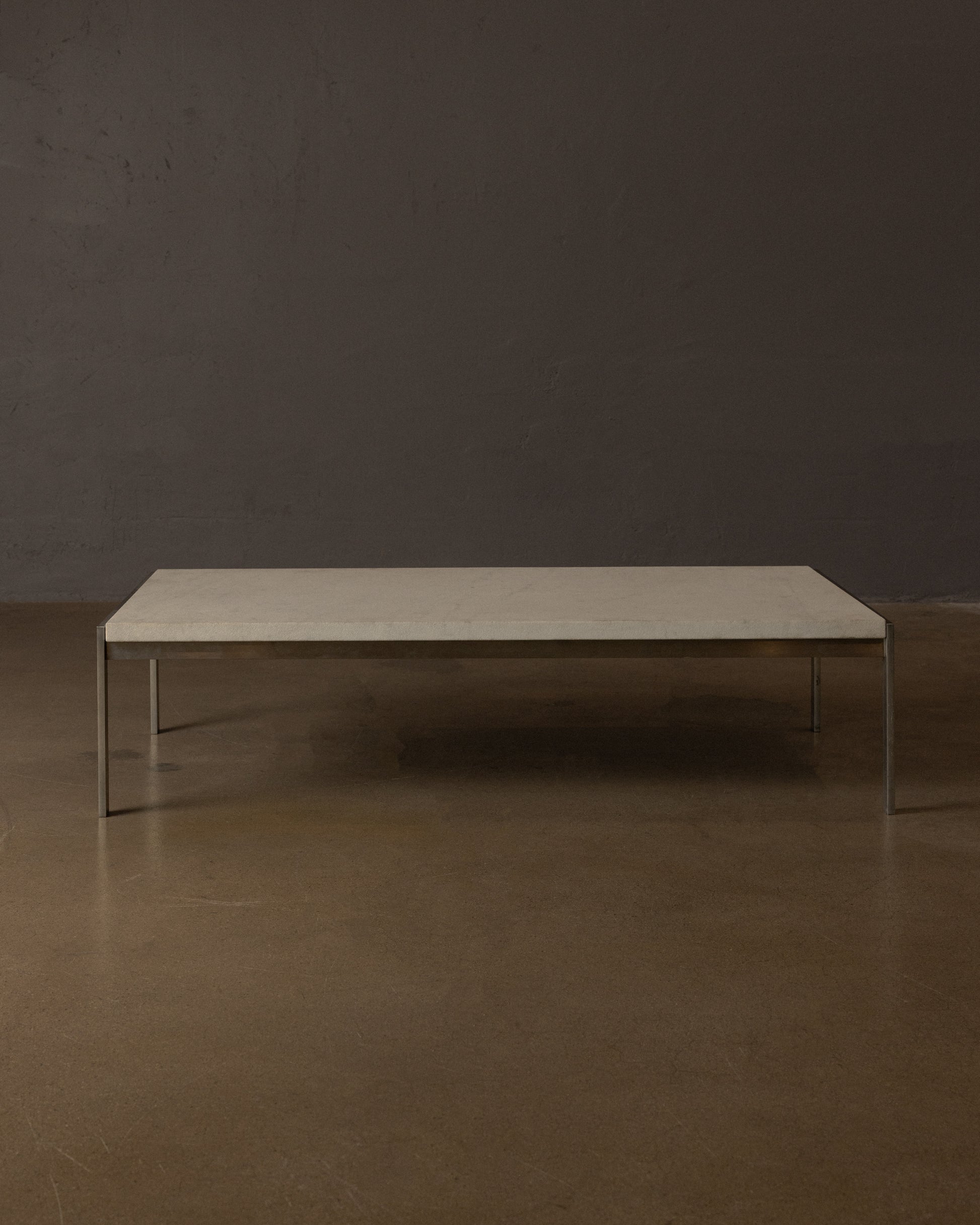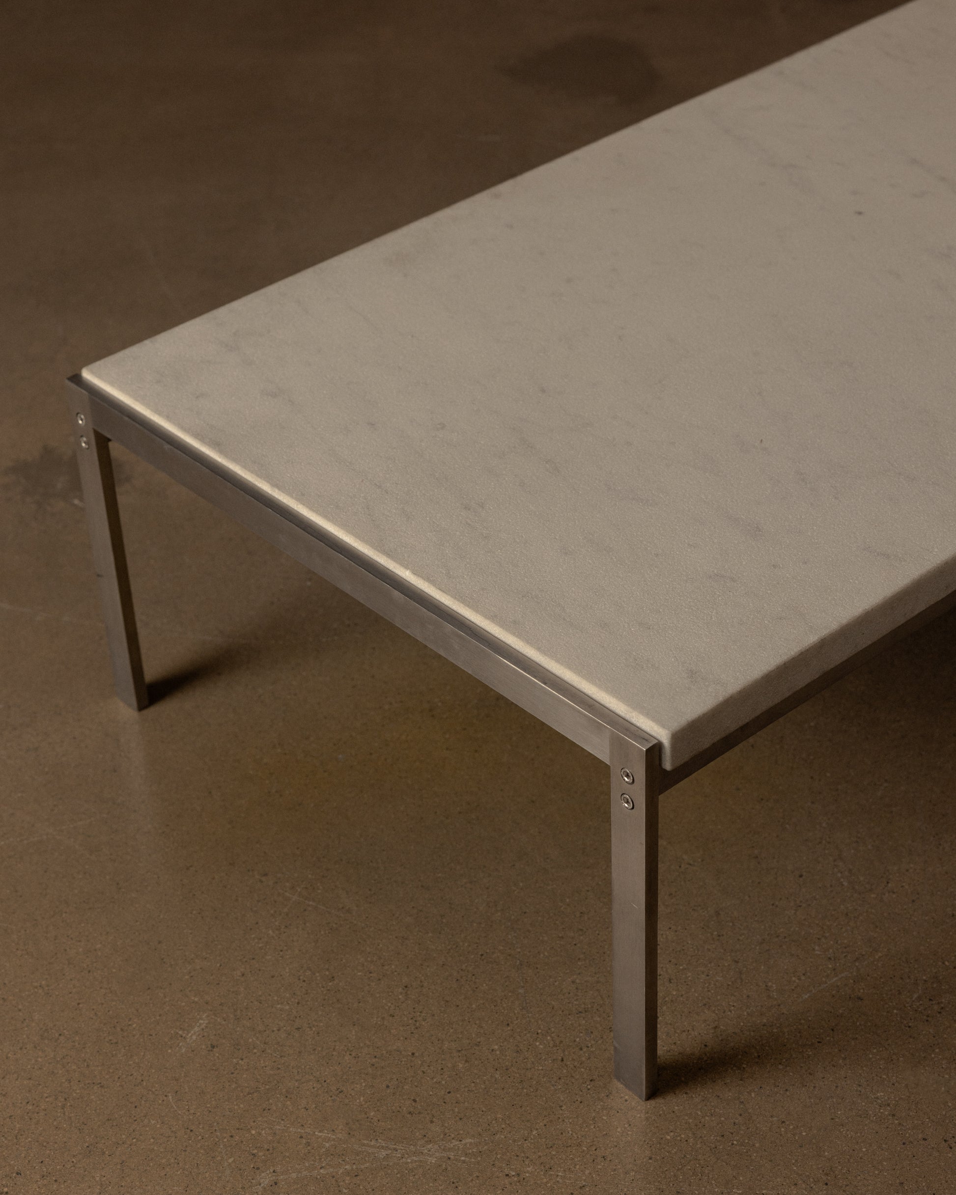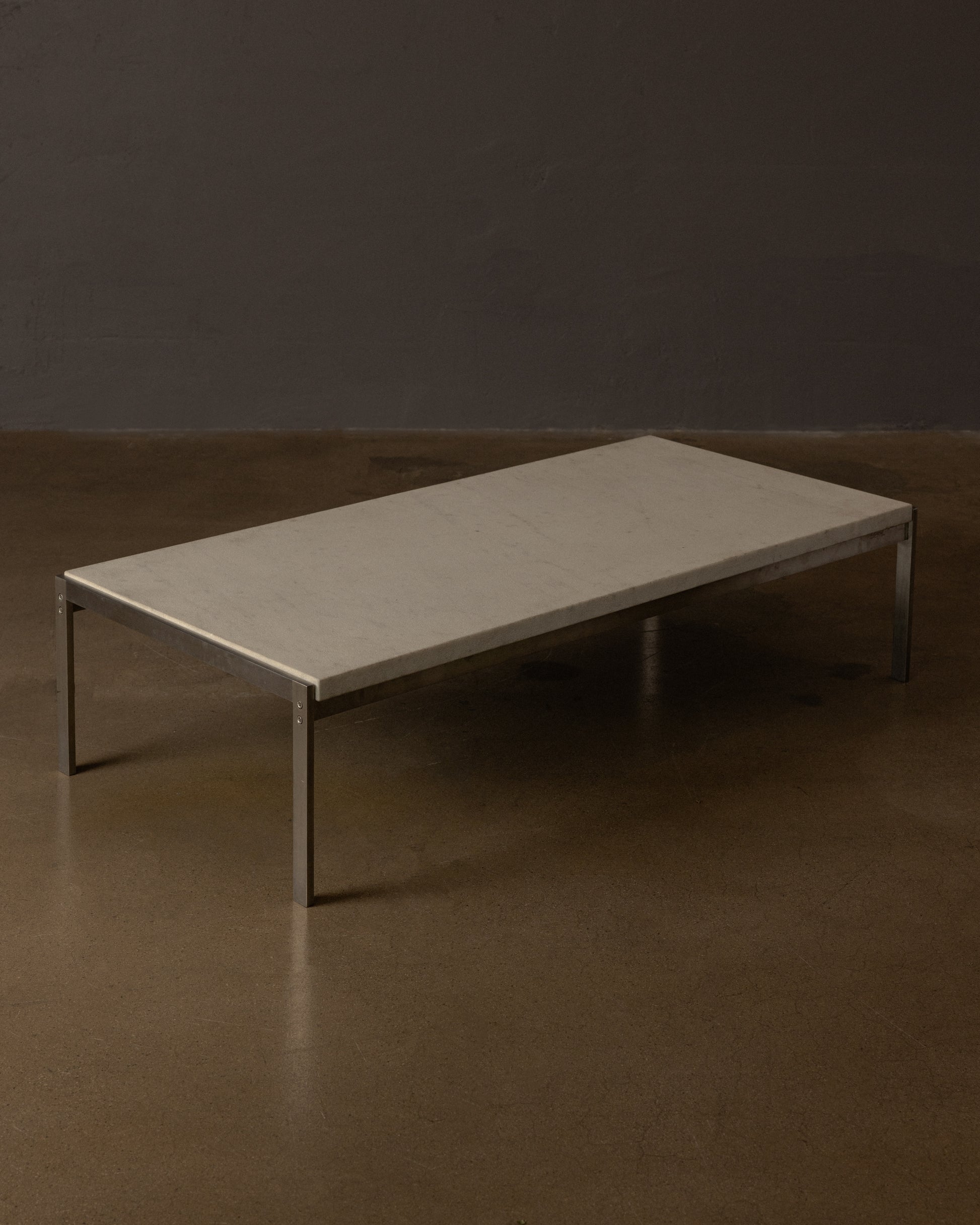 Denmark: This early production piece, crafted by E. Kold Christensen, features a subtly honed white marble top set atop a brushed stainless steel base. The sculptural frame is etched with the original Kold Christensen maker’s mark.