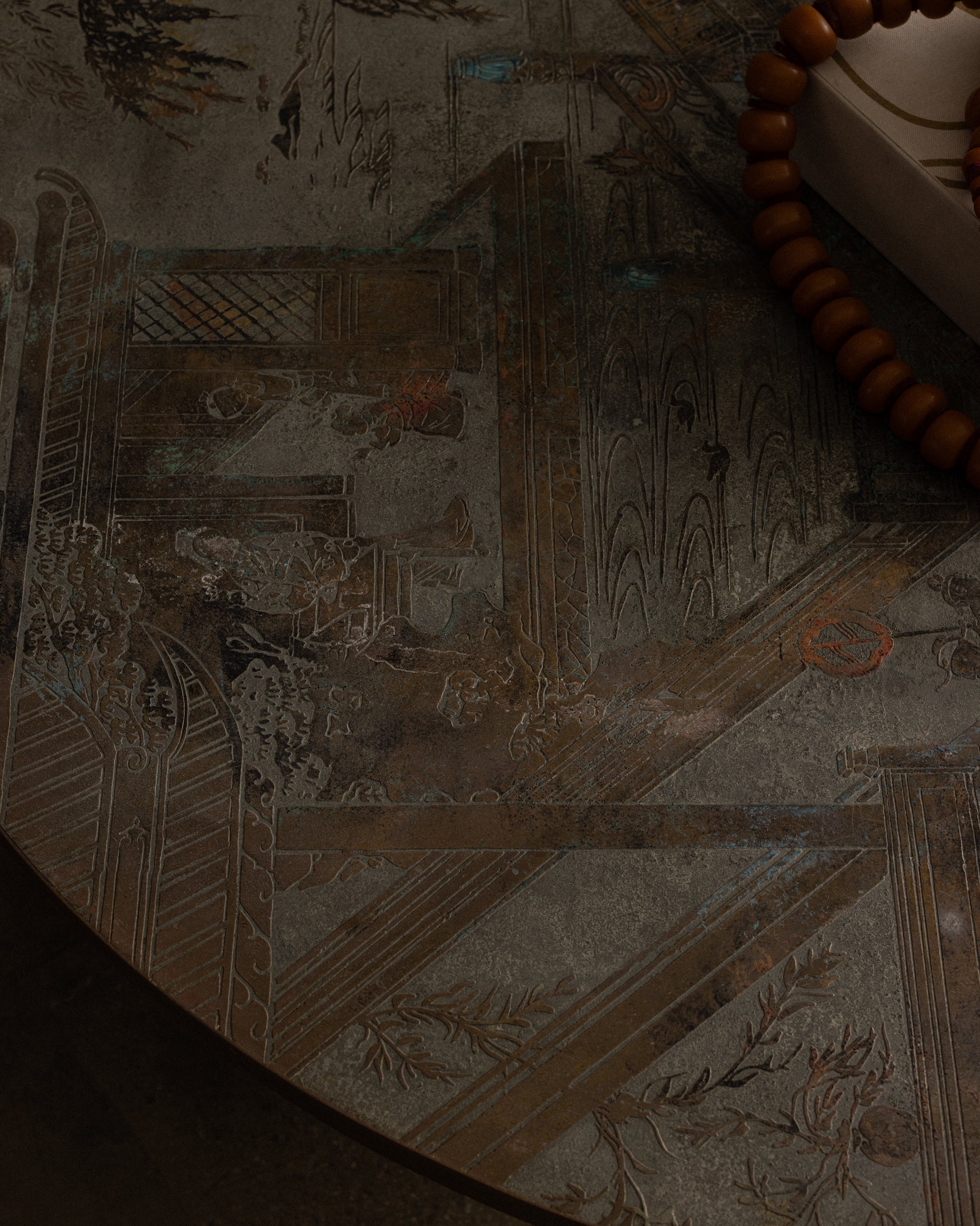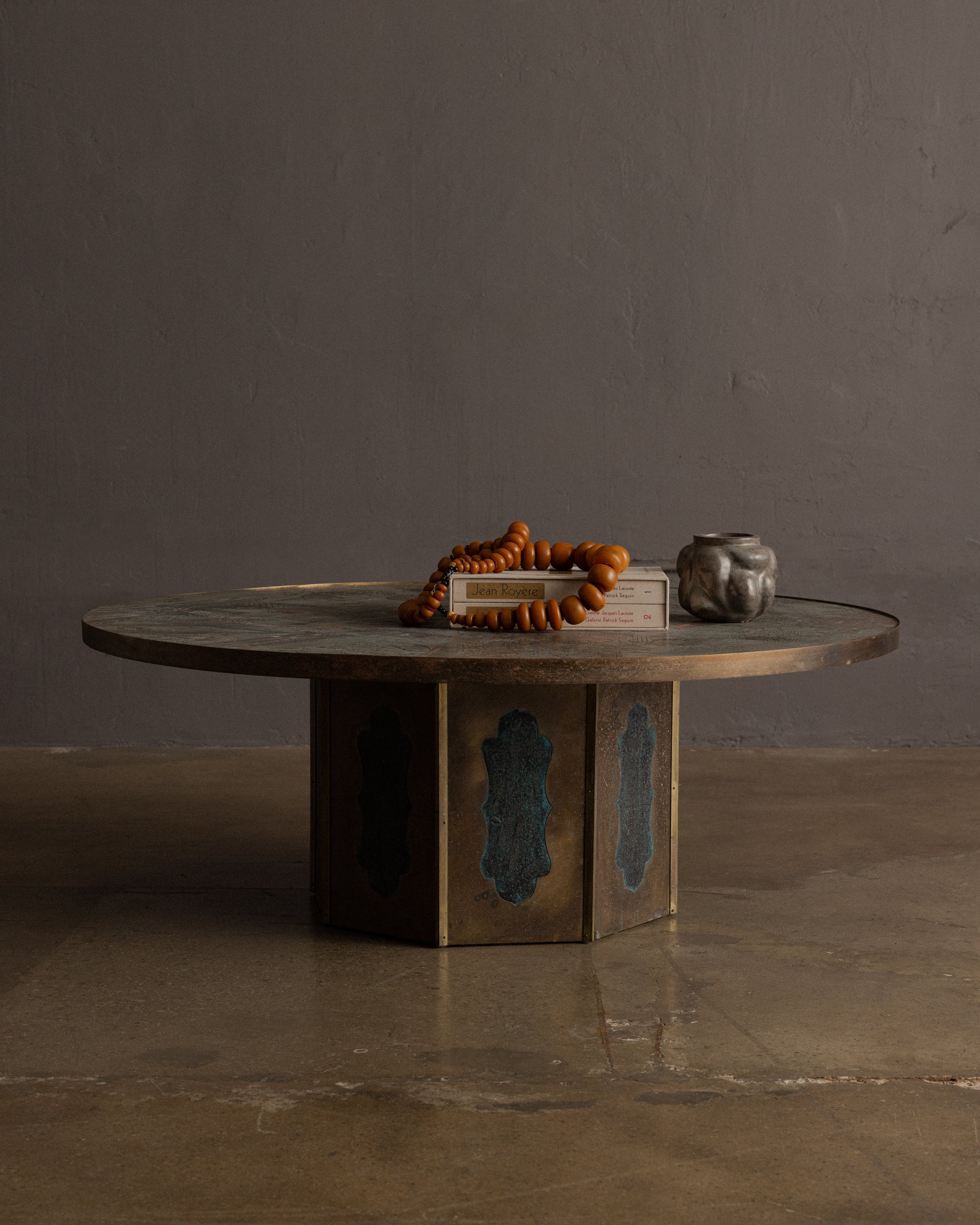A striking circular coffee table by Philip and Kelvin LaVerne from their iconic “Chan” series, crafted in the 1960s. The etched bronze and pewter tabletop depicts intricate chinoiserie scenes, rendered in a patinated, multicolored surface that highlights the artists' signature fusion of fine art and furniture design. Resting on a patinated brass octagonal base inset with enameled turquoise panels, this piece is both sculptural and functional.