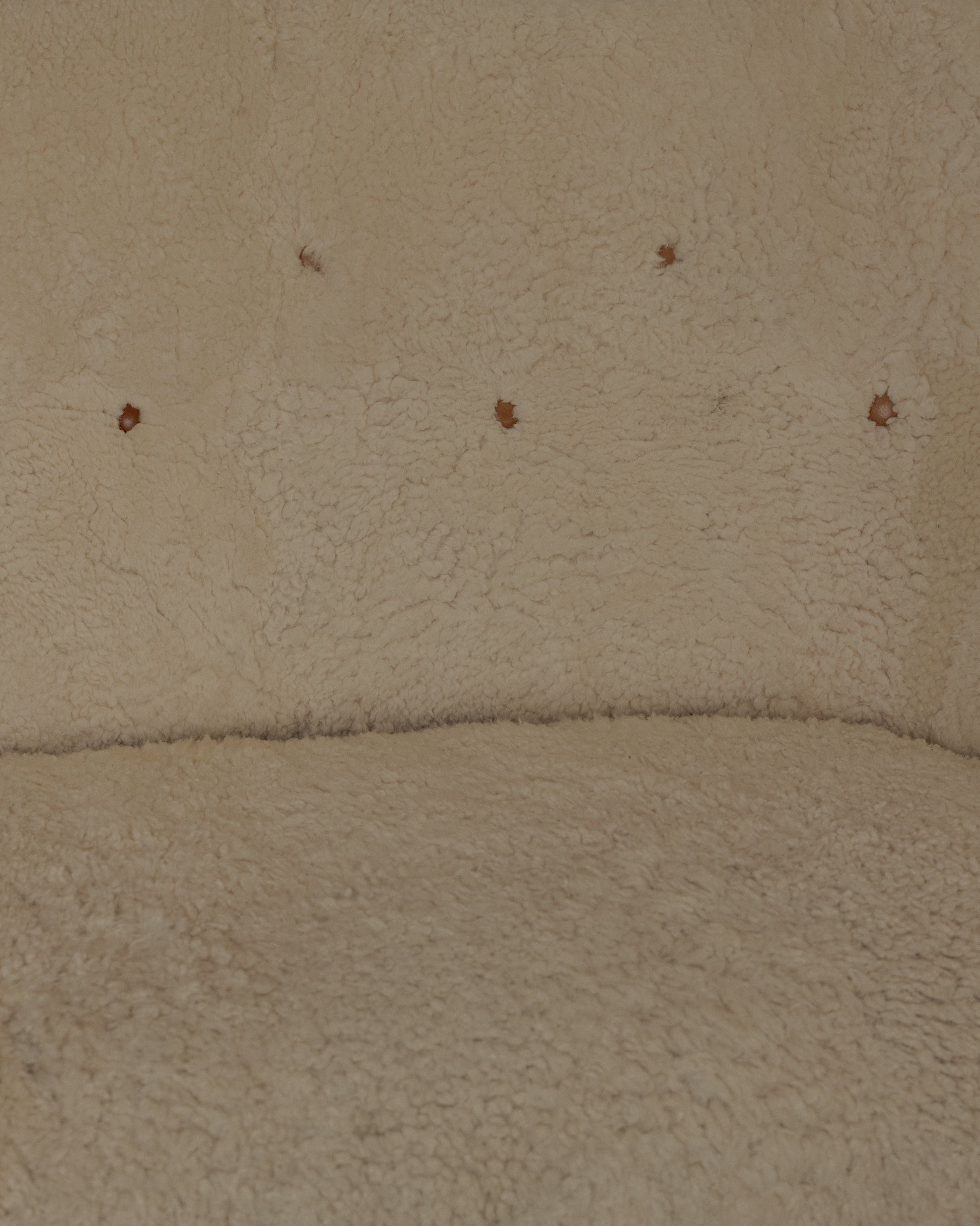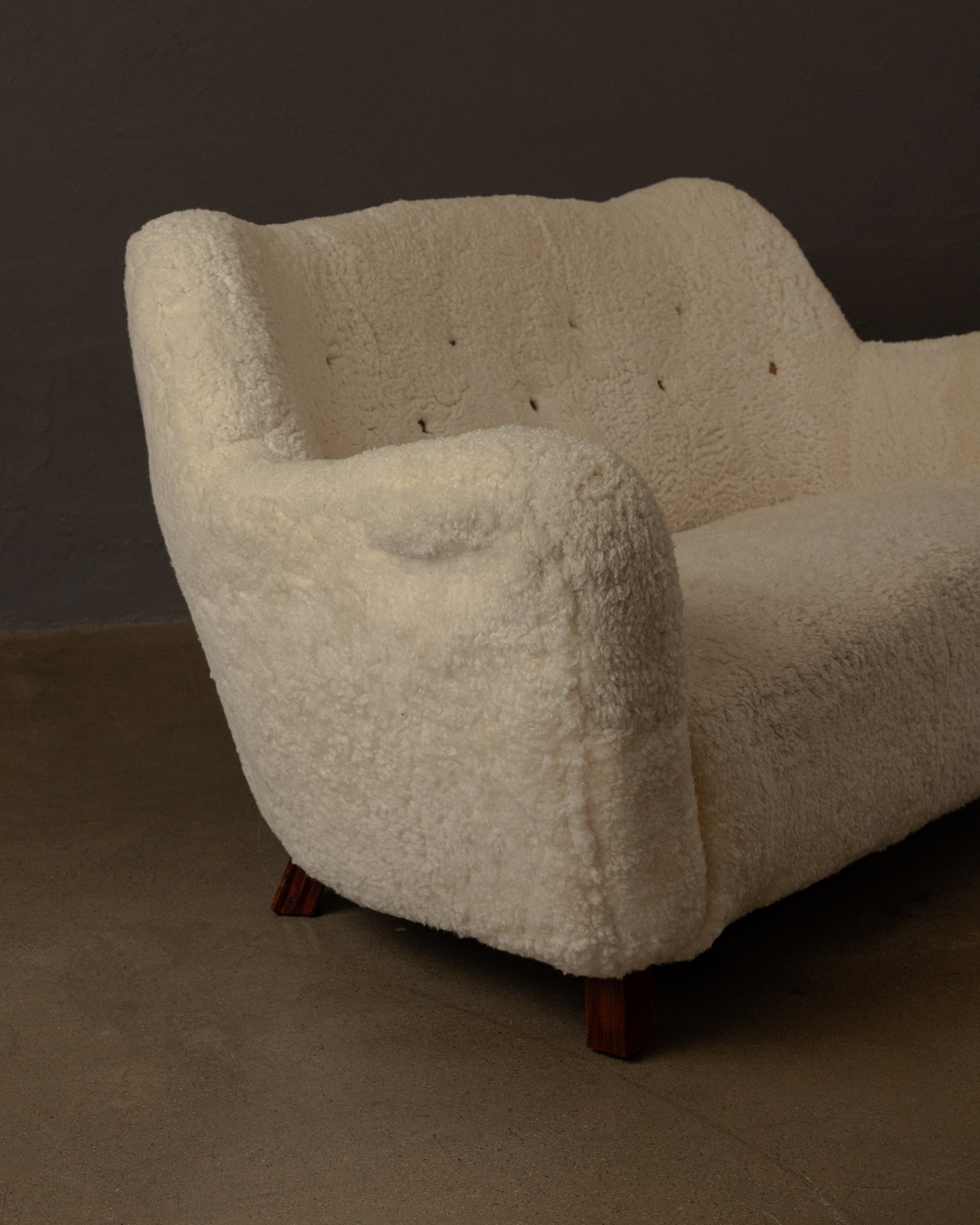 Scandinavian sheepskin sofa featuring a gently curved backrest, rounded arms, and button tufting, this piece blends Scandinavian warmth with modernist elegance.