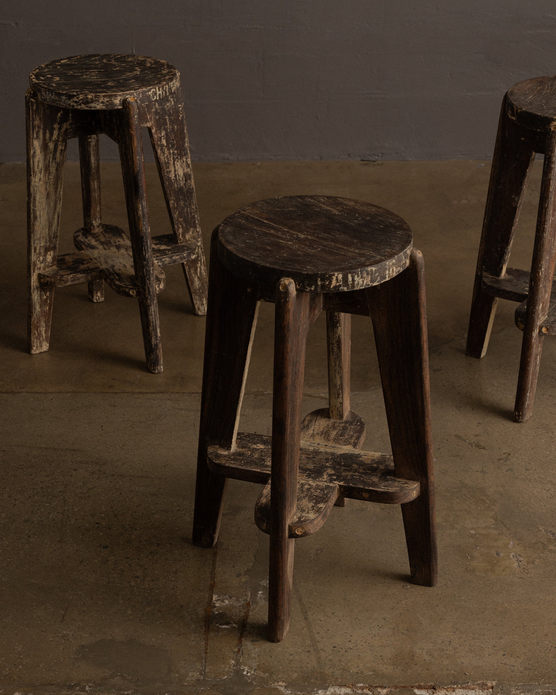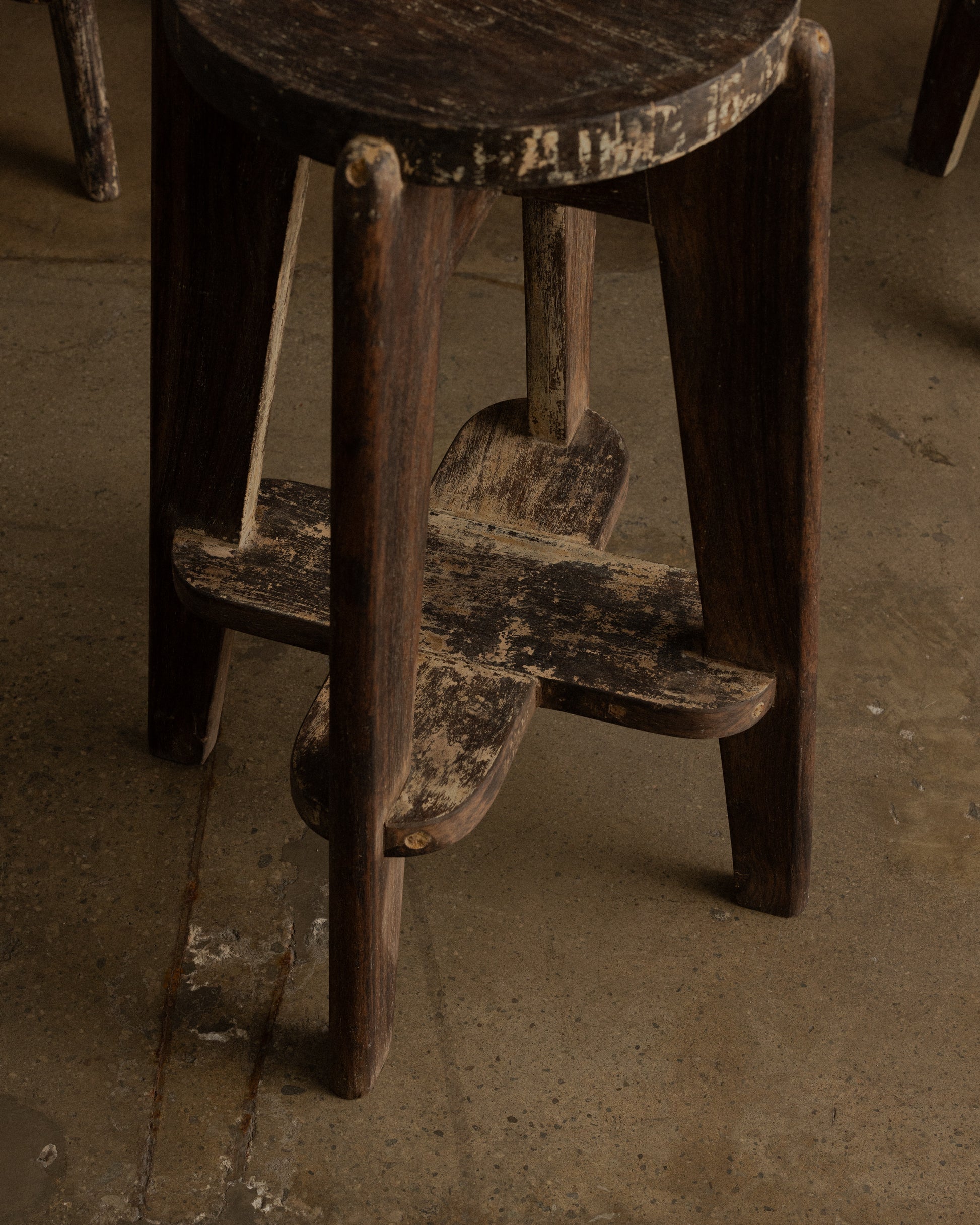 Set of four stools from the Science Block at Punjab University, Chandigarh, circa 1965, by Pierre Jeanneret. Produced in France and India in teak.