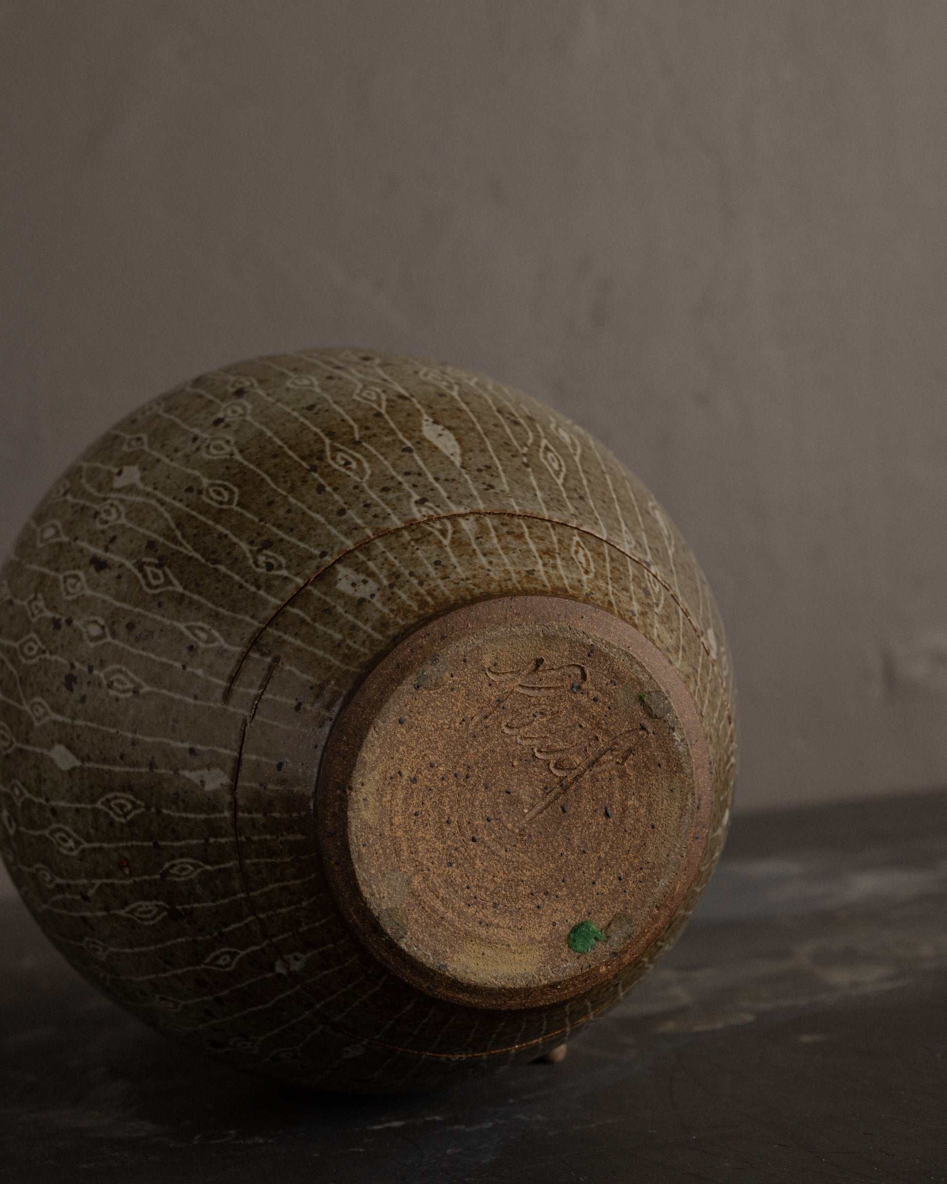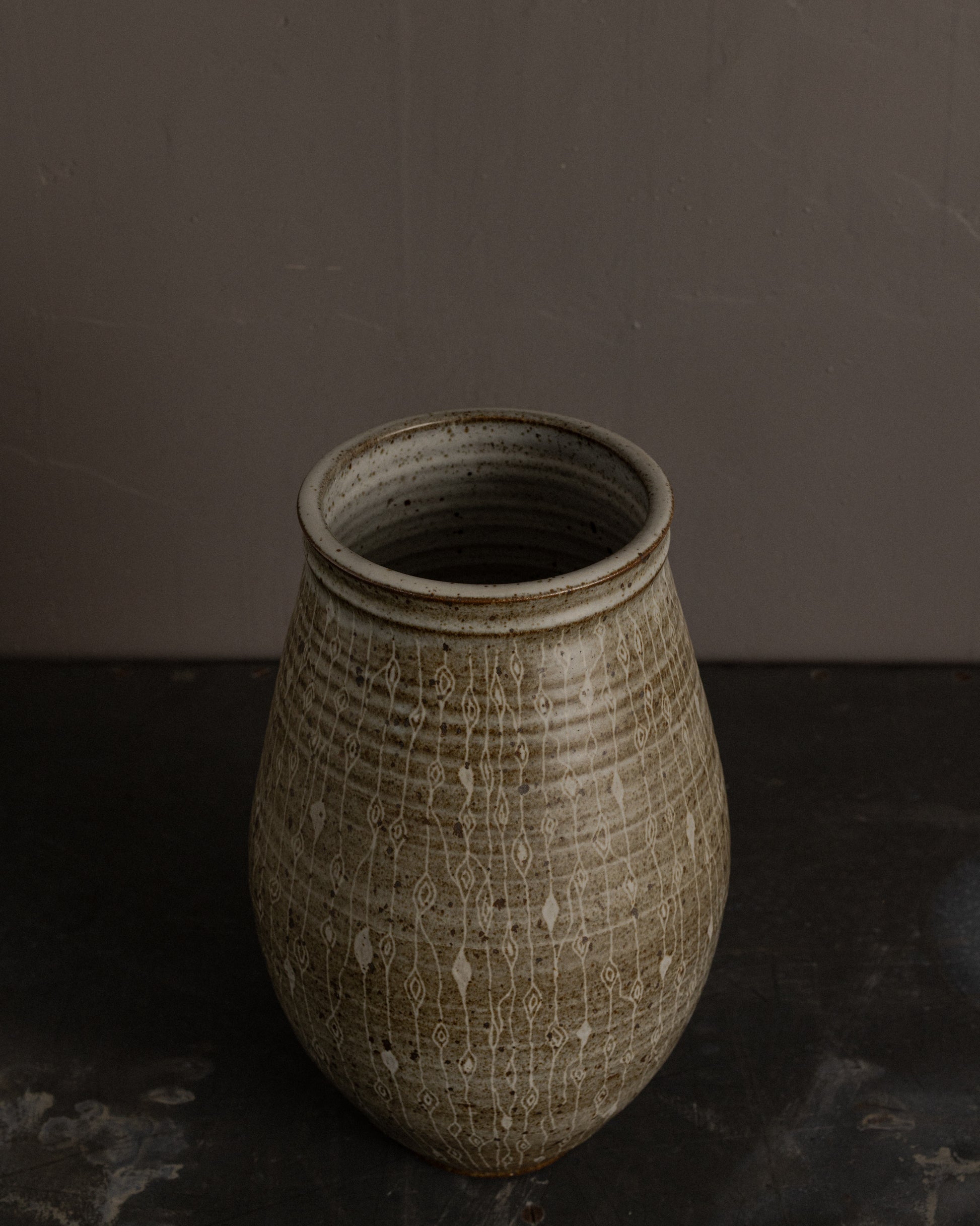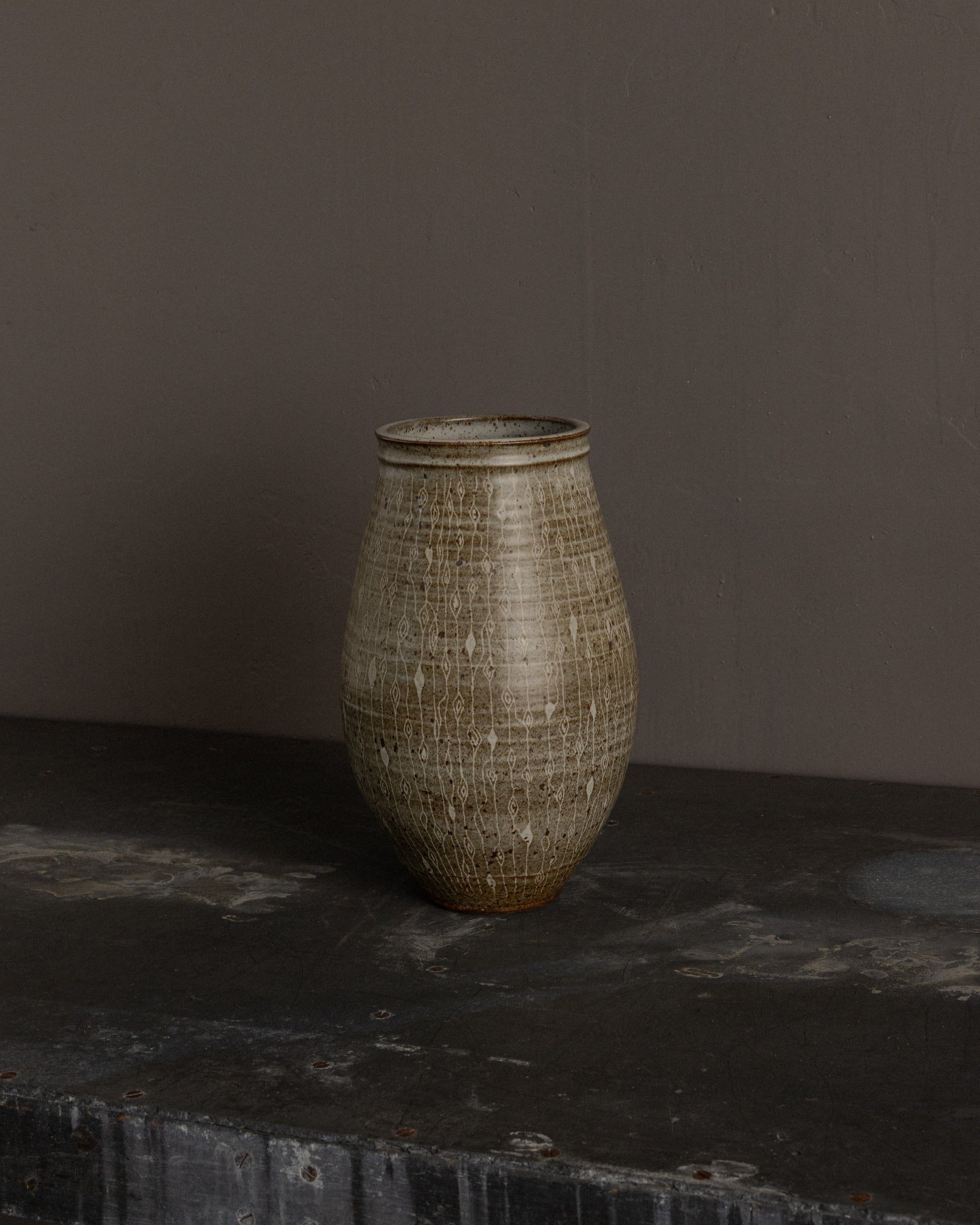 USA, mid-late 20th century: Hand-thrown studio ceramic vessel featuring a tall, tapered form and a finely worked surface. The exterior is decorated with an allover sgraffito pattern of vertical linear motifs punctuated by repeating almond-shaped elements, incised through a softly mottled glaze. The glaze palette ranges from warm stone and taupe to subtle iron speckling, with natural firing variations that add depth and movement. The rim is gently flared and finished with a darker glazed edge, providing contrast and definition. The base is unglazed and bears an incised maker’s signature, consistent with mid-century studio pottery practices.
