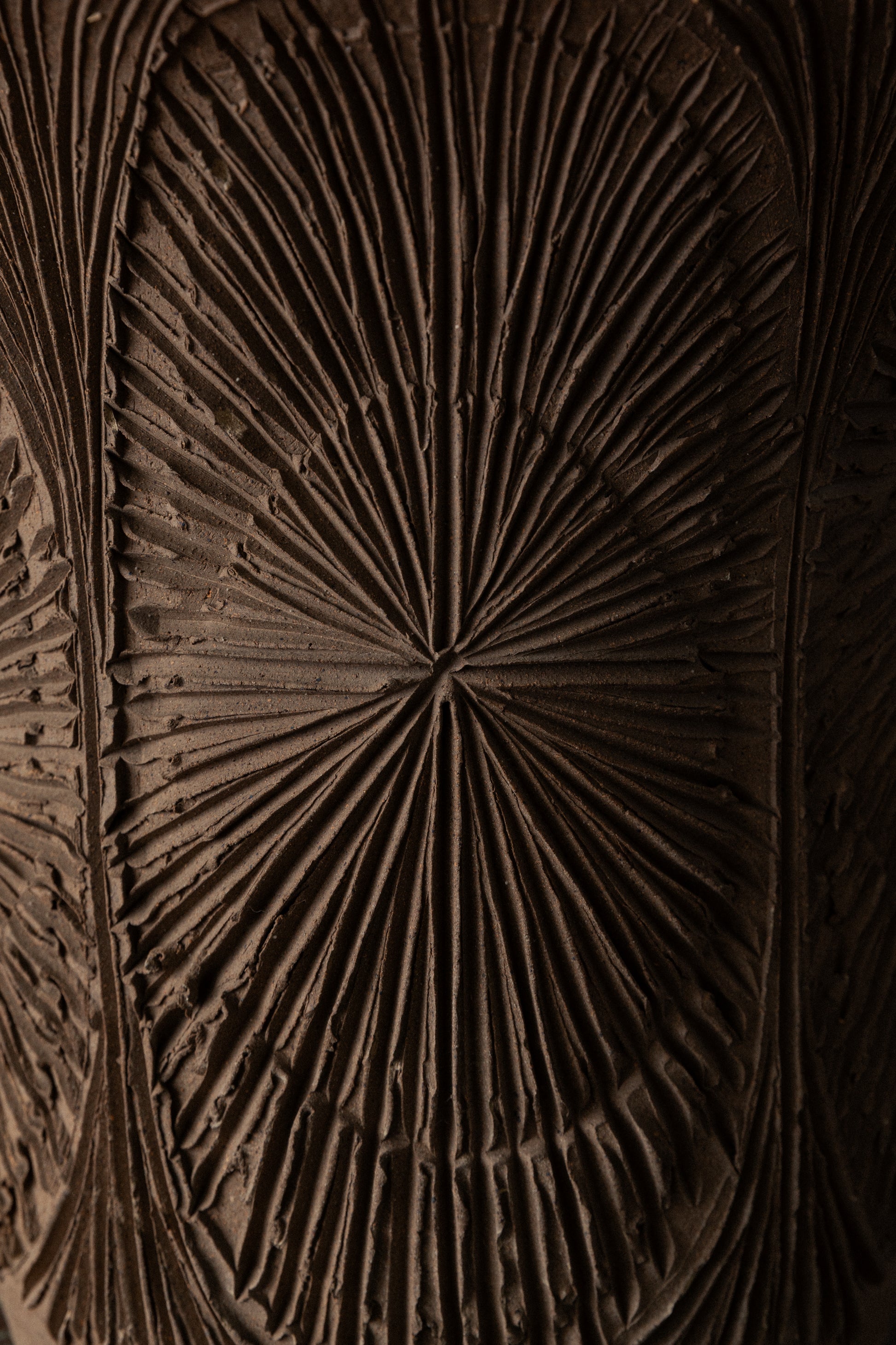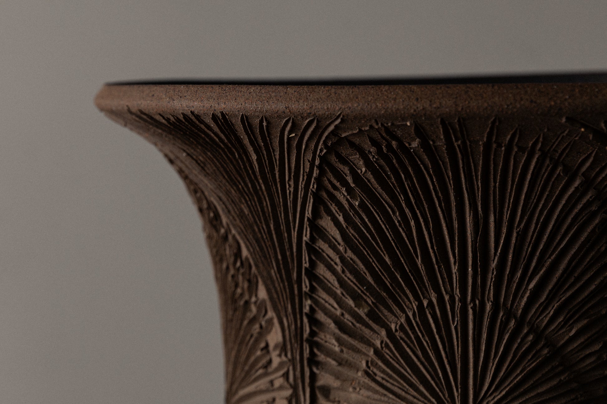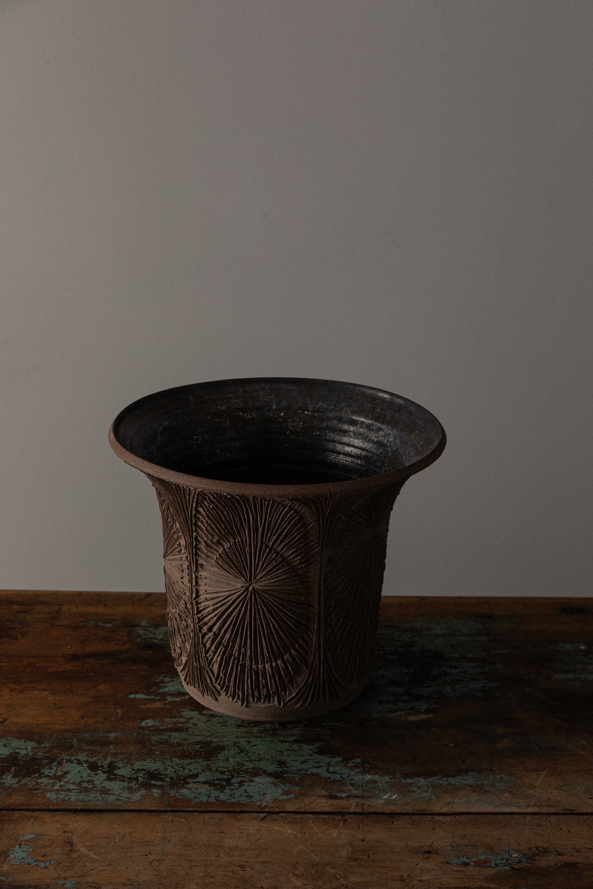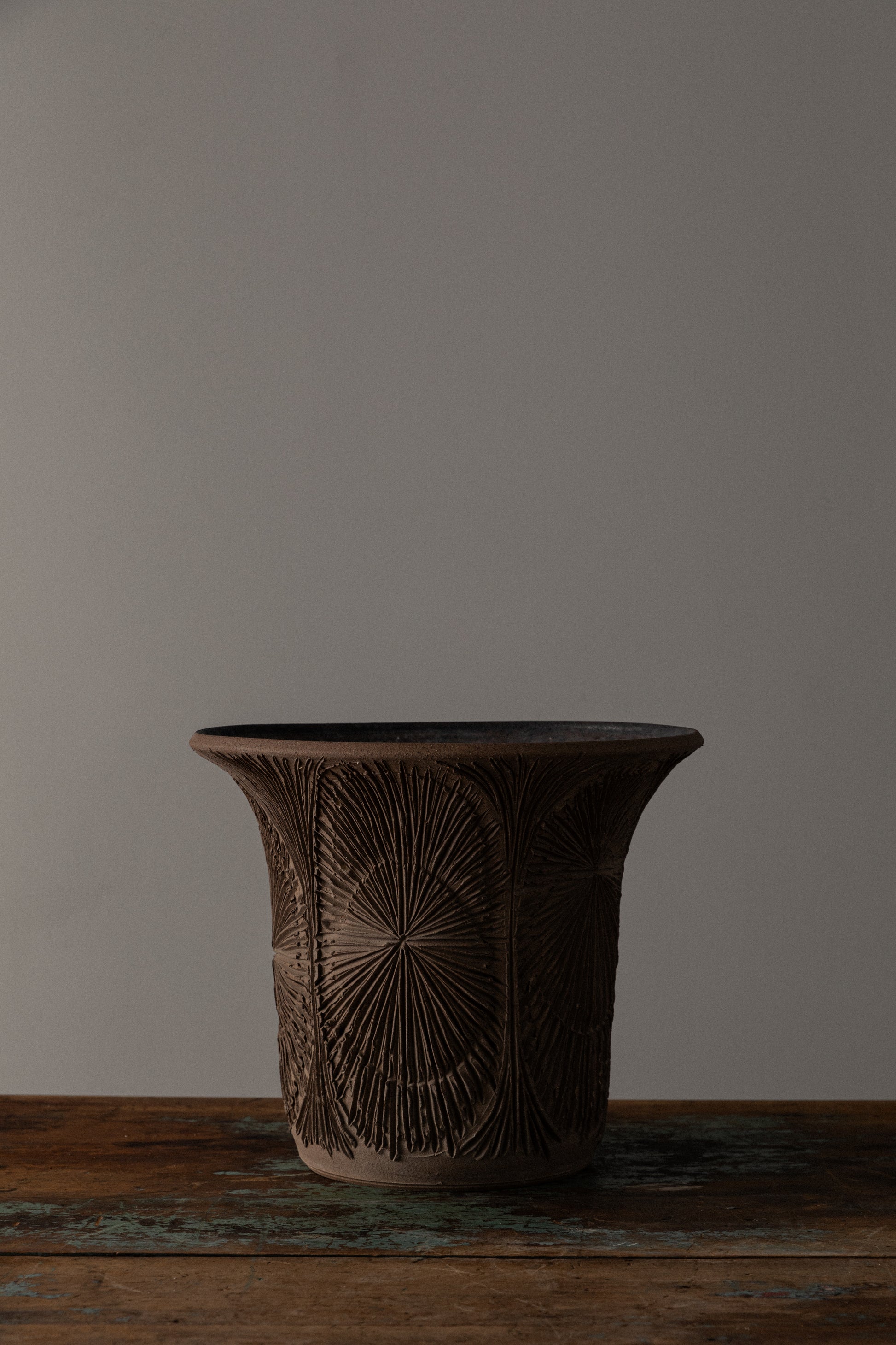 The "Sunburst" Bell Planter by David Cressey & Robert Maxwell for Earthgender is a quintessential mid-century modern piece. The flared bell shape offers generous space for planting, making it ideal for indoor or outdoor use.