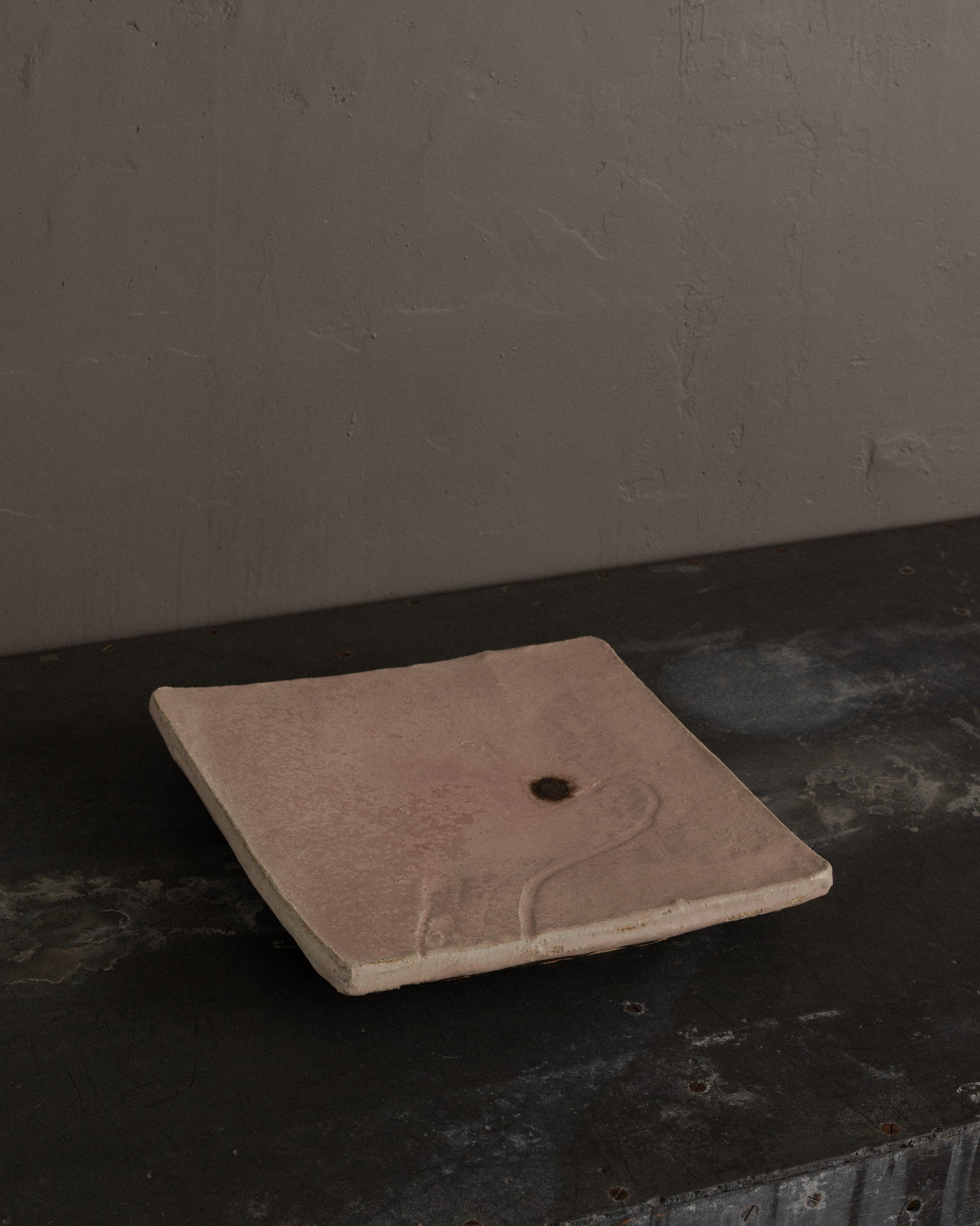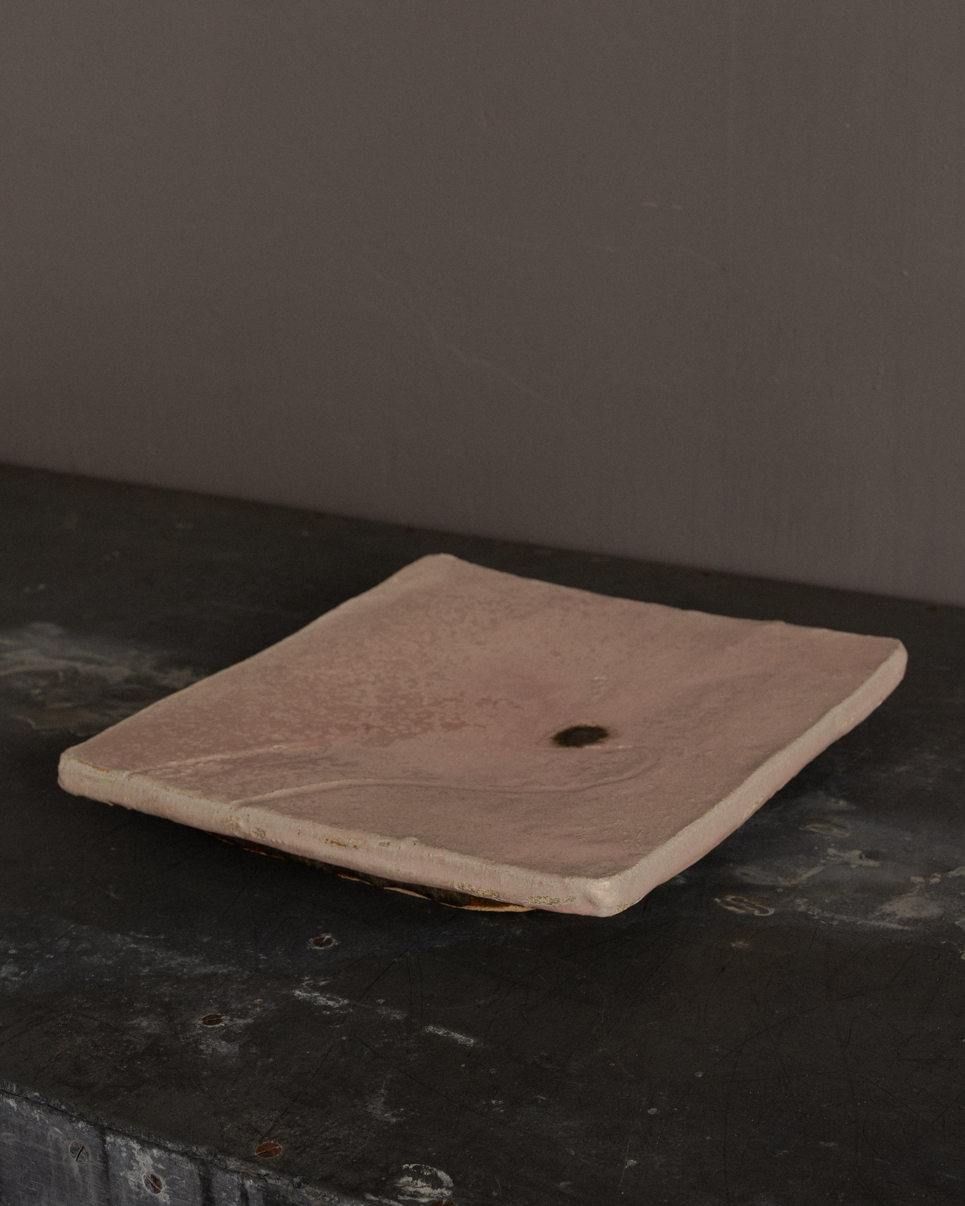 This contemporary square ceramic piece by Jody Baral features a soft blush-pink glaze with subtle tonal variation and a naturally mottled, crystalline surface. A single darker inclusion near the center adds a quiet focal point, emphasizing the materiality and unpredictability of the firing process.