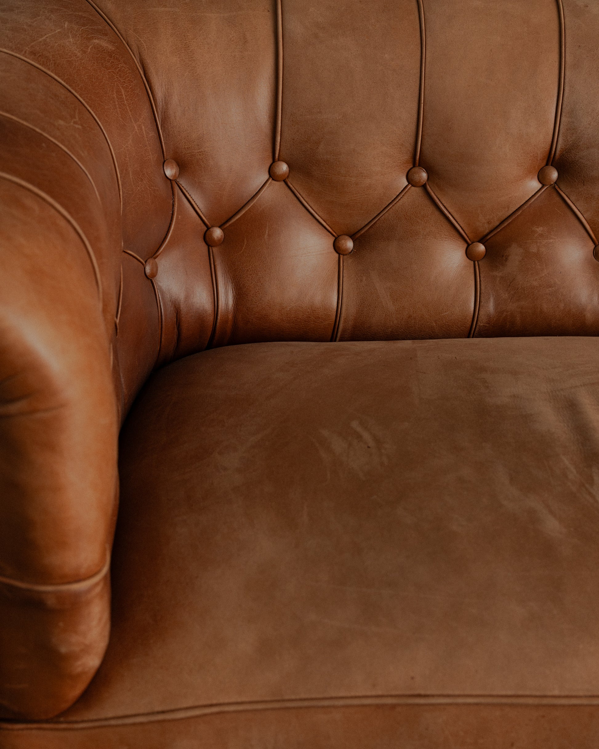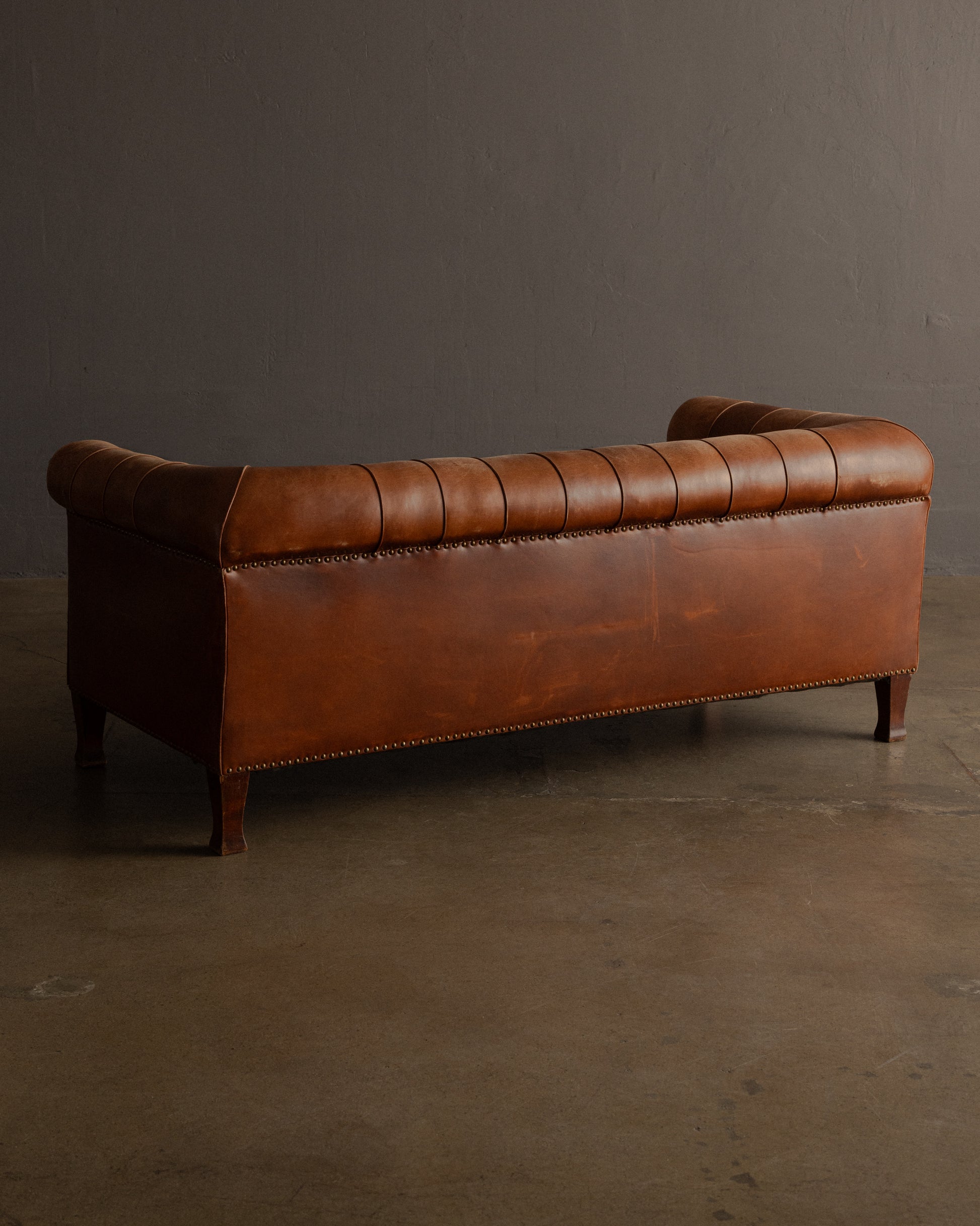 A beautifully aged vintage leather sofa featuring classic tufted detailing and gracious rolled arms. Crafted in rich, warm leather, this piece displays a stunning natural patina on solid wood legs.