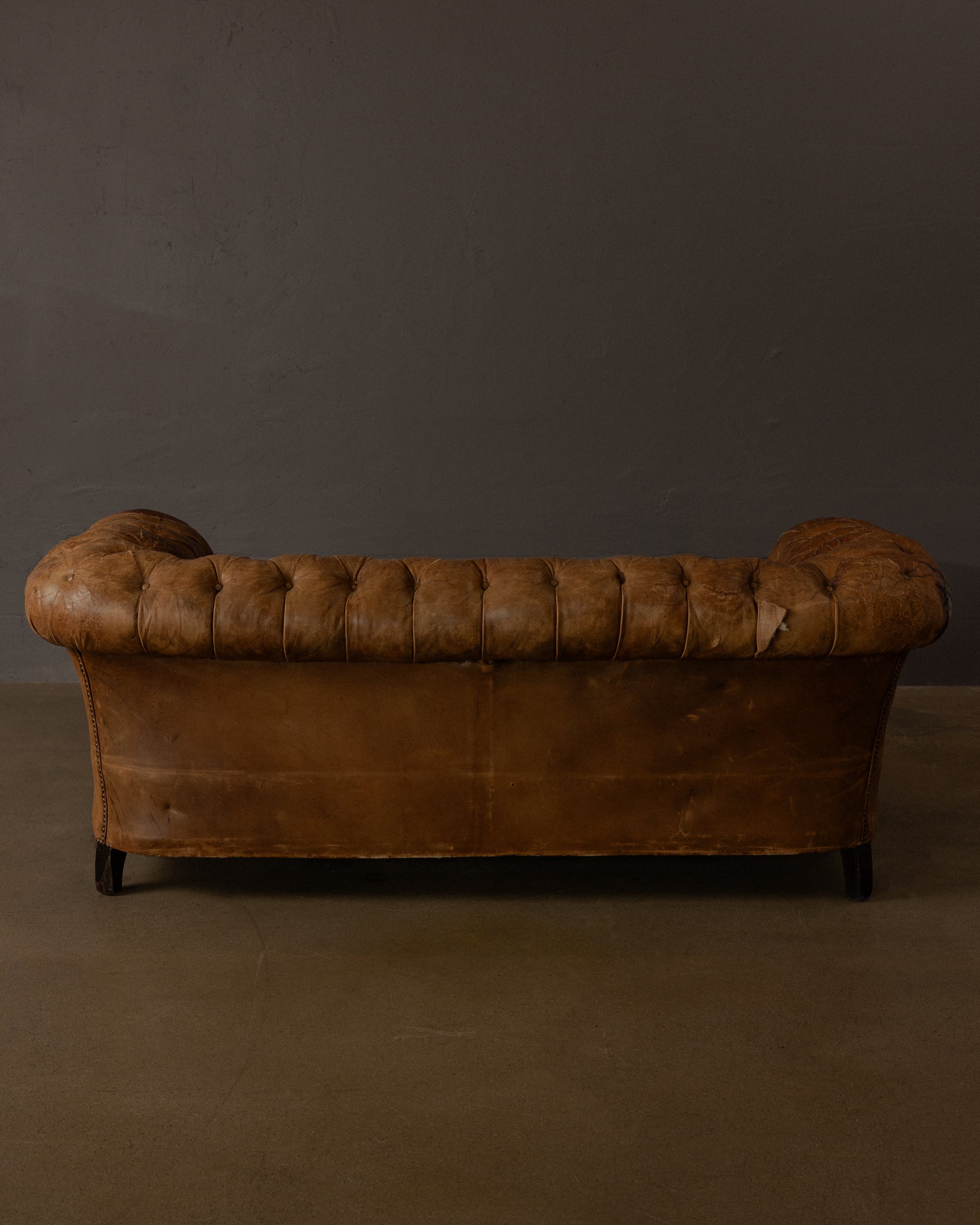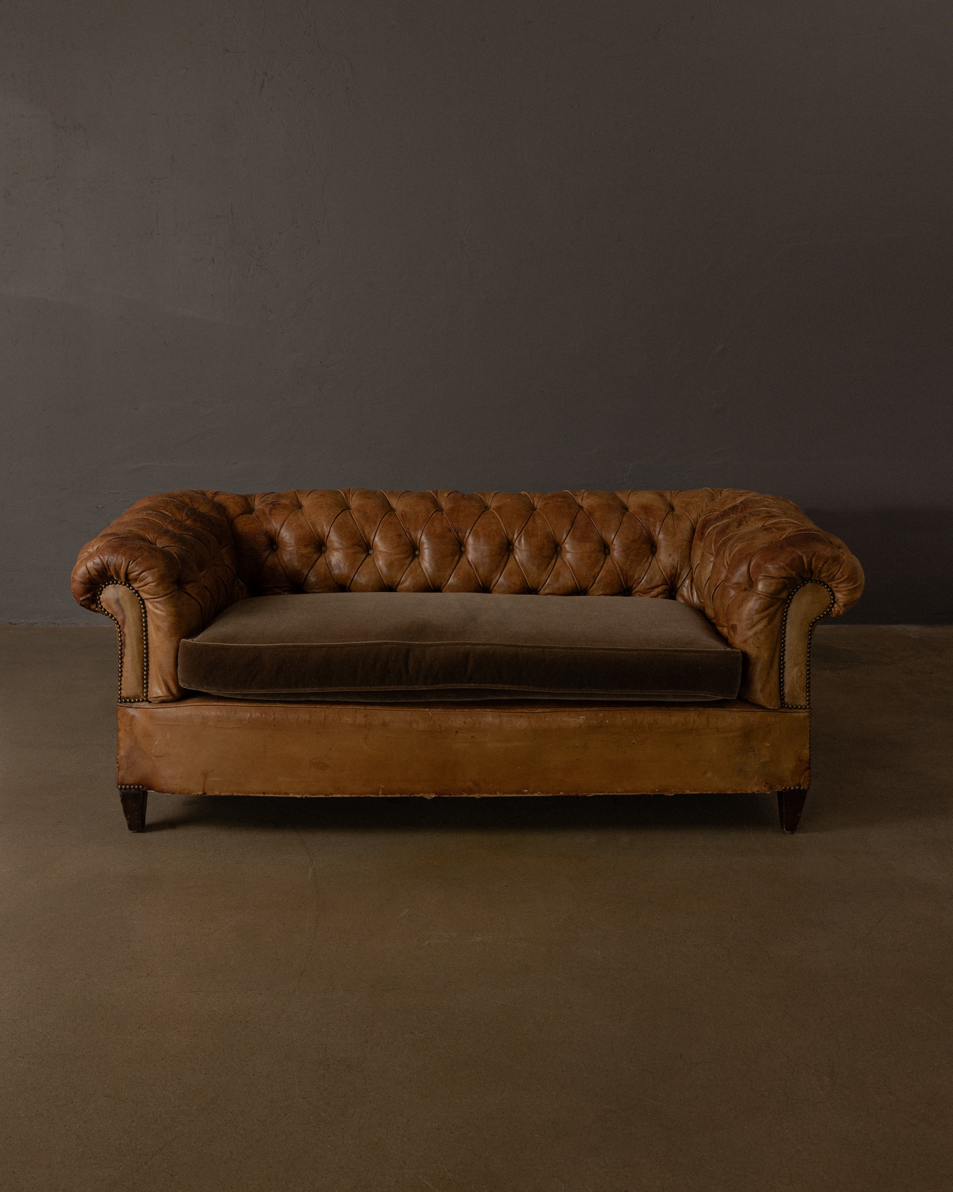 This vintage sofa features a fully tufted back and arms with hand-applied brass nailhead trim, paired with a single plush velvet seat cushion for contrast and comfort. Elegant rolled arms and tapered wooden feet complete the timeless silhouette.